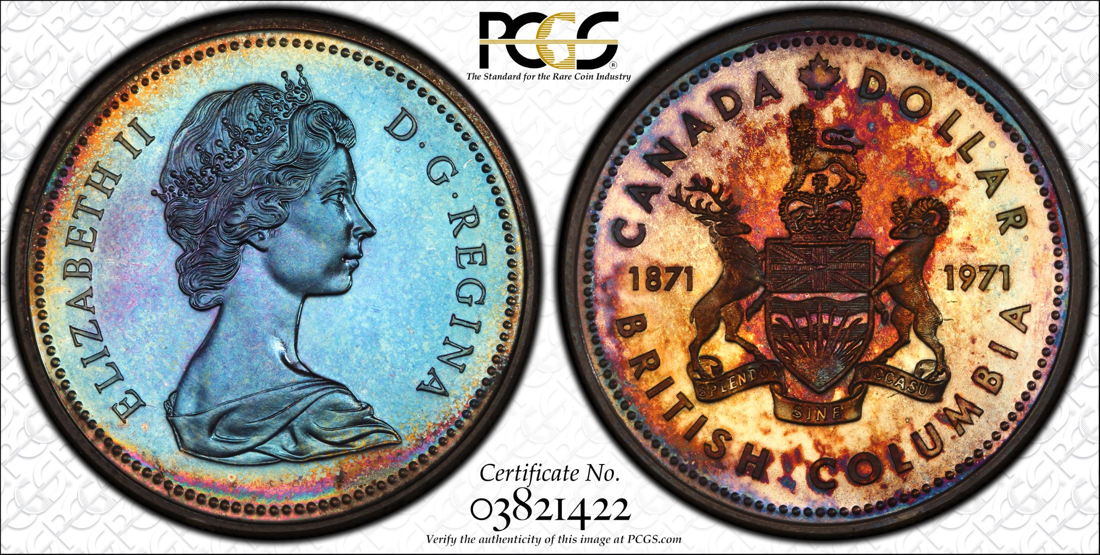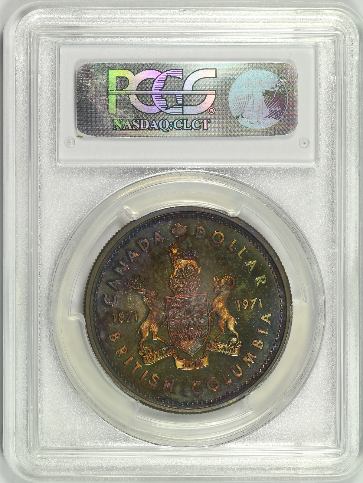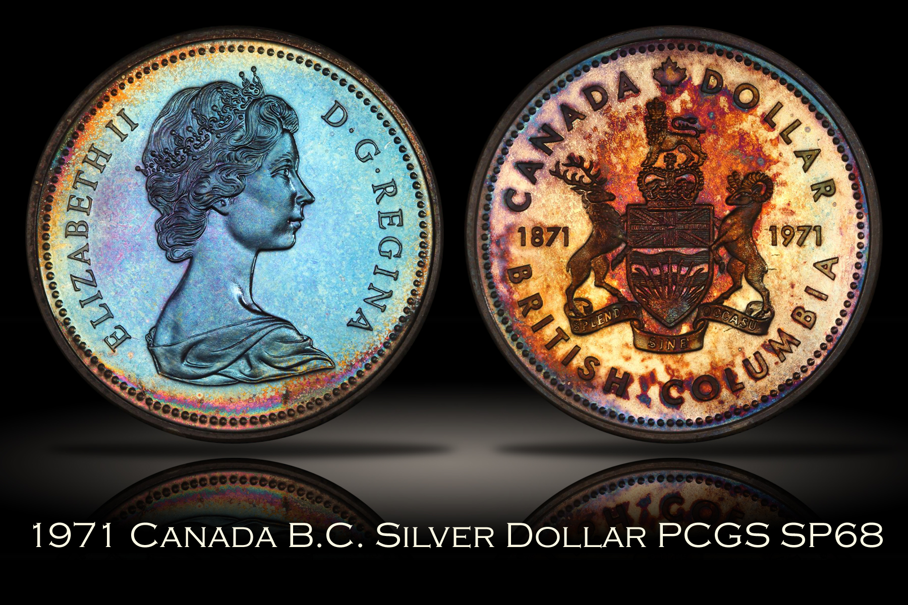 The 1971 Canada British Columbia Silver Dollar is composed of 50% fine silver with an actual silver weight of 0.375 ounces and features a proof-like finish. The obverse depicts a re-engraved version of the "Mature Head" Queen Elizabeth II which shows considerable detail. The reverse design of the is based on the provincial coat of arms of British Columbia and features the dual date 1871-1971 as this coin commemorates the 100th anniversary of British Columbia. This example of the 1971 Canada British Columbia Silver Dollar has been graded SP68 by PCGS. A TrueView photo was taken by PCGS which captures the beauty of this coin in the best light. When tilted into direct light, the beautiful toning of this piece comes alive as shown in the TrueView photo. Of course, the coin takes a different look when tilted away from direct light as seen in the full slab shots provided. The obverse is wonderfully toned is a beautiful medium blue color with a narrow band of vibrant rainbow colors near parts of the rim. The reverse of the coin is completely toned in mostly pink, red and orange colors but the toning pattern is slightly irregular. |