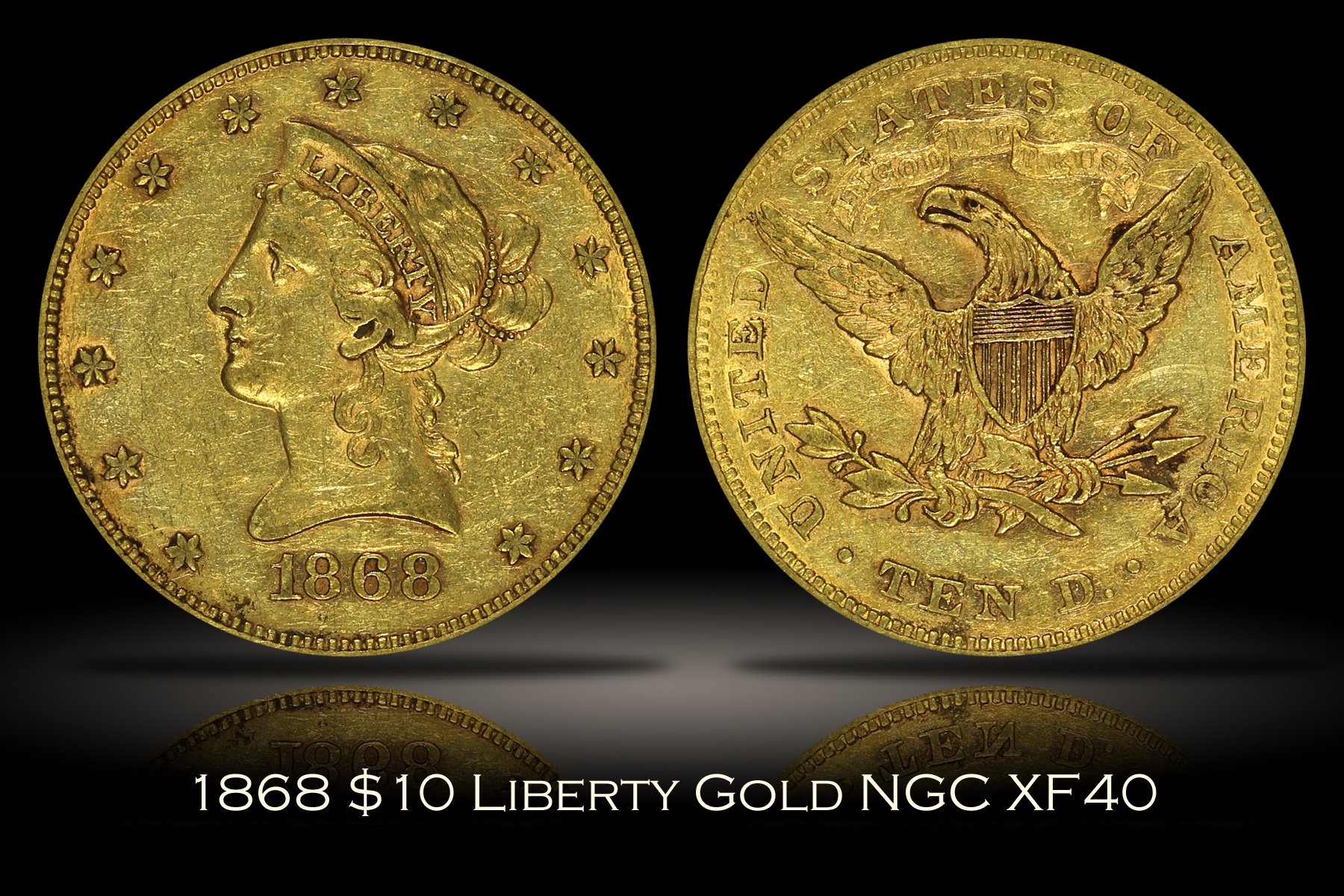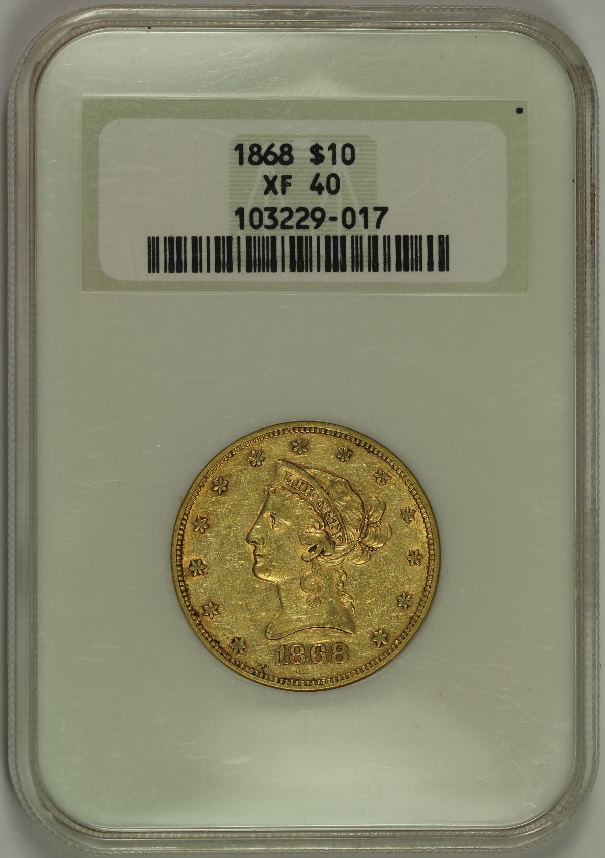 | Here is an 1868 $10 Liberty Gold Eagle which has been graded XF40 by NGC and is in an older style NGC "fatty" holder which is slightly thicker than the current style of holders. This example shows light circulation wear on the high points of the design and many small marks from circulation in the open fields, but none of which are overly distracting. The coin does have a slightly dark appearance to it, though the original mint luster of the coin does pop through. With a mintage of only 10,630 coins, the 1868 gold eagle is rare in any grade and this is a pleasing overall example. |
