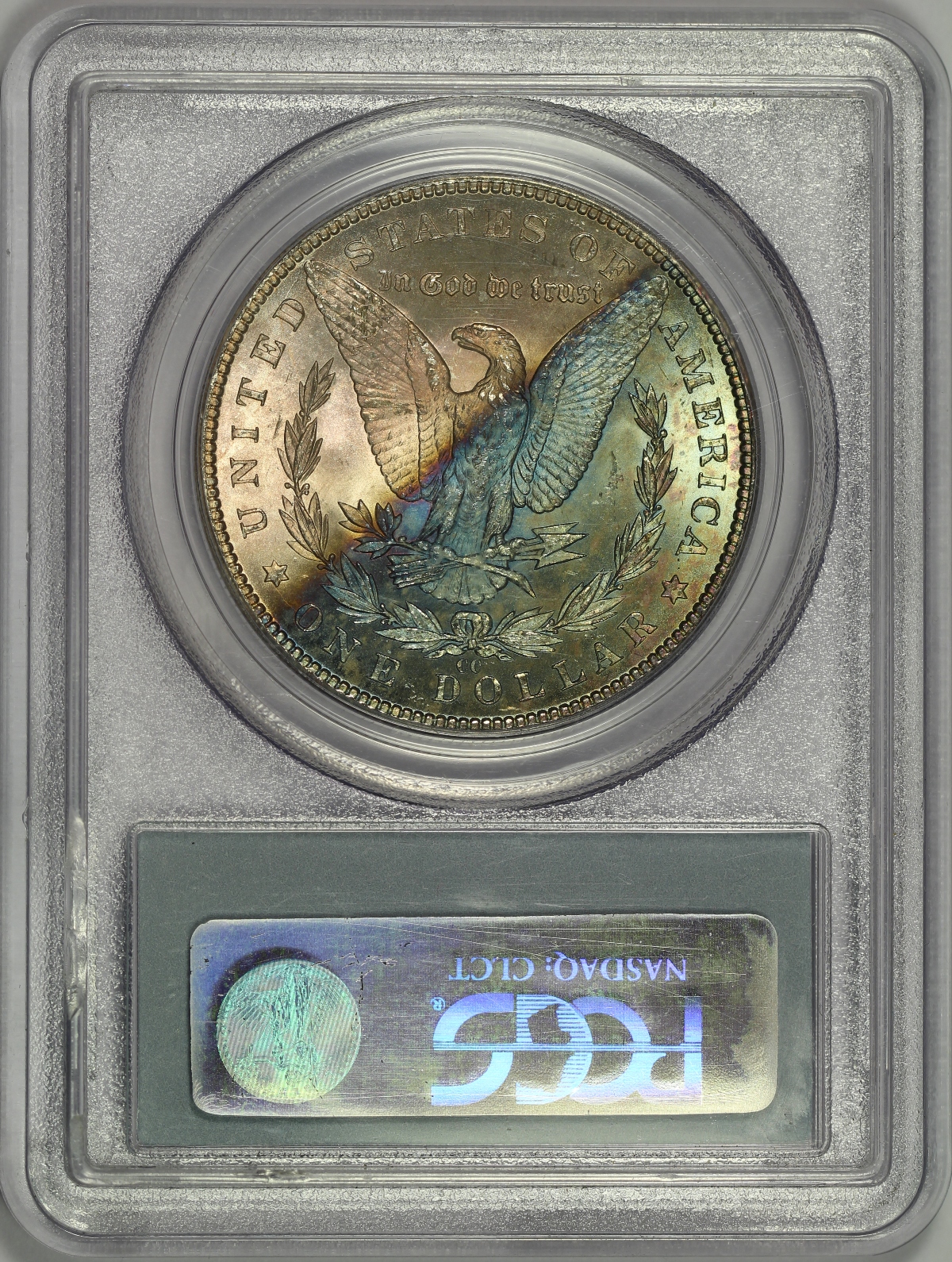 | Here is an 1884-CC Morgan Silver Dollar which has been graded MS64 by PCGS. The coin has also been certified by CAC as being solid for the assigned grade. The PCGS label indicates the coin was part of the GSA Hoard, but as you can see the coin was freed from the original GSA black holder and is now in a PCGS slab. The obverse of the coin is bright white and has strong mint luster. The reverse has spectacular toning which covers just over half of the surface with a mostly blue green color. A couple of marks in the obverse fields are likely what kept this coin from grading higher. A TrueView photo was taken by PCGS which captures the beauty of this coin in the best light. Overall, this is a neat Carson City Morgan Silver Dollar with interesting reverse toning. |