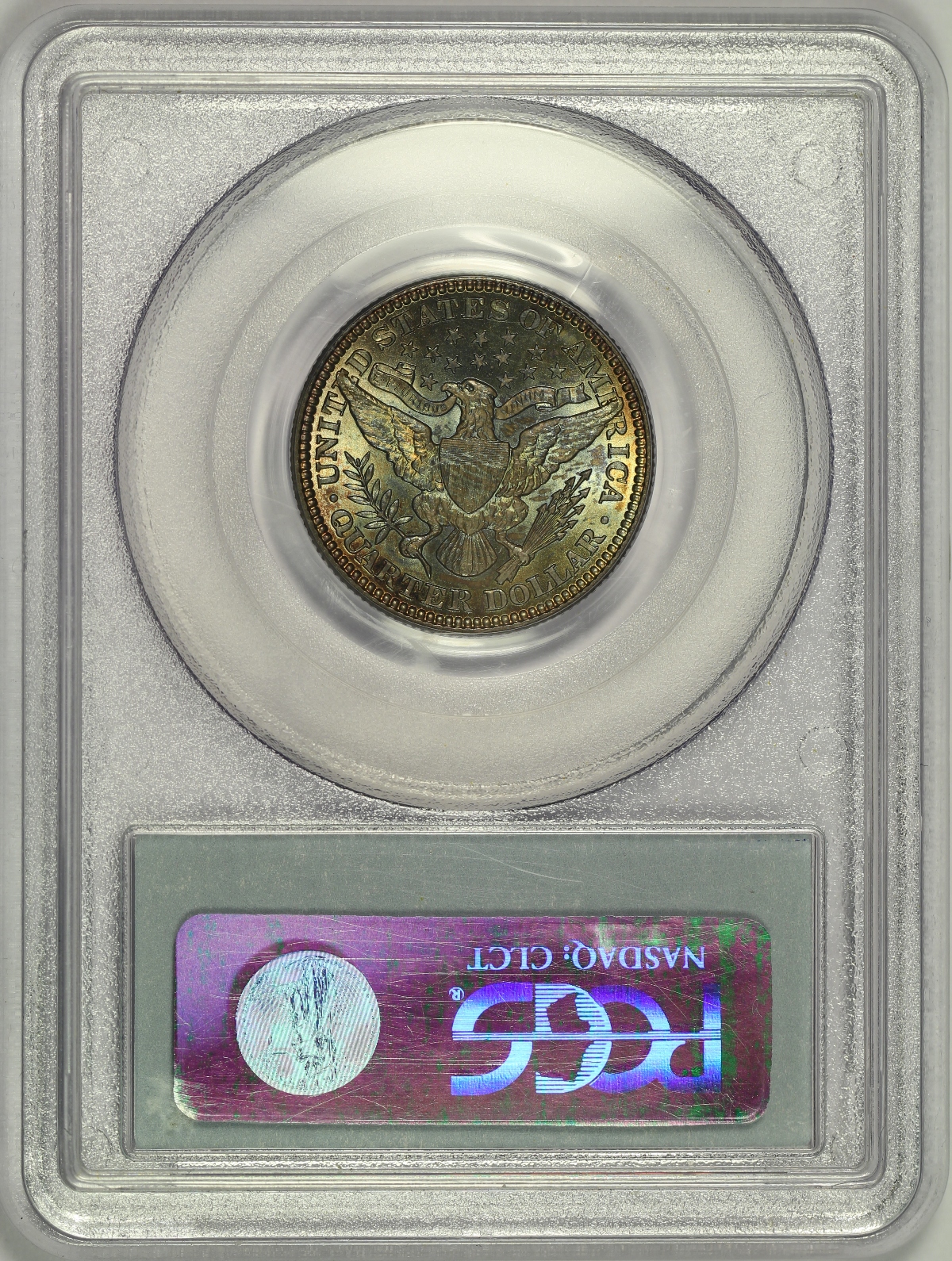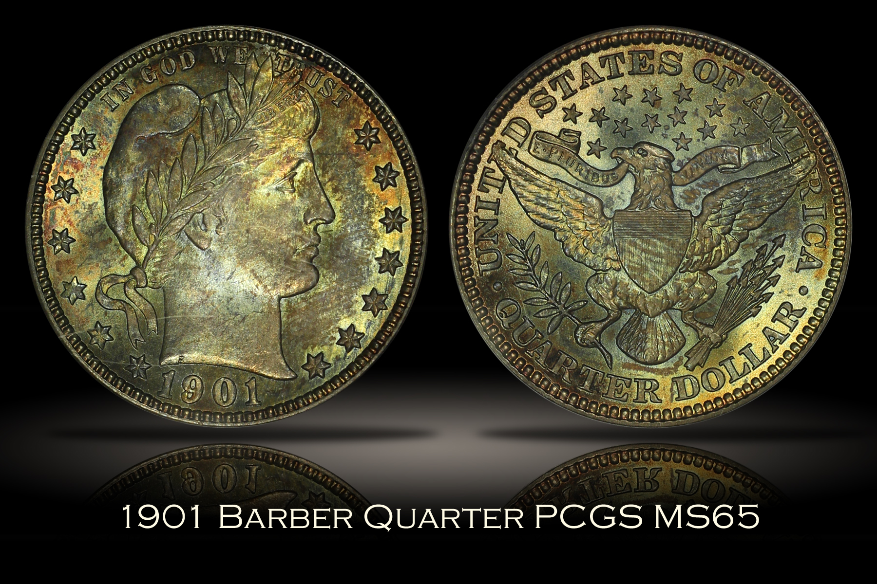 This 1901 Barber Quarter Dollar has been graded MS65 by PCGS. This gem quarter has very strong original mint luster and is attractively toned on both sides. The toning on each side covers the coin with a mostly golden and light blue color, but some hints of other colors can be found under a close inspection. The coin does have a few light marks and hits that can been seen under magnification, but when viewed in hand these issues are well masked by the toning and luster. A wonderfully eye appealing gem Barber Quarter. |