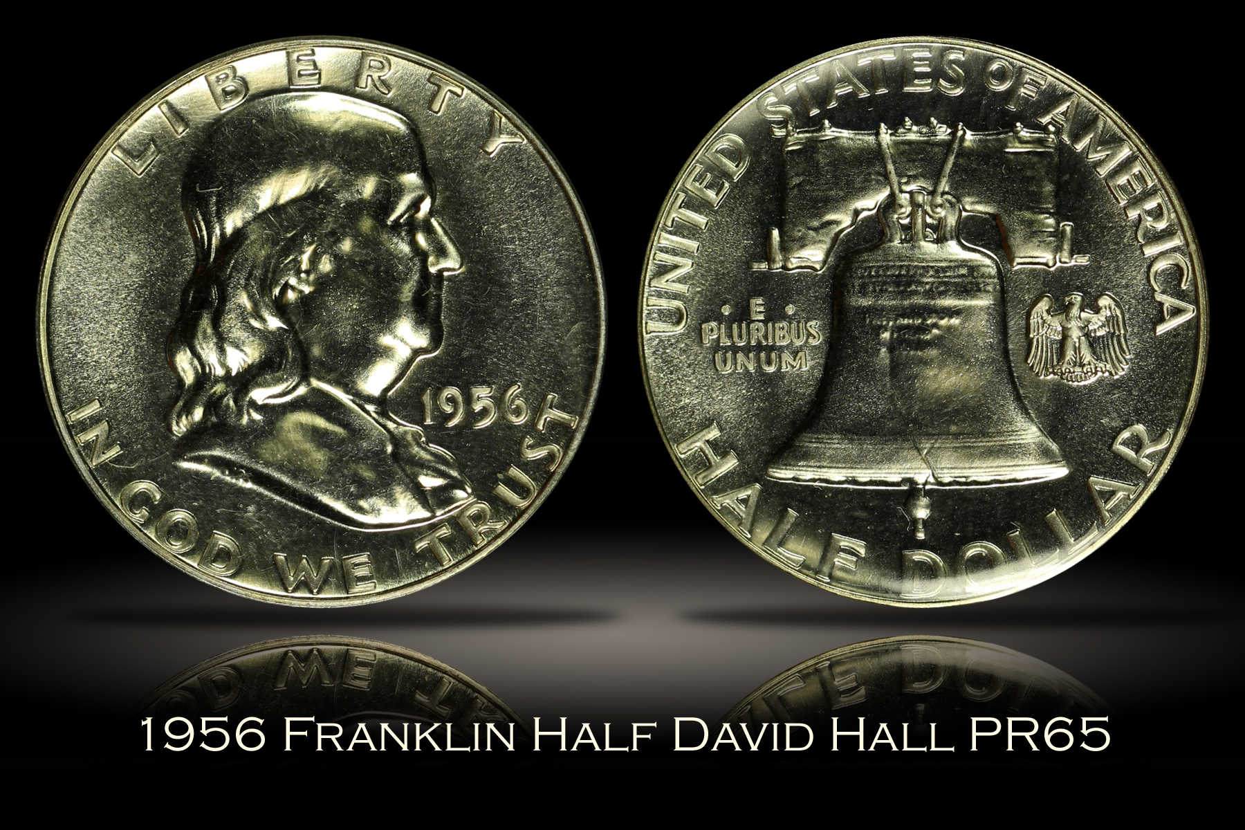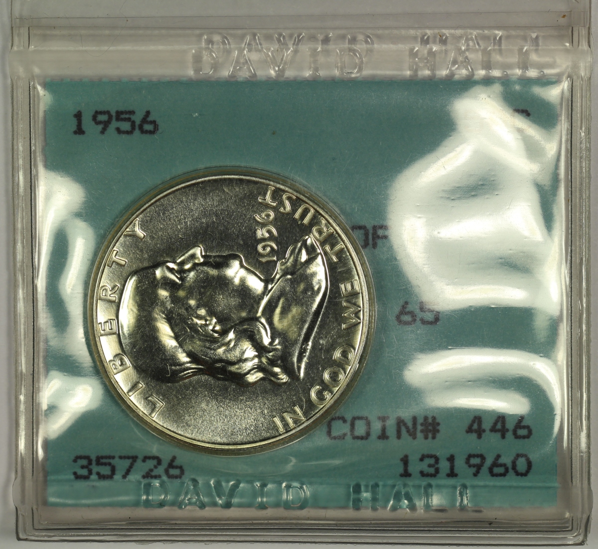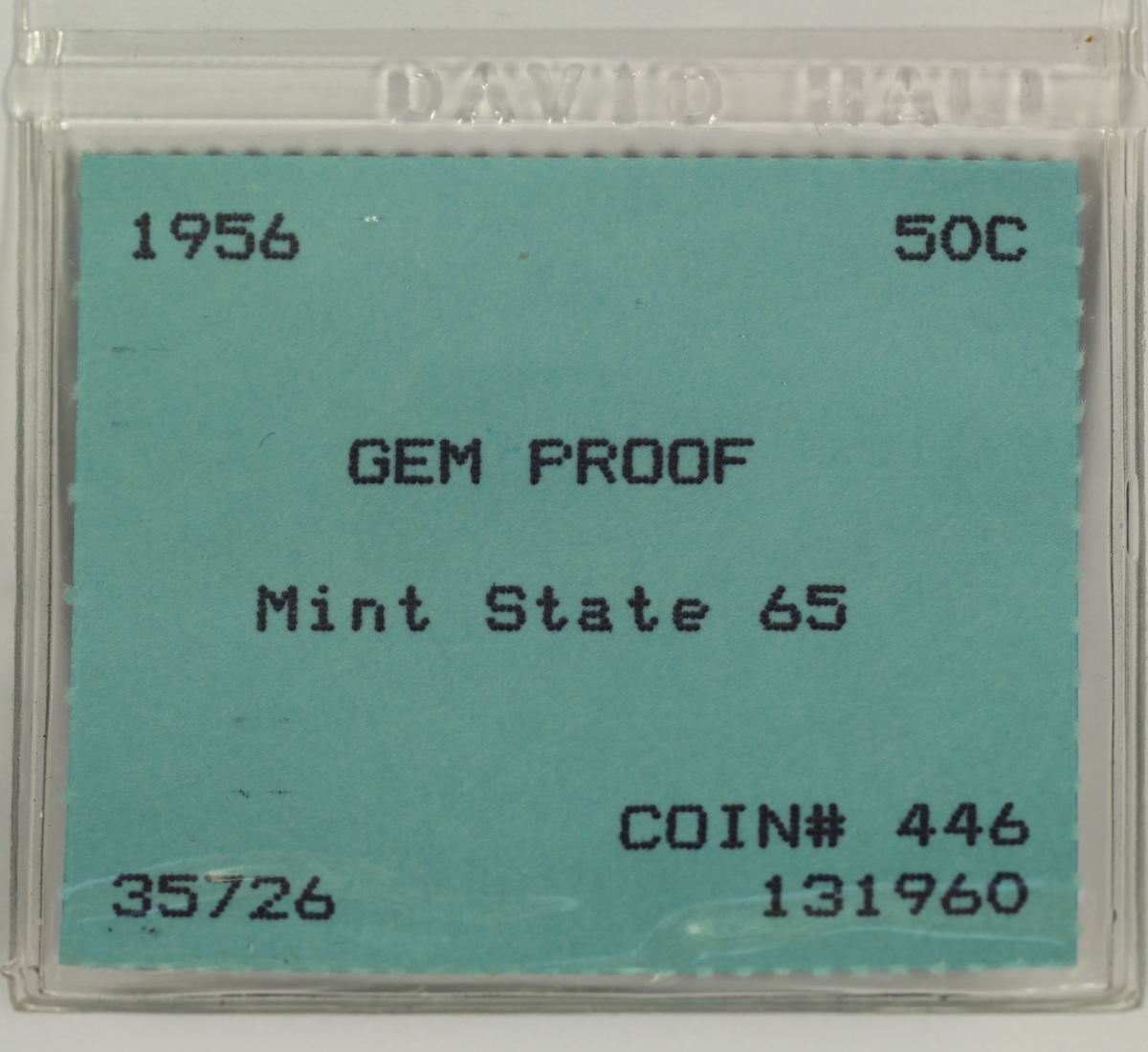 | This 1956 Proof Franklin Half Dollar has been certified in an old holder from David Hall’s Numismatic Investment Group and graded Gem Proof Mint State 65. These sealed flips preceded PCGS and were graded in the early to mid-1980s; some collectors refer to them as generation 0.1 PCGS holders since they pre-date PCGS which started up by David Hall in 1986. In a June 2003 post on the Collectors Universe forum PCGS founder David Hall stated the following regarding these David Hall’s Numismatic Investment Group flips: