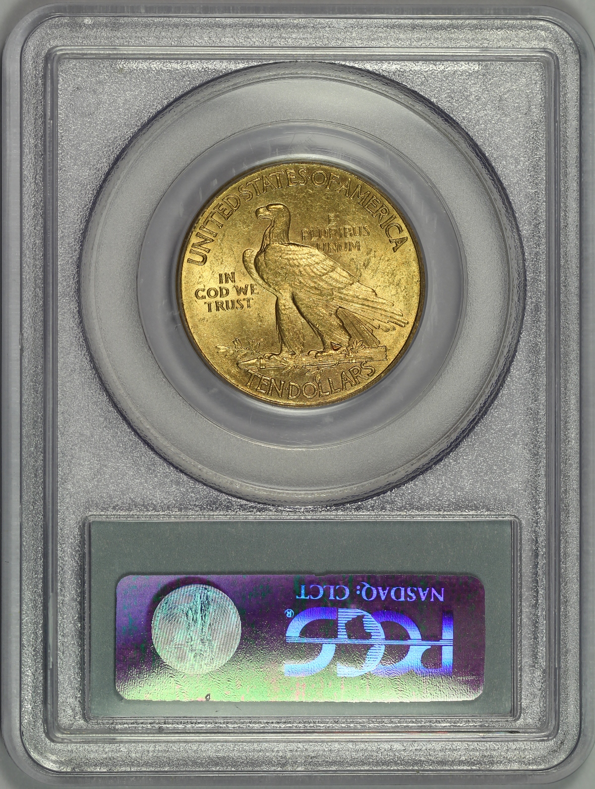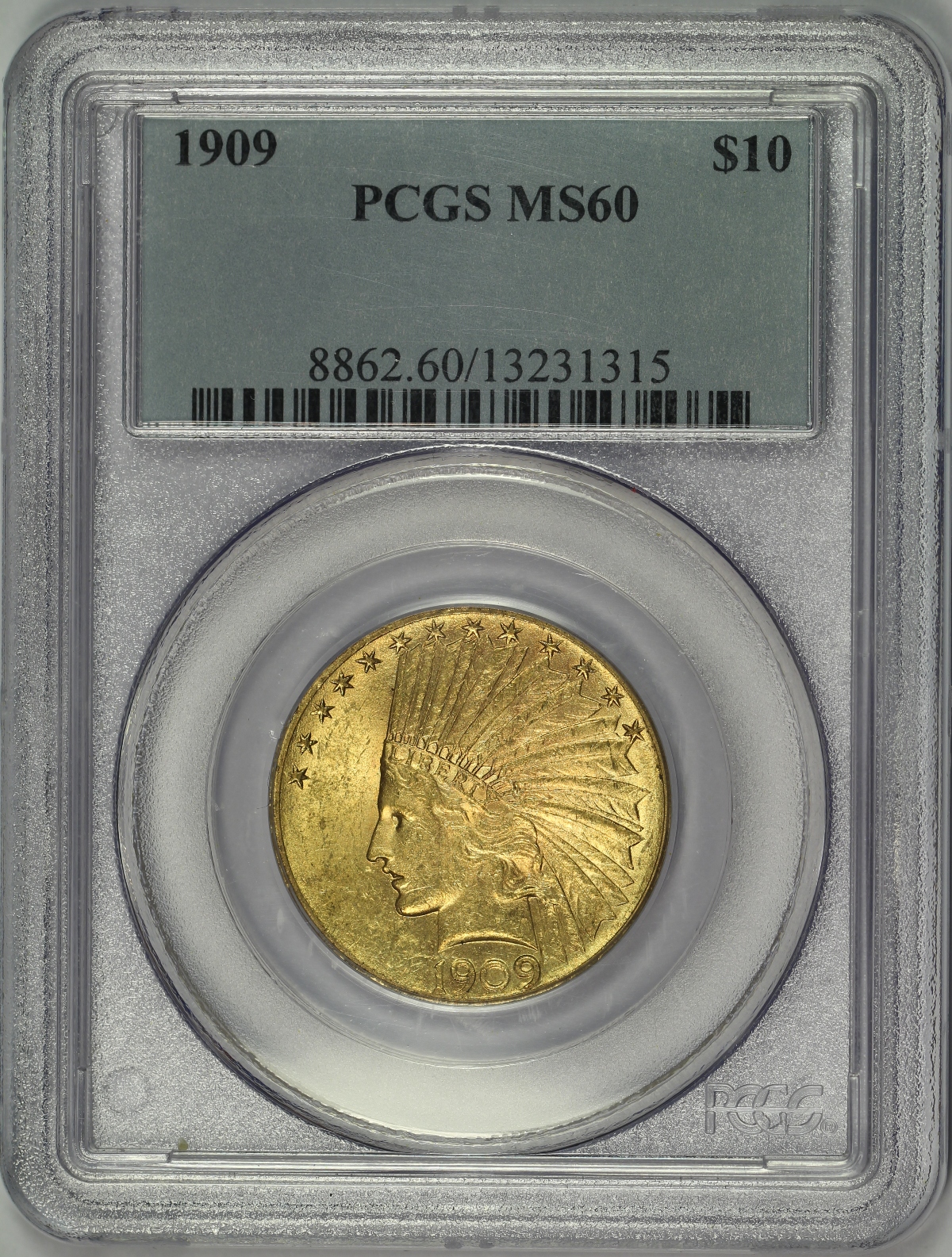 | Although most collectors feel the $20 St. Gaudens Gold Double Eagle is the most beautiful of all U.S. coins, I like the $10 Indian Gold Eagle by St. Gaudens a little more. I have just always like the Indian design of the obverse and the eagle on the reverse, but I especially like the edge of the coin with the raised stars instead of reeding. This 1909 $10 Indian Gold Eagle has been graded MS60 by PCGS. Unfortunately, my favorite feature of the coin, the raised stars on the edge, is hidden by the PCGS holder. Nevertheless, the coin is a nice mint state example of the type with decent original mint luster and nice medium gold color. There are many small hits in the open fields of the coin and one larger mark on the chin of the Liberty on the obverse which likely accounts for the MS60 grade. Otherwise, the coin is a great example for the grade and an affordable mint state example of the $10 Indian Gold Eagle type. |