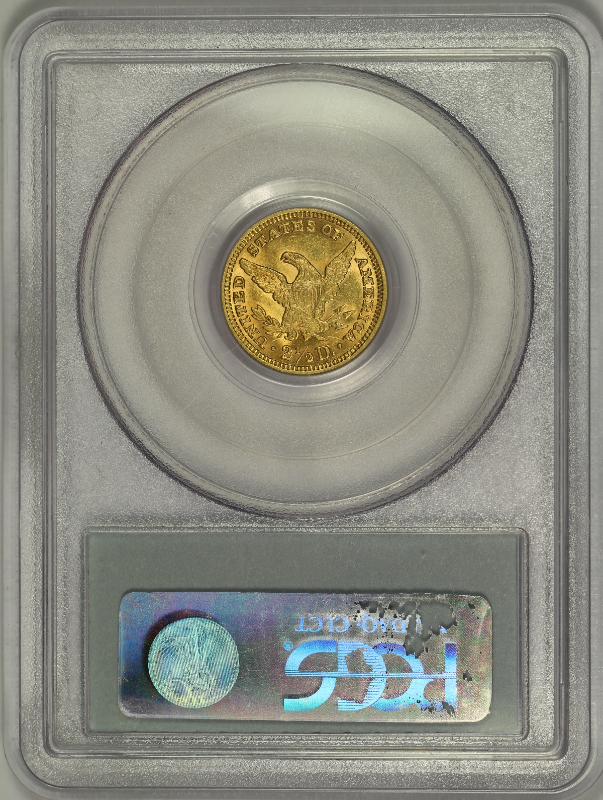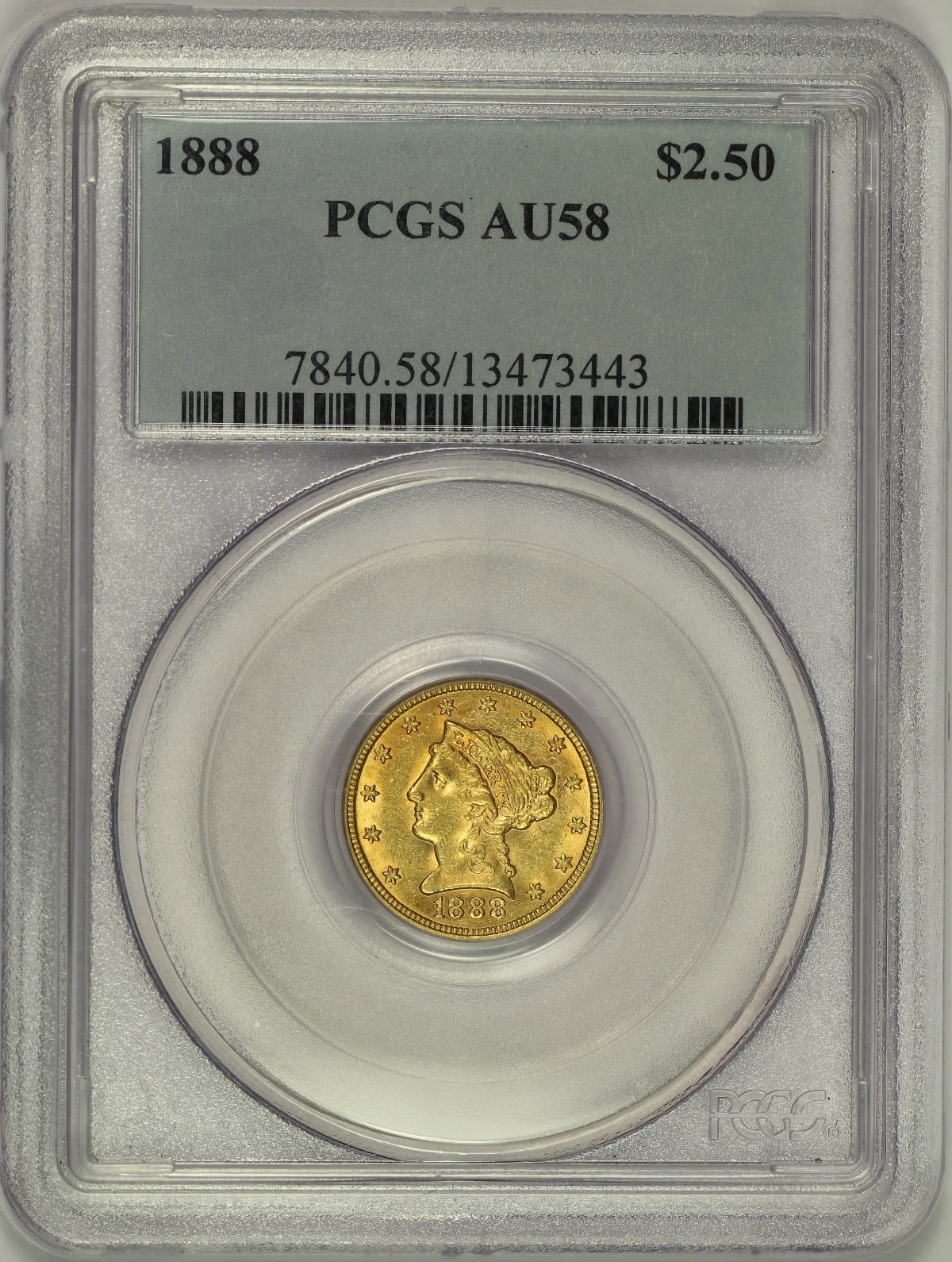 | Here is an 1888 $2.5 Liberty Gold Quarter Eagle has been graded AU58 by PCGS. The coin has really bright lustrous surfaces on both sides and has the look of a mint state piece, though there is just a hint of rub on the high point of the design that limits the technical grade of the coin. The color is a bright gold that is free of spotting or other distractions. There are several light marks and scratches, in the fields in particular, though none are major. Only 16,001 quarter eagles were minted in 1888 and this is a wonderful overall example of the date. |