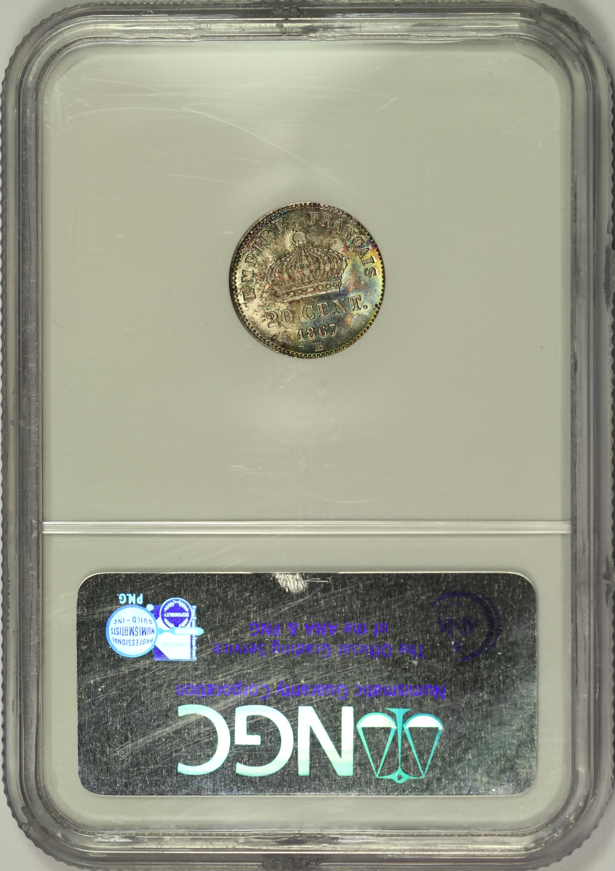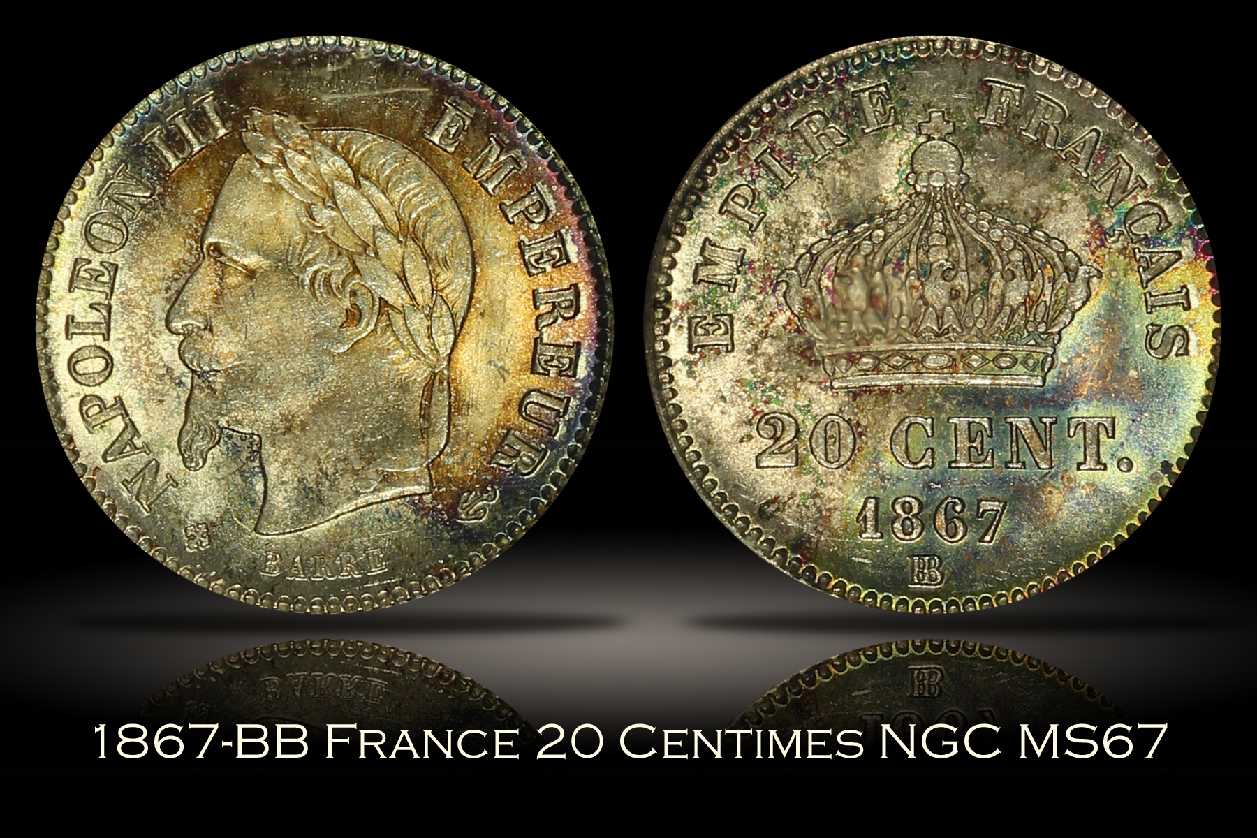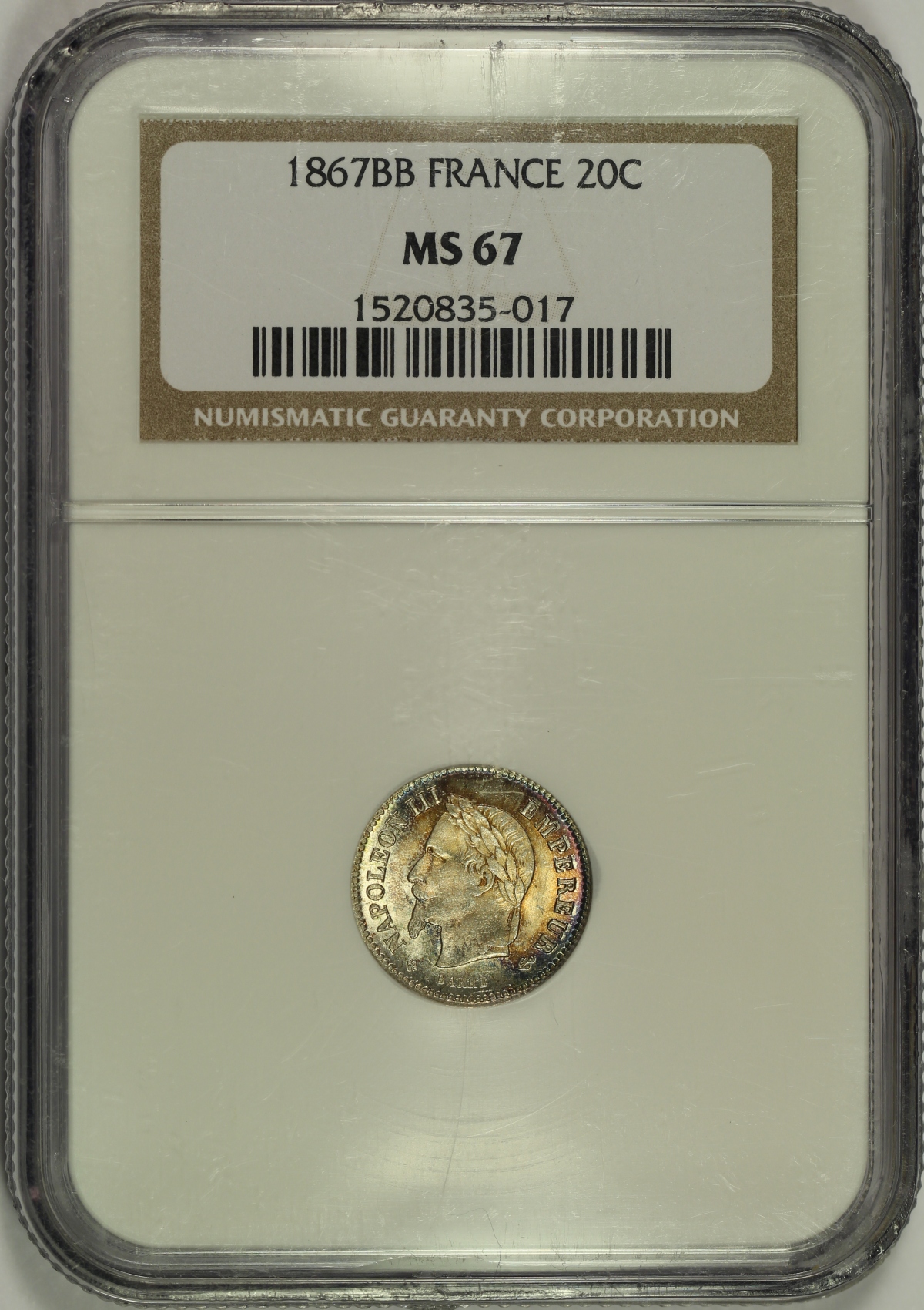 | Here is an 1867-BB France 20 Centimes which has been graded MS67 by NGC. This relatively small French silver piece is a beautiful coin. The coin is very lustrous and has attractive rainbow toning on both sides. There are just a couple of tiny marks that can be seen under a very close inspection, but in hand the coin appears to be flawless. Although graded at the MS67 level by NGC, there are actually three (3) coins that grade higher at NGC, all of which are MS68 example. That said, this is an amazing and attractive high-grade example of a French Napoleon III 20 Centimes. |