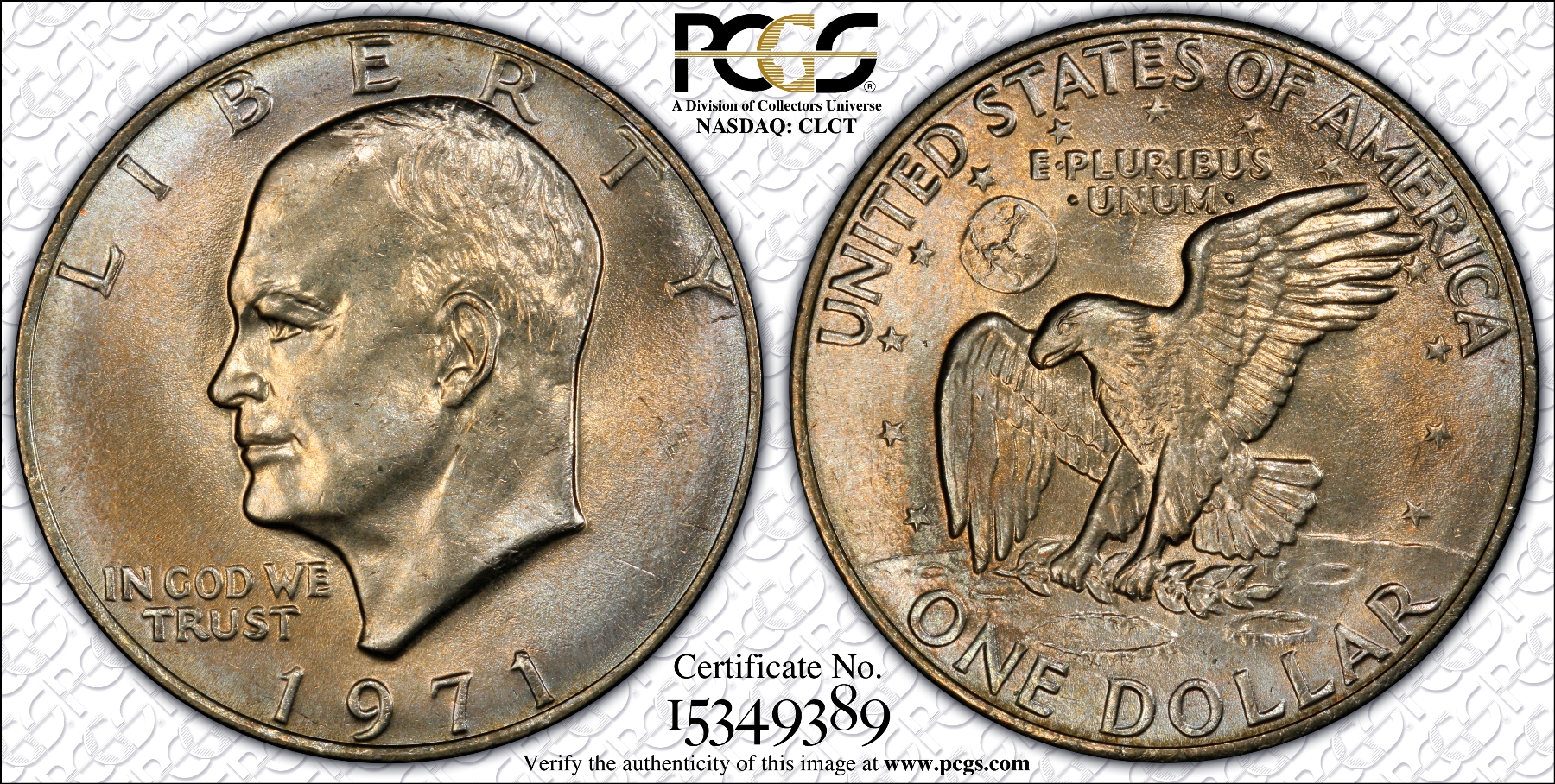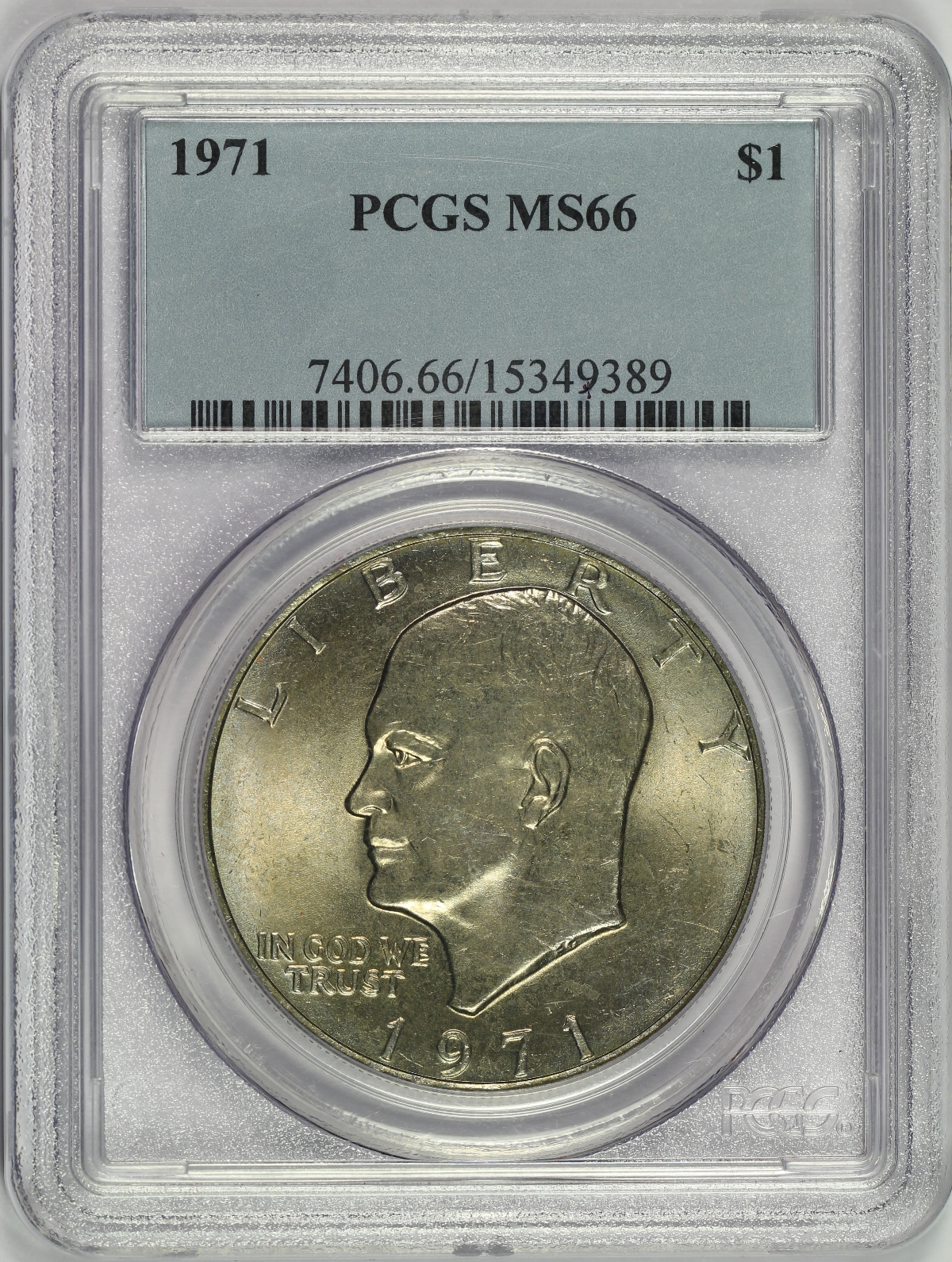 | This 1971 Eisenhower Dollar has been graded MS66 by PCGS. The coin is fully lustrous and very attractive for the date. Almost free of toning, the piece has just small amount of subtle steel blue color near some parts of the rim. Several light hits can be found on both sides of the large coin, but none are major of overly distracting. A tiny scratch between stars 12 and 13 on the reverse is also of note. A TrueView photo was taken by PCGS which captures the beauty of this coin in the best light and really shows the subtle rim toning very well.