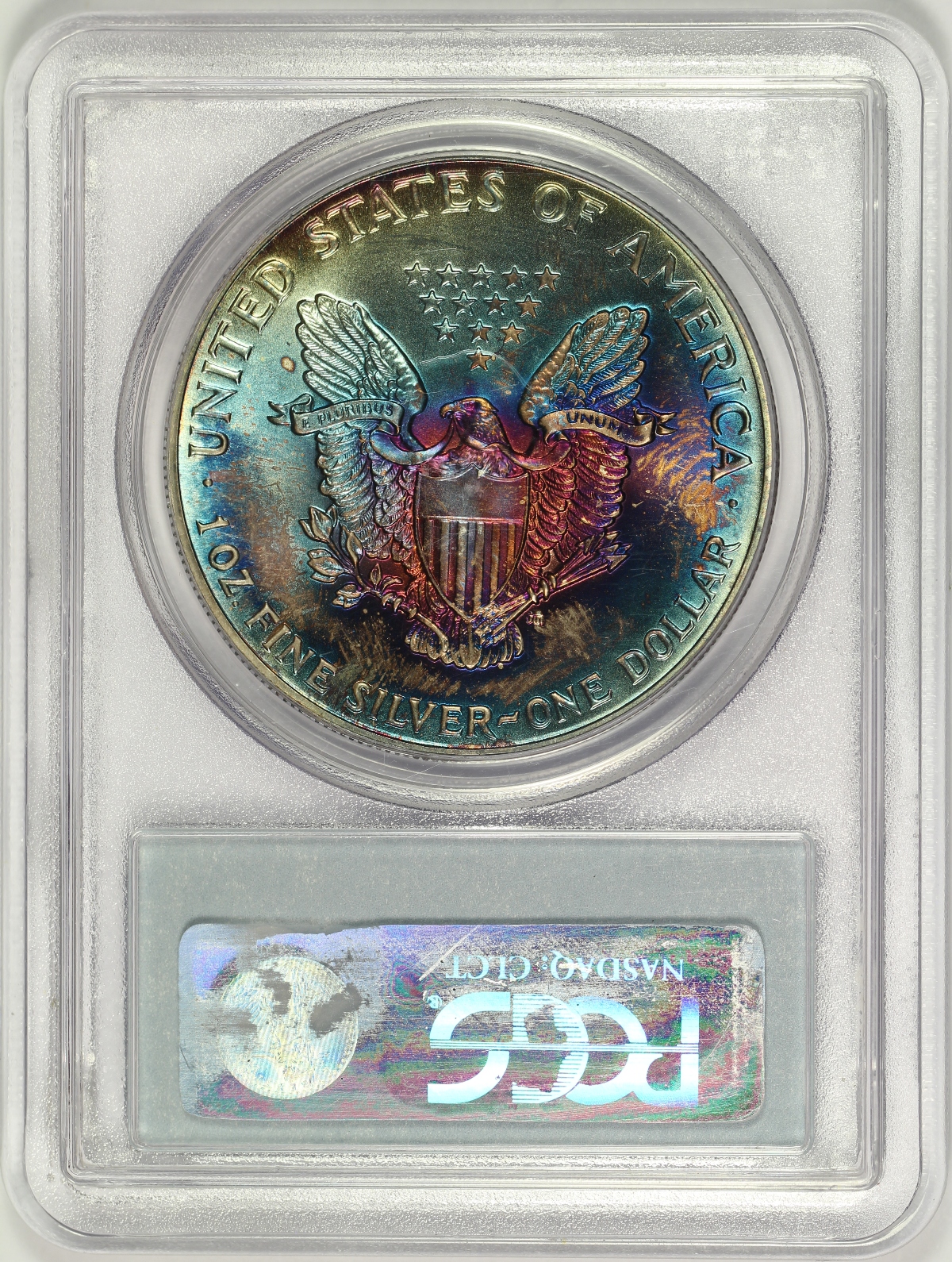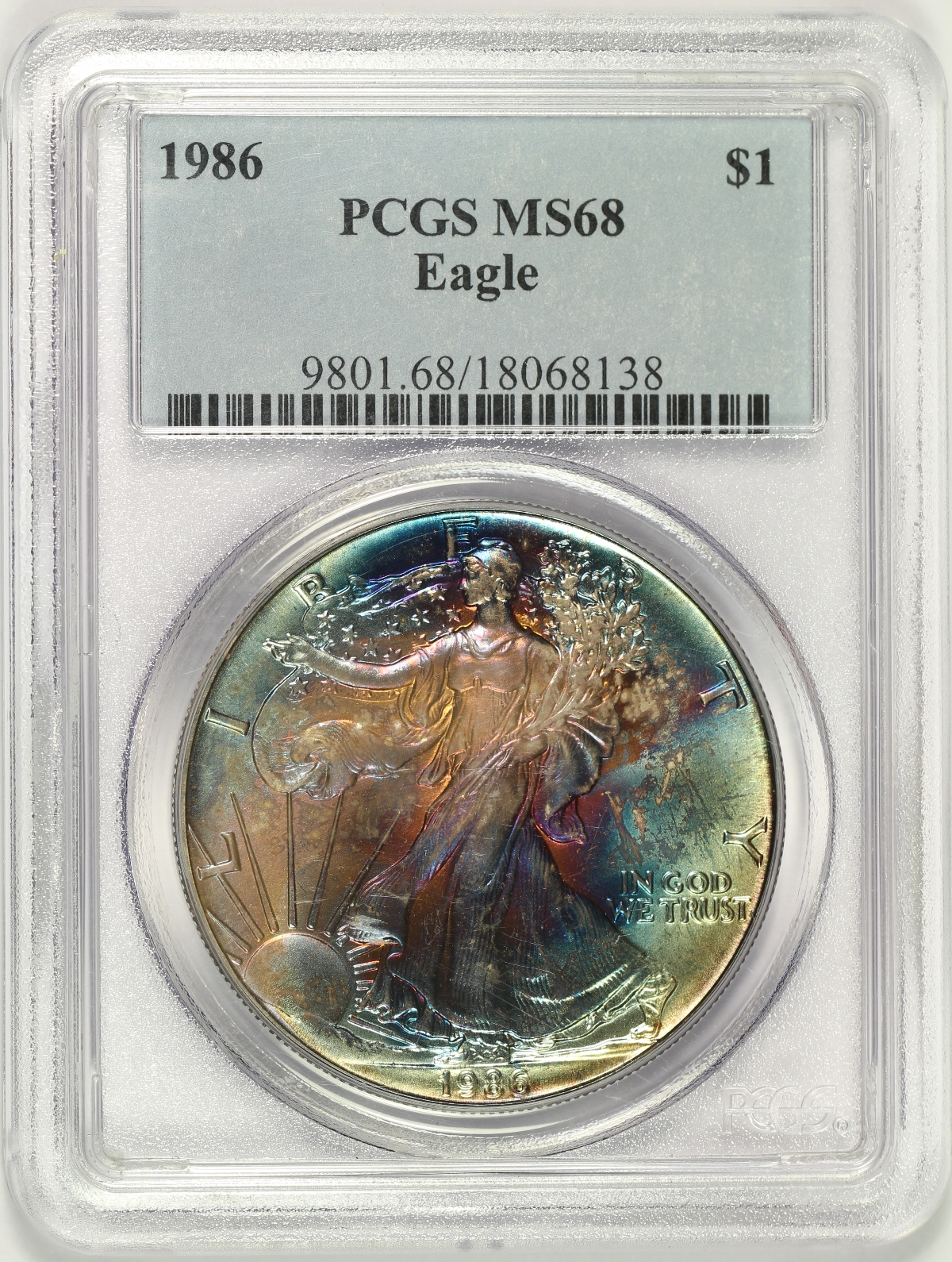 | Here is a wonderfully toned one ounce .999 fine 1986 Silver Eagle which has been graded MS68 by PCGS. The coin is fully toned on each side with vibrant blue, pink, orange and red colors. The luster of the coin remains very strong which allows the toning to really pop. Parts of the toning are slightly hazy when tilted out of a strong light, but under good lighting, the coin will appear substantially similar to the images provided. A beautiful first year of issue Silver Eagle. |
