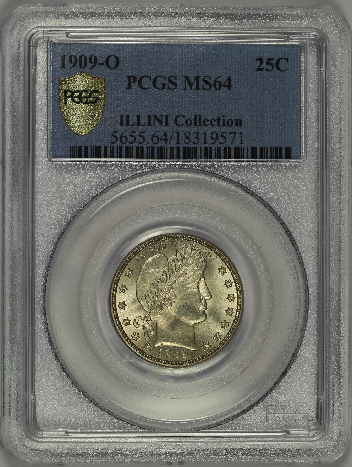 | The Barber Quarter produced during the final year of operations at the New Orleans Mint is a semi-key date in the series and a very difficult coin to find in all but the very lowest of grades. Because of the big three key-dates in the series, the 1909-O Barber Quarter is often overlooked and is considered by some to be one of the most underrated dates in the series. Not only is the date difficult to find, but once one is found it is difficult to find with a decent strike. The present example is very well struck for the date. This all white example has slightly muted luster and just a few small hits in the fields which limit the grade. Less than ten examples have been certified by PCGS in gem condition or better. |