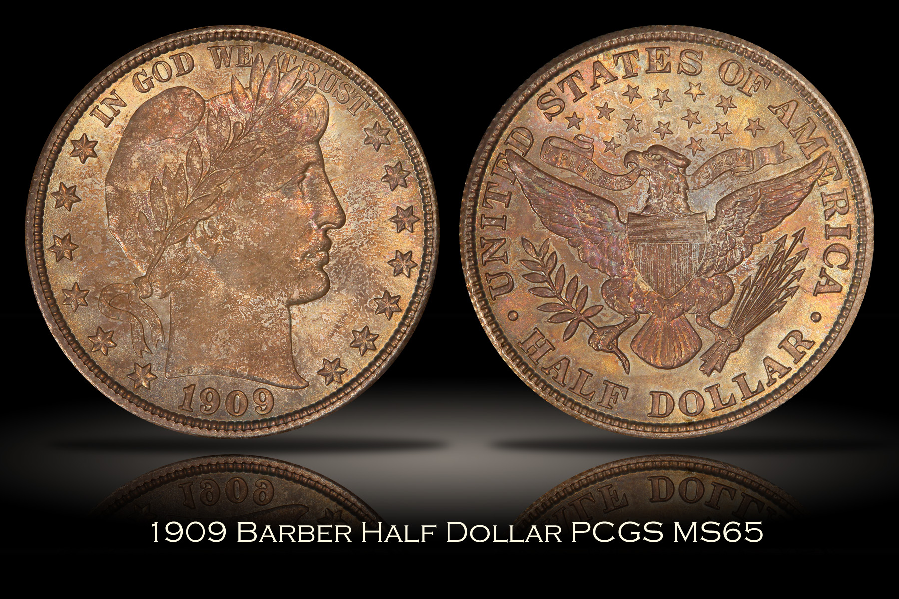 The 1909 Barber Half is one of the most available dates in the series in mint state condition. However, the coin is most frequently encountered in grades of MS64 or below; in MS65 and above, the coin is much rarer. The present example features a medley of pastel violet, greenish-yellow, and lilac patina which resides on highly lustrous surfaces. A solid strike results in excellent definition on the design elements. A few trivial marks concealed within the toning likely limit the grade. |