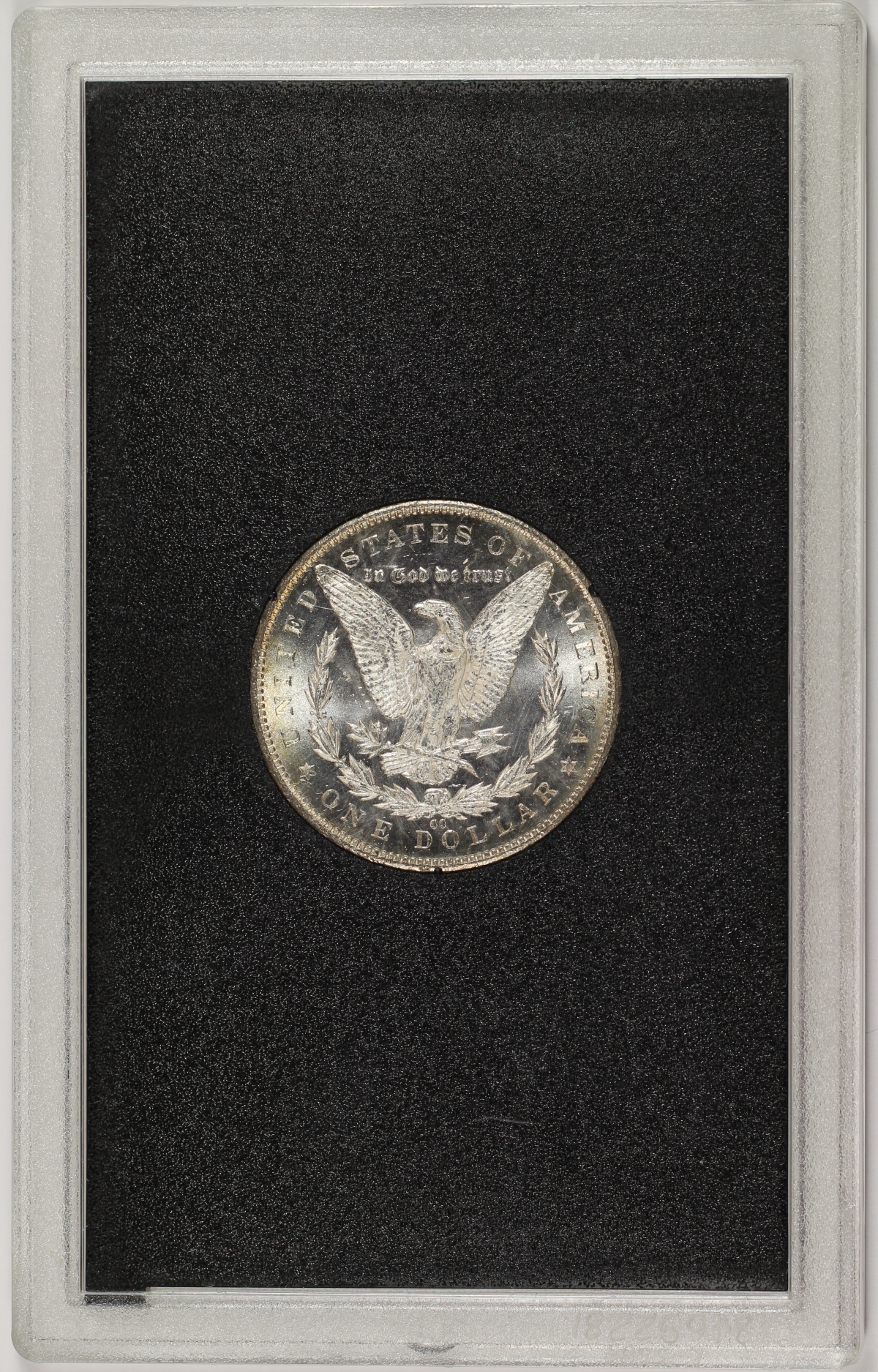 | This 1884-CC Morgan Silver Dollar is a beautiful uncirculated example still housed in the original GSA Hoard black holder. Although not independently certified by a third-party grading company, the coin certainly exhibits strong proof-like mirrored fields on both sides and the devices are quite frosty as well. Several small marks and hits are present on both sides, but more so on the obverse, which would limit the grade of the coin somewhat if it were certified. Included are the original GSA box and certificate for the coin. A better than average example of a prooflike Carson City Morgan Silver Dollar in the original GSA Hoard holder. |