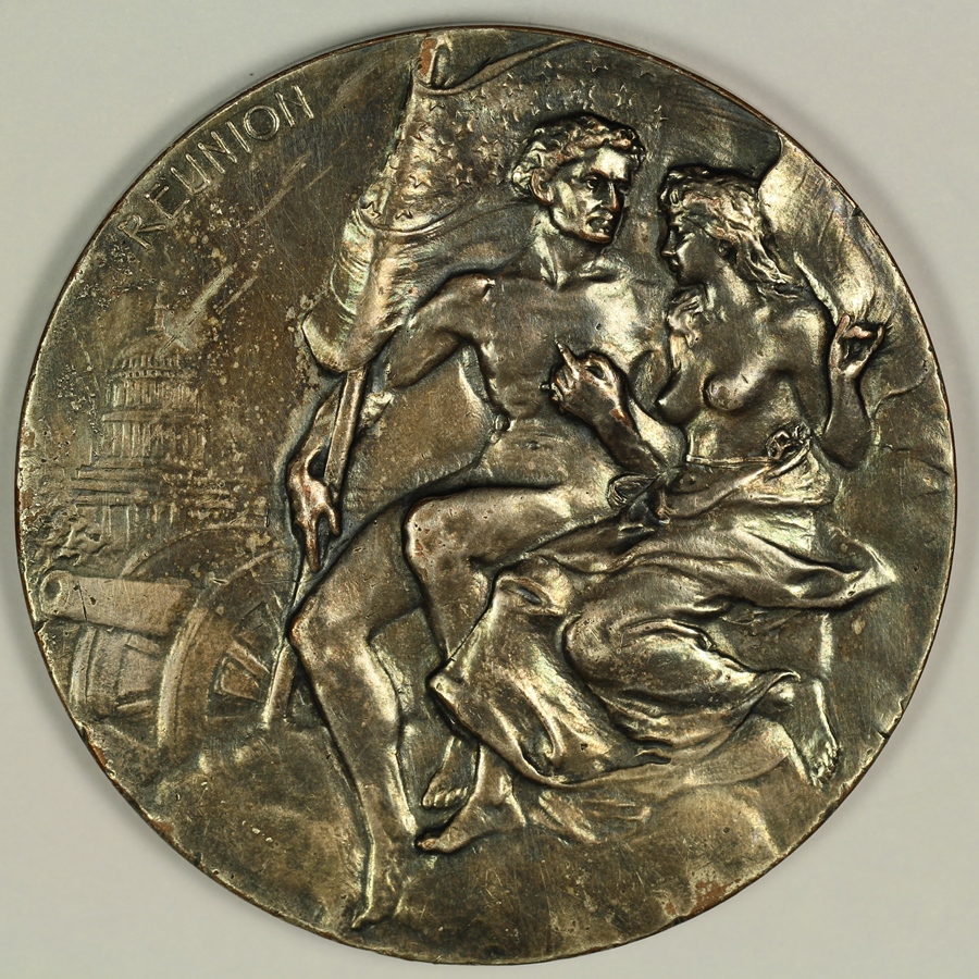This is an amazing 1909 Abraham Lincoln Reunion Medal engraved by Henning Ryden and struck by C.H. Hanson of Chicago. The medal is 2.5 inches in diameter and about 1/4 inches thick and is made of silver-plated bronze. The silver plating is very thick and only worn through in a couple of the highest points of the design. This piece is cataloged as King-783 in the reference Lincoln in Numismatics by Robert P. King. There is a wonderful attractive medium dark patina across the medal with some colorful toning on the silvered surfaces when looking on a close inspection. The obverse design features a beardless 3/4 bust of a younger Abraham Lincoln. The reverse design features two figures holding hands, a nude male and a half nude female, which some sources say represent the North and South. The male figure, which appears to also be Abraham Lincoln, is also holding the United States Flag with a cannon and the Capitol building behind. The medal has only light wear on the highest points of the design and a few light scratches are of note. There are also some light scratches over the engraver and manufacturer names in the obverse field where someone may have tried to remove the names at one time. The scratches are light however and the names are still legible. An overall interesting Lincoln Medal that is not often seen. |