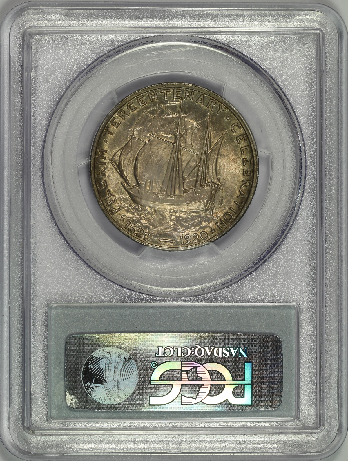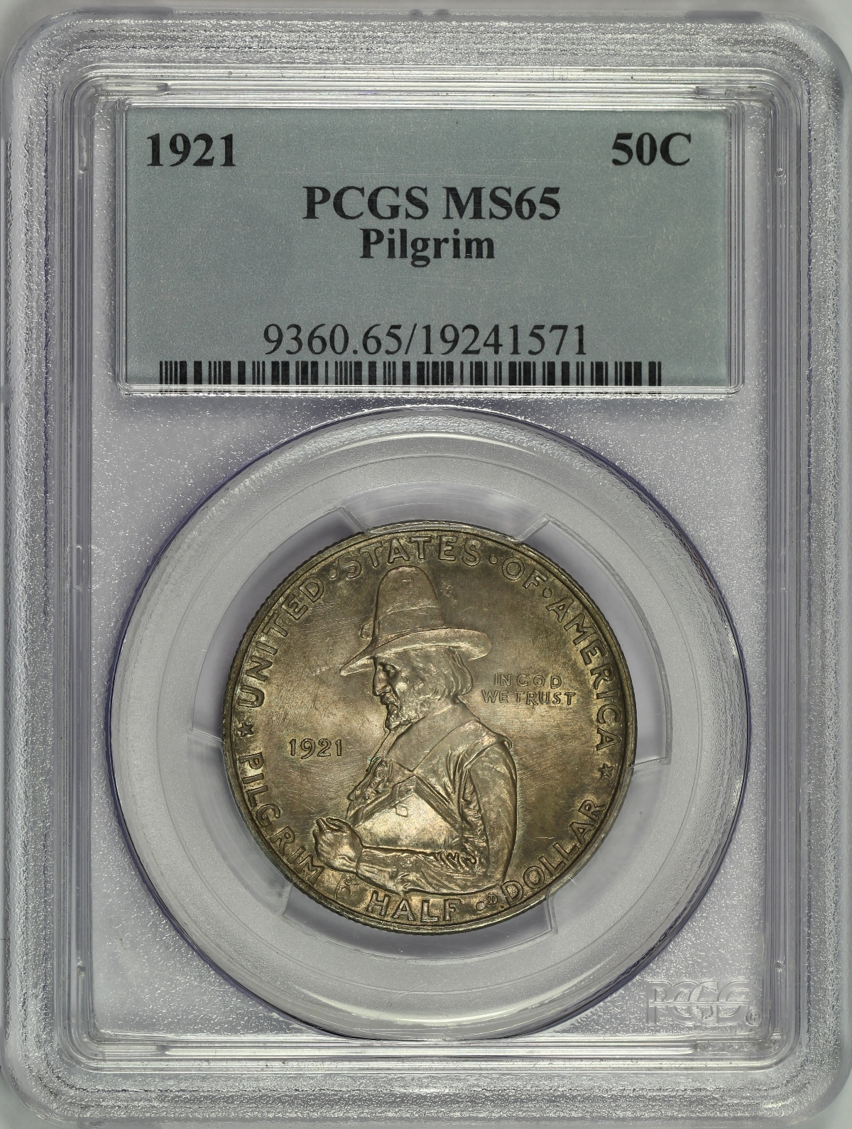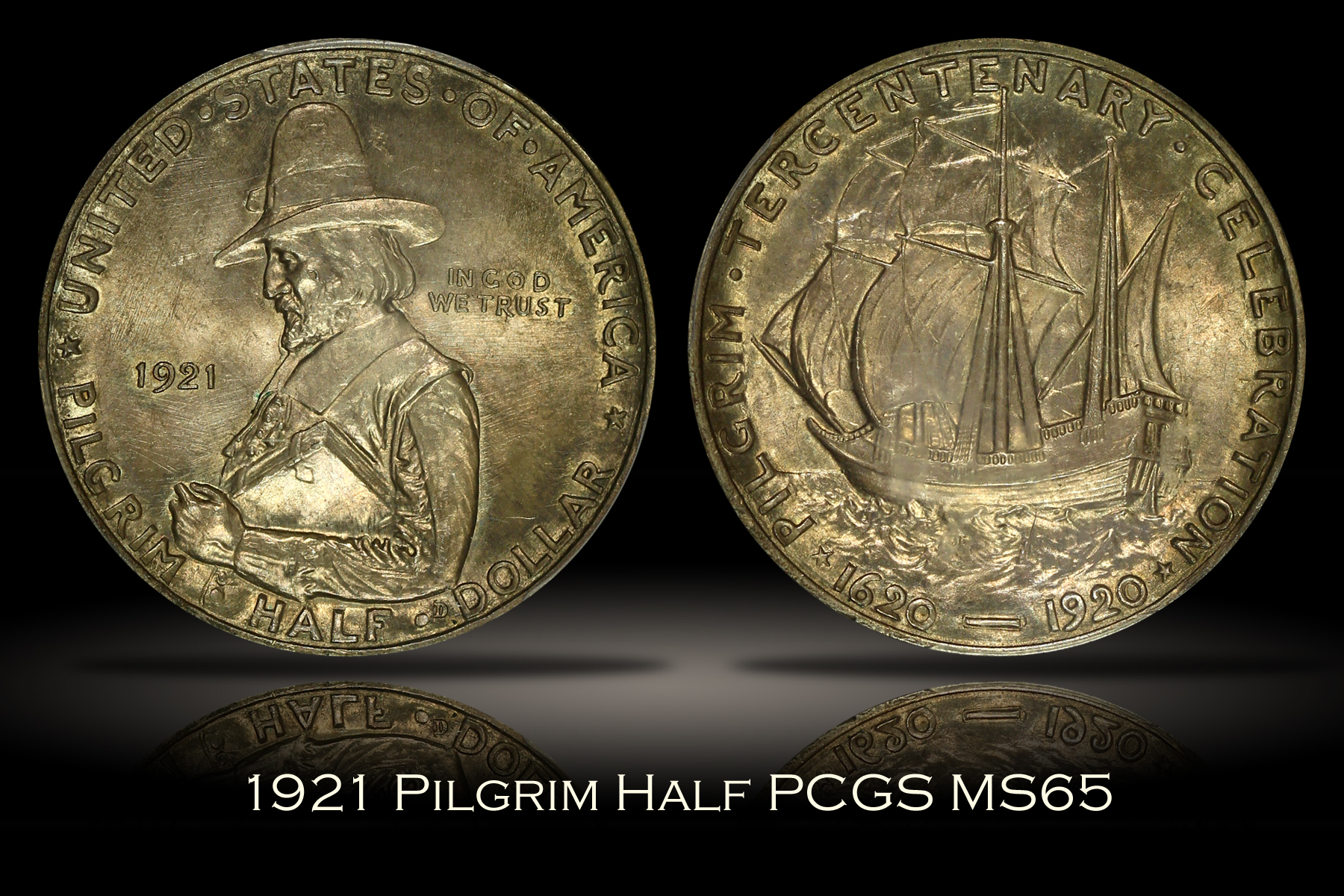 | The 1921 Pilgrim Tercentenary Commemorative Half Dollars commemorated the 300th anniversary of the landing of the Pilgrims at Plymouth, Massachusetts in 1620. The 1921 examples of this commemorative were the second and final year of this issue and were minted in much lower numbers than the 1920. The obverse features the portrait of William Bradford who was the governor of the Plymouth Colony. The reverse shows a an impressively detailed rendition of the Mayflower. This example of the Pilgrim half dollar has been graded MS65 by PCGS and is encapsulated in one of the newer-style edge-view holders. The coin is moderately toned in a very even golden-grey color on both sides, with traces of other iridescent colors present also. A couple of deep hits just to the right of the hat, and a couple of hits off the nose, likely limited the grade of the piece, but they are not too distracting. When viewing the coin in hand, the viewer’s eye is mostly drawn to the impressive amount of die polish lines covering the obverse fields and the strength of those lines. Faint traces of die clashing can still be found underneath those strong die polish lines. It appears that the coin was struck on very freshly worked dies after a significant die clash. Clashing is very clear on the reverse of the coin, particularly in the upper left sails which show the outline of Bradford’s hand from the obverse, and just off the rear sail where the inverted “RUS” from TRUST on the obverse can be found. A very interesting looking gem Pilgrim half dollar that is certainly not your average looking example. |