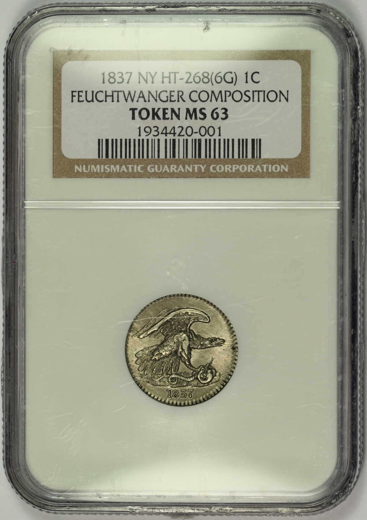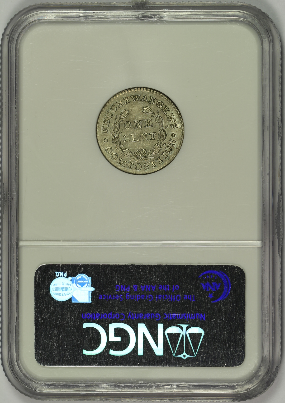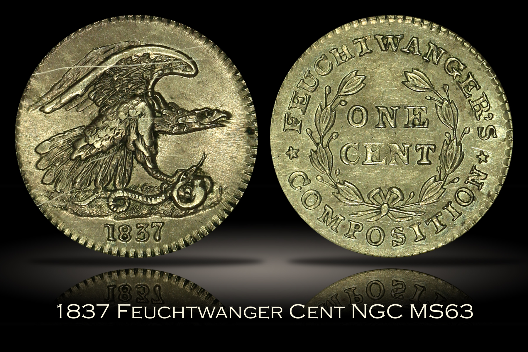 Feuchtwanger Cents were privately minted by Dr. Lewis Feuchtwanger and were made of “German silver” which is an alloy containing no silver, but instead is a mix of copper, nickel, zinc and tin. Dr. Feuchtwanger produced these coins in 1837 in an attempt to convince Congress and the U.S. Mint to use his smaller cents made of German silver as a replacement for the more costly copper large cents. Although, Dr. Feuchtwanger’s design and composition were not adopted by the U.S. Government, small cents of a similar copper-nickel composition were introduced roughly twenty years later. Today, Feuchtwanger Cents are widely collected by collectors either as hard-times tokens (HT-268) or as the first U.S. small cent. For reference, the coin is found on page 408 of the 2015 edition of the Red Book of U.S. Coins.