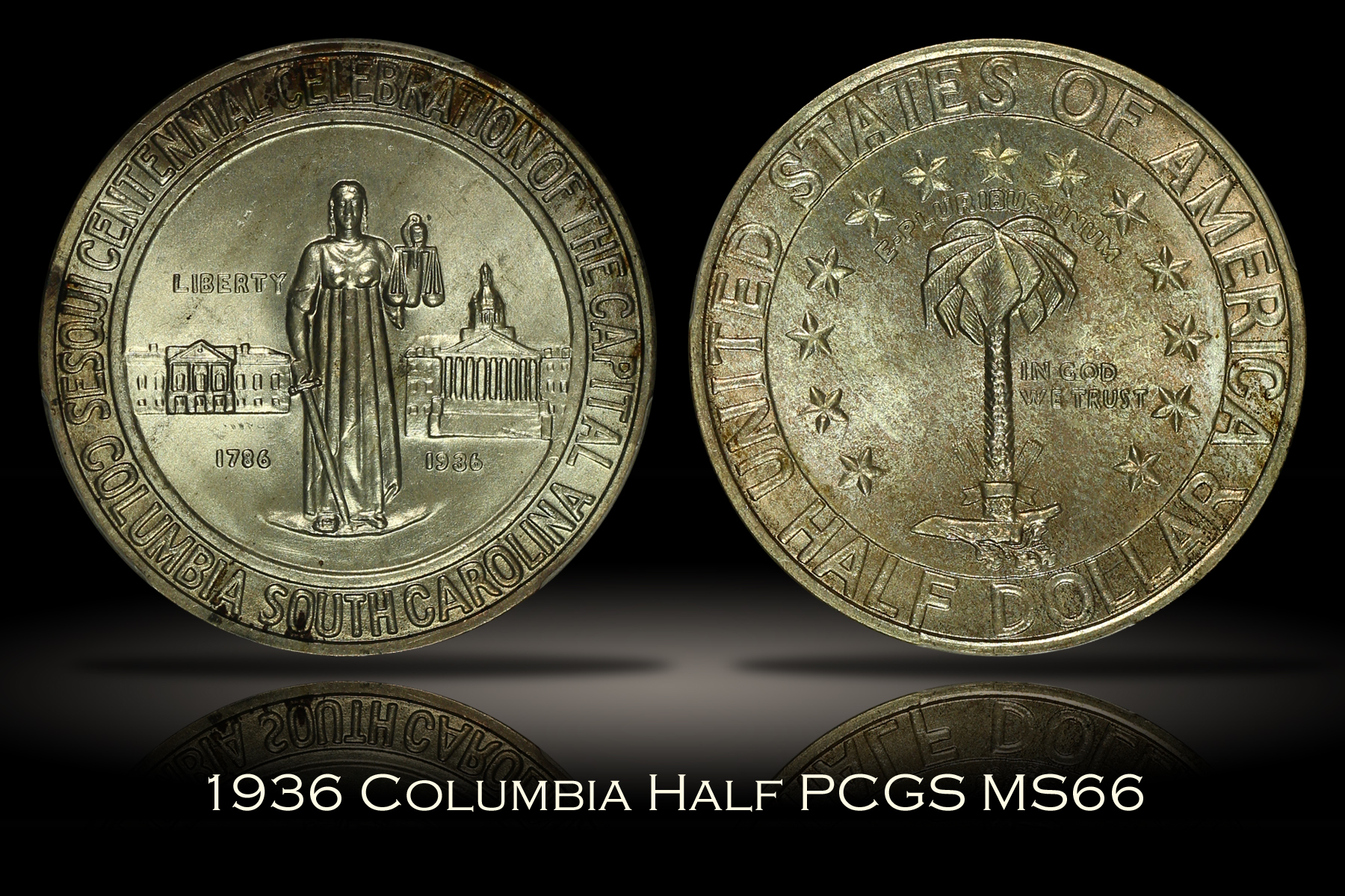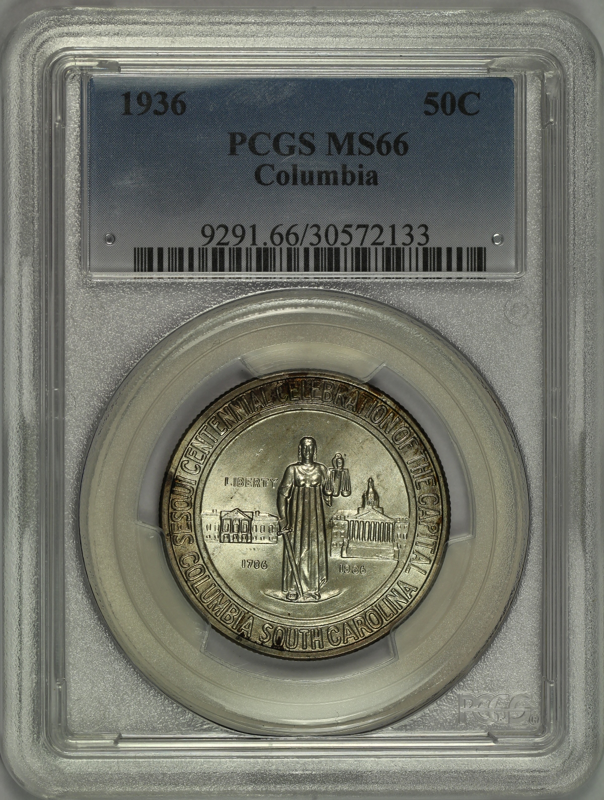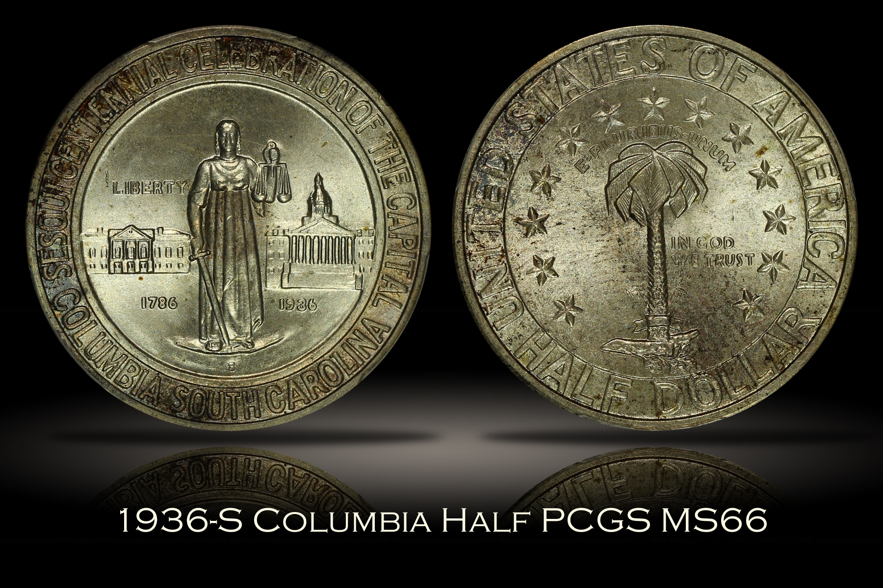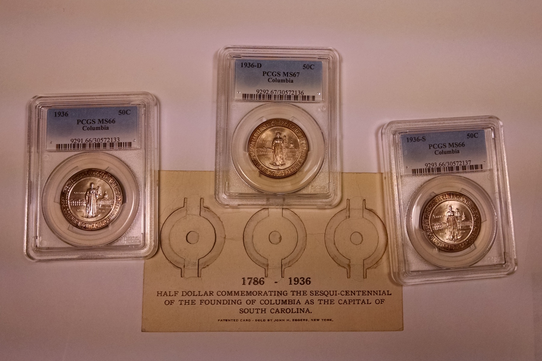| Of the many commemoratives authorized by Congress in 1936, the Columbia South Carolina Sesquicentennial Half Dollar was the first one authorized, but was the last struck that year and was not issued until well after the festivities related to the sesquicentennial had taken place. This is a wonderful high-grade set of Columbia Half Dollars from each of the three (3) mints that struck the coins. The set also comes with an original cardboard tab holder in which the coins were originally issued. The 1936 Columbia Half Dollar has been graded MS66 by PCGS, the 1936-D Columbia Half Dollar has been graded MS67 by PCGS and the 1936-S Columbia Half Dollar has been graded MS66 by PCGS. Each coin has been encapsulated in the newer-style edge-view holder. Since these coins were originally issued in the included cardboard holder with the circular target-shaped cutouts connected by small tabs to hold the coins in place, there is a very distinct and highly desired "tab toning" on the obverse of each coin. The reverse of each coin is also lightly toned. The coins have very appealing original mint luster and are nearly perfect, each having only a couple of small marks that are noticed under close inspection. The included cardboard tab holder is in decent condition with a few light creases and one slightly damaged corner. A well matched PDS set of Columbia Commemorative Half Dollars with the original tab holder that have likely been together since the time of issue. |