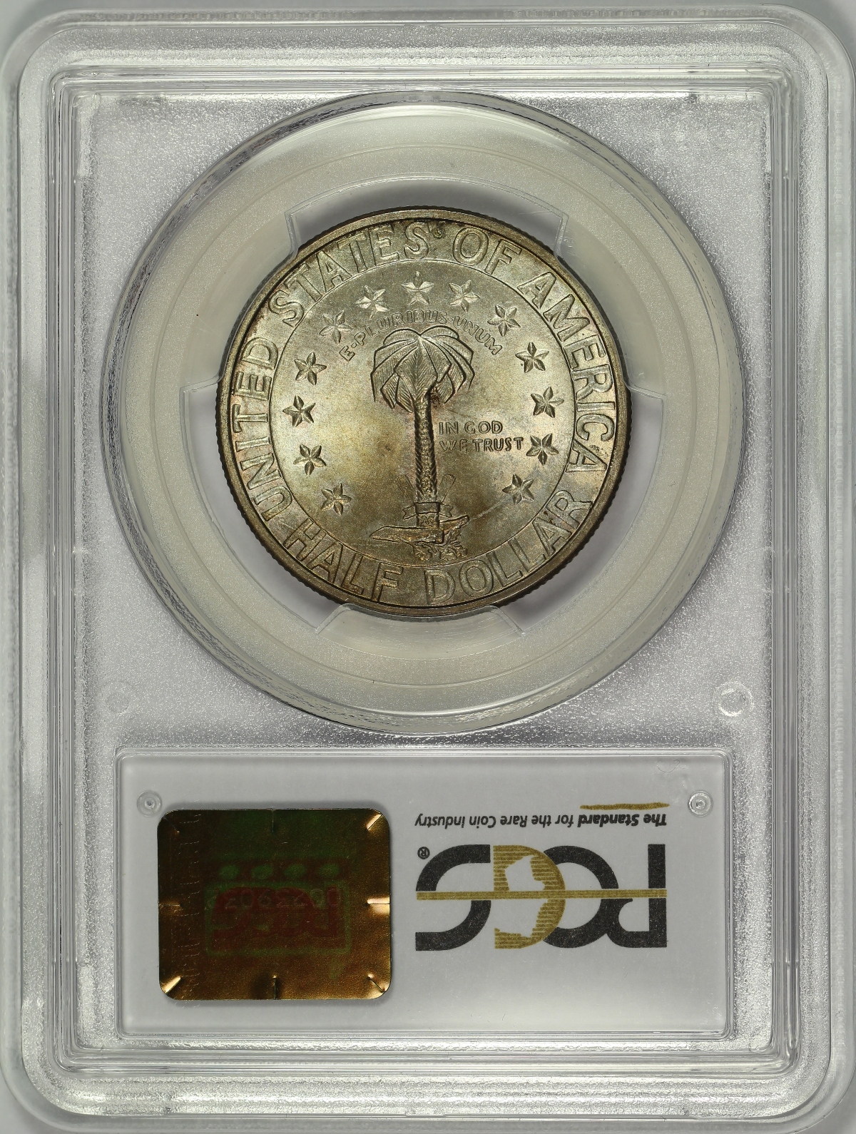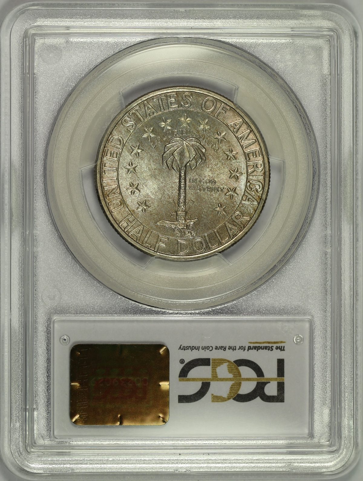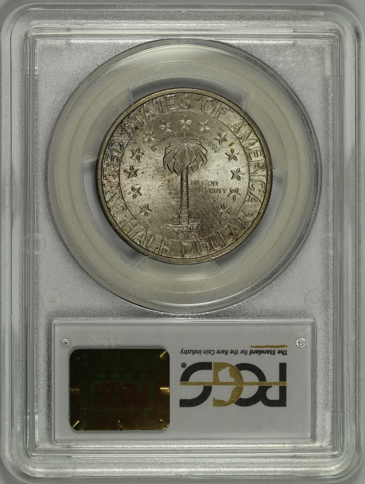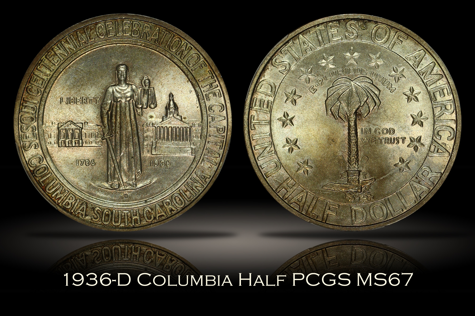 | Of the many commemoratives authorized by Congress in 1936, the Columbia South Carolina Sesquicentennial Half Dollar was the first one authorized, but was the last struck that year and was not issued until well after the festivities related to the sesquicentennial had taken place. This is a wonderful high-grade set of Columbia Half Dollars from each of the three (3) mints that struck the coins. The set also comes with an original cardboard tab holder in which the coins were originally issued. The 1936 Columbia Half Dollar has been graded MS66 by PCGS, the 1936-D Columbia Half Dollar has been graded MS67 by PCGS and the 1936-S Columbia Half Dollar has been graded MS66 by PCGS. Each coin has been encapsulated in the newer-style edge-view holder. Since these coins were originally issued in the included cardboard holder with the circular target-shaped cutouts connected by small tabs to hold the coins in place, there is a very distinct and highly desired "tab toning" on the obverse of each coin. The reverse of each coin is also lightly toned. The coins have very appealing original mint luster and are nearly perfect, each having only a couple of small marks that are noticed under close inspection. The included cardboard tab holder is in decent condition with a few light creases and one slightly damaged corner. A well matched PDS set of Columbia Commemorative Half Dollars with the original tab holder that have likely been together since the time of issue. |
