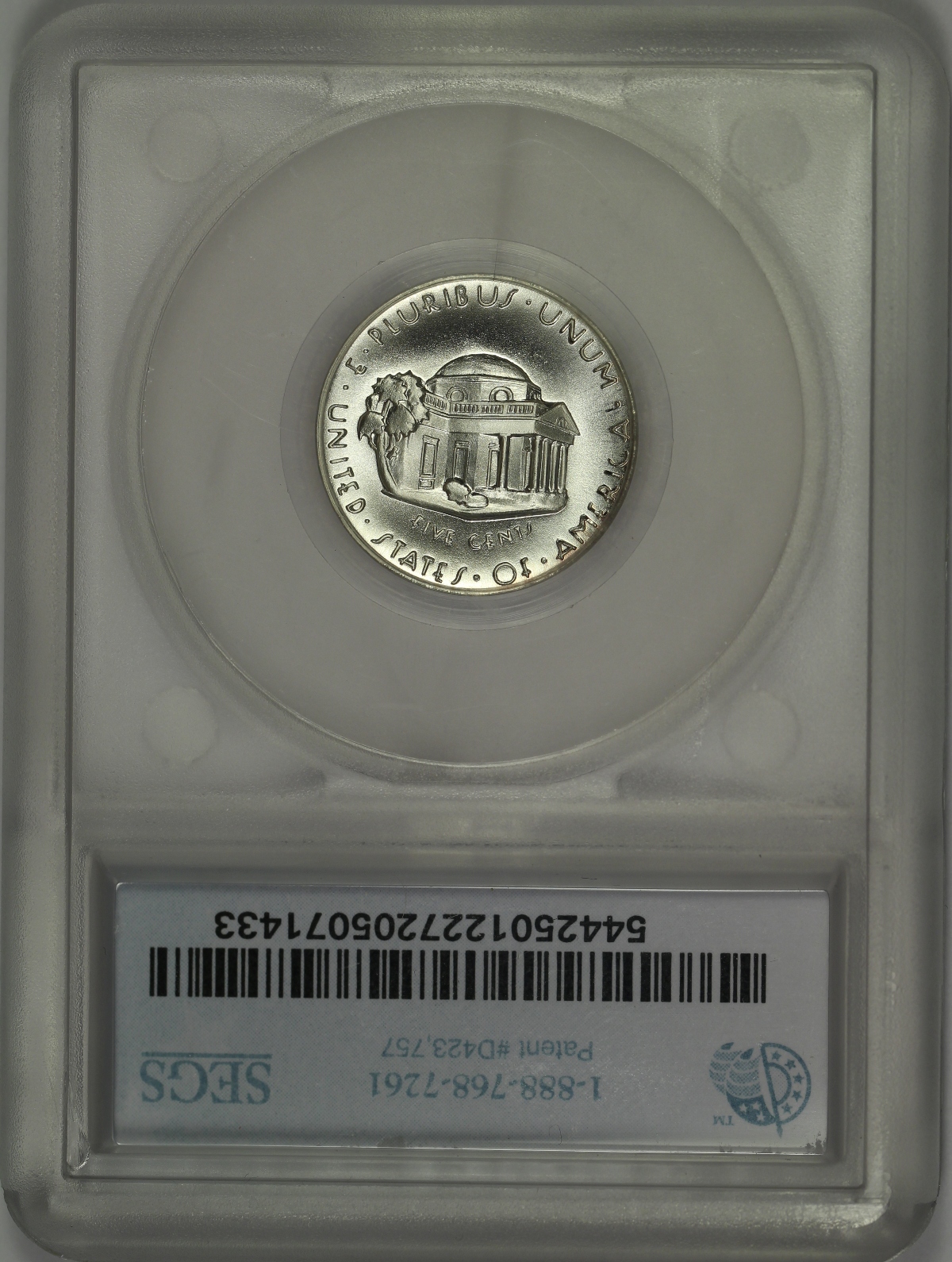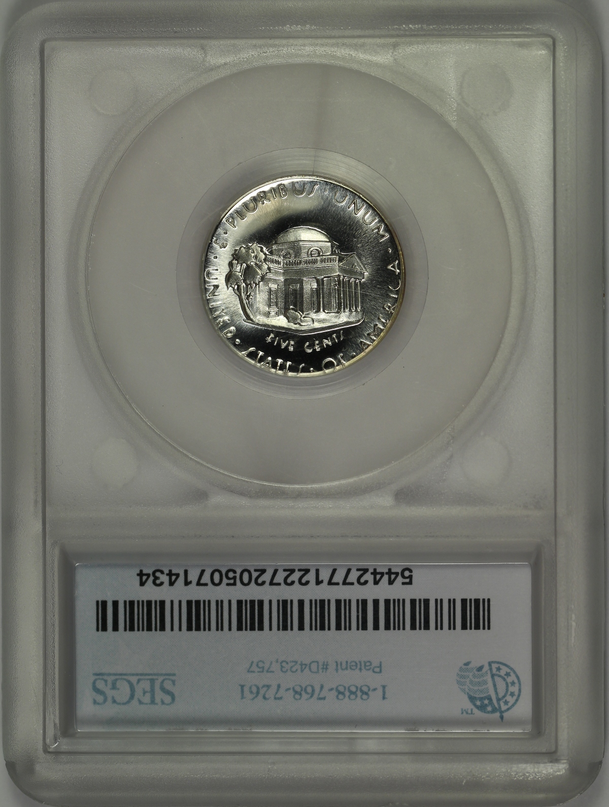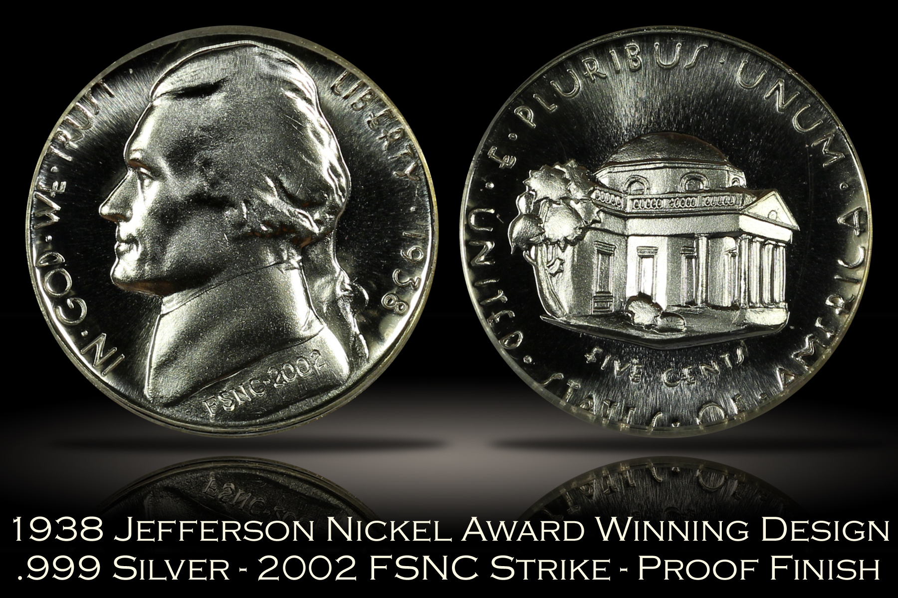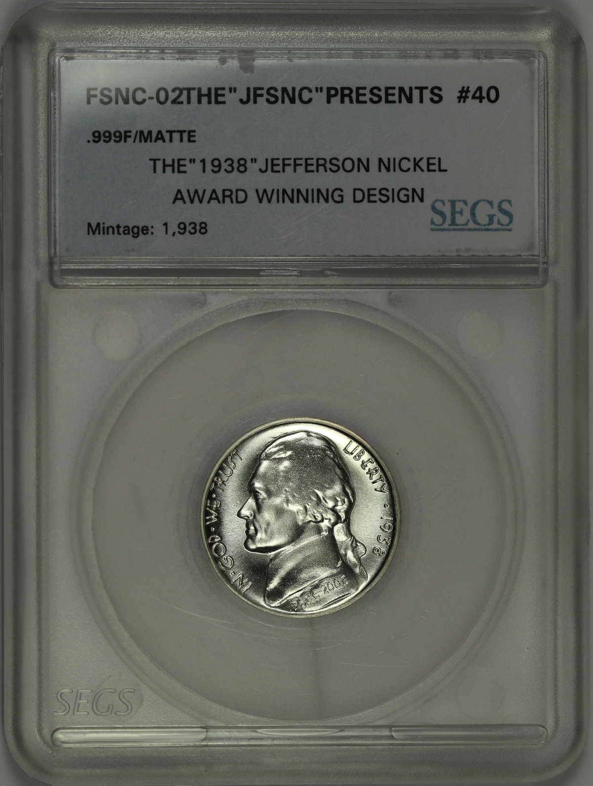 | The Jefferson Nickel replaced the Buffalo Nickel design in 1938. The Mint held a design competition that year for the new Jefferson Nickel which was ultimately won by Felix Schlag. However, after winning the design competition, the Mint required Schlag to make revisions to his original award-winning reverse design of Monticello. In 2002, the Jefferson Full Step Nickel Club commissioned the production of Jefferson Nickels in .999 fine silver which featured Schlag’s original award winning design. Two types of nickels were made, one with a regular proof finish and the other with a matte proof finish. A total mintage of 1,938 sets were produced, encapsulated by SEGS and individually numbered on the SEGS labels. The set of coins offered here is Set No. 40, which is one of the lowest numbered sets I have seen available on the market. The nickels are very well made and neither has any problems or defects of note. The reverse design and original lettering style done in Schlag’s award-winning design is well-executed and quite interesting. |