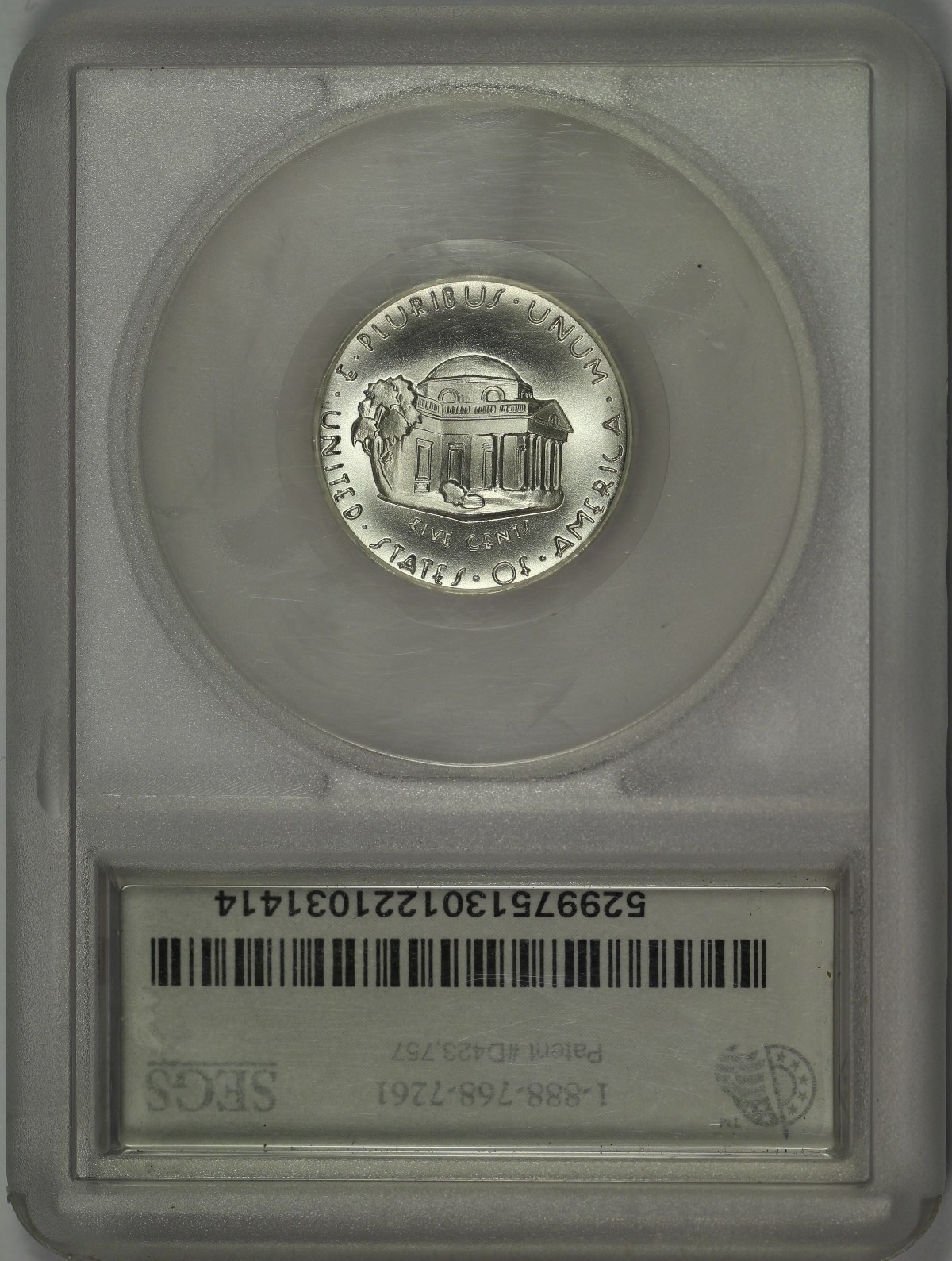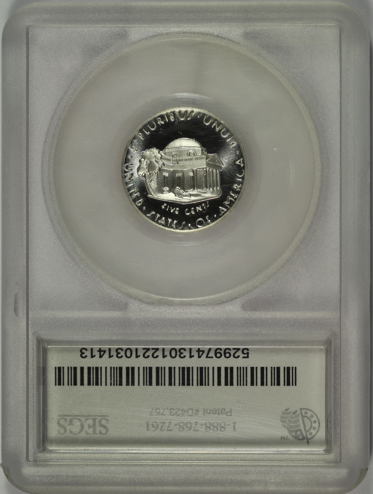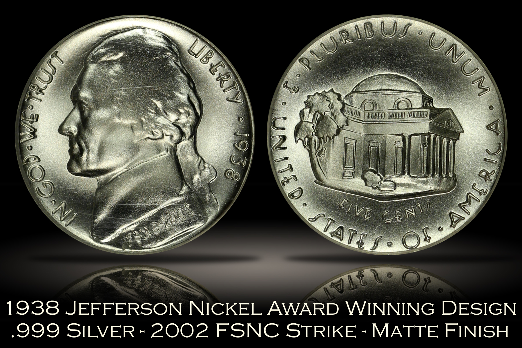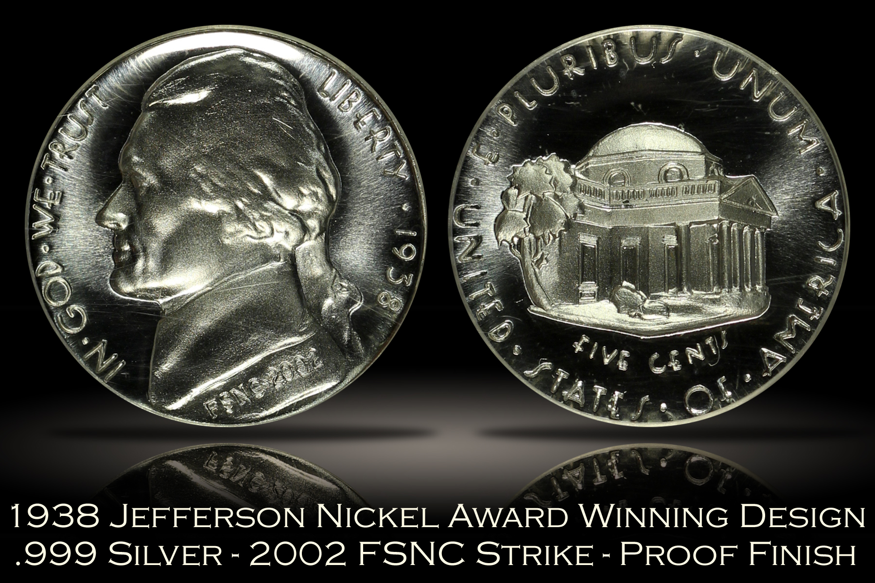 | The Jefferson Nickel replaced the Buffalo Nickel design in 1938. The Mint held a design competition that year for the new Jefferson Nickel which was ultimately won by Felix Schlag. However, after winning the design competition, the Mint required Schlag to make revisions to his original award-winning reverse design of Monticello. In 2002, the Jefferson Full Step Nickel Club commissioned the production of Jefferson Nickels in .999 fine silver which featured Schlag’s original award winning design. Two types of nickels were made, one with a regular proof finish and the other with a matte proof finish. A total mintage of 1,938 sets were produced, encapsulated by SEGS and individually numbered on the SEGS labels. The set of coins offered here is Set No. 857. The nickels are very well made and neither has any problems or defects of note. The reverse design and original lettering style done in Schlag’s award-winning design is well-executed and quite interesting. |