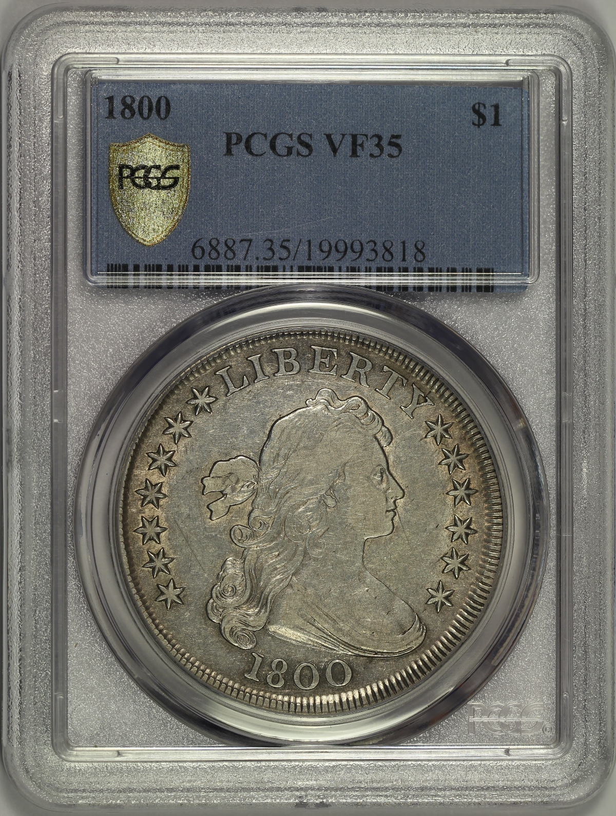 | Here is a 1800 Draped Bust Silver Dollar with the Large Eagle or Heraldic Eagle Reverse has been graded VF35 by PCGS. This early silver dollar has a fairly even light grey color and is free of major issues. The fields do exhibit some minor hairlines and some very light and fine scratches, but nothing out of the ordinary for the assigned grade. The coin also shows fairly strong underlying Mint luster for the grade, but the light circulation wear that is present appears to be consistent with the assigned grade. The luster is even stronger on the reverse side and in the protected areas of the obverse, giving the coin much better eye appeal than the average VF graded example of the type.