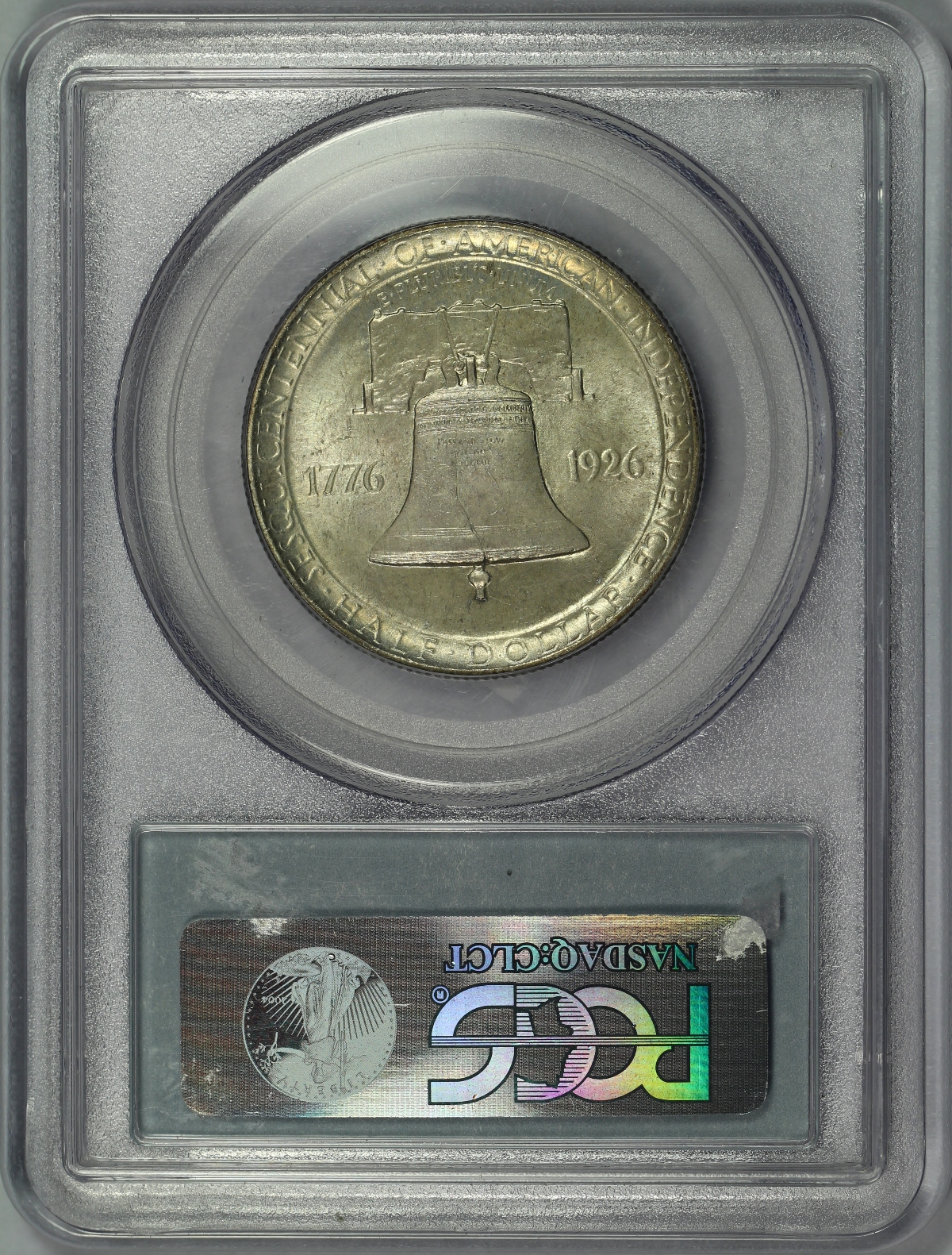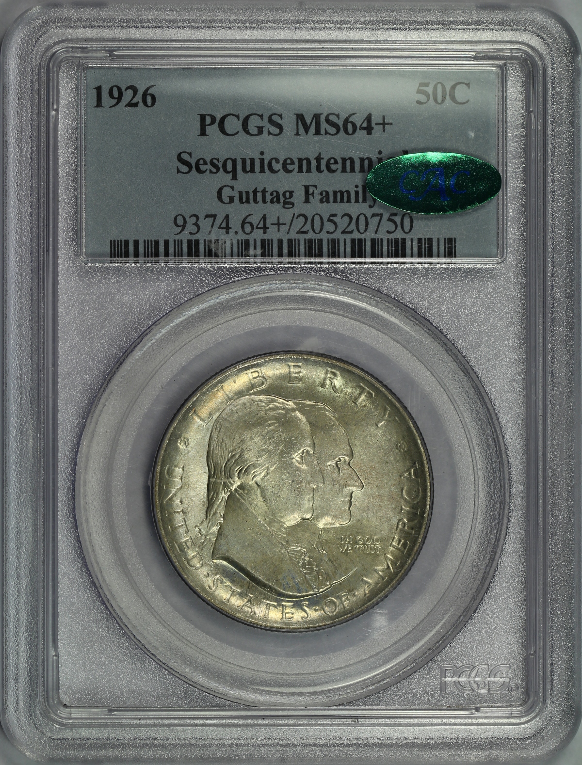 | Here is a great example of the 1926 Sesquicentennial of American Independence Commemorative Half Dollar which has been graded MS64+ by PCGS. The coin has also been certified by CAC as being solid for the assigned grade. The PCGS label also indicates this coin was from the “Guttag Family” collection. The obverse depicts the first President of the United States, George Washington, alongside the then current President of the United States, Calvin Coolidge. The reverse shows a very nice rendition of the Liberty Bell. The coin has some light handling marks and minor hits on the high points, but nothing too significant. The coin is mostly bright white and very lustrous, though the luster is slightly muted by a light haze which covers most of the surfaces of both sides of the coin, but that light haze is also a testament to the originality of this piece. Examples of this issue typically are found somewhat flat or dull, but that is not the case with this coin and the luster of the piece is likely the reason the coin was given the plus grade by PCGS. Given the large jump in price to the next grade, this near gem example of the Sesquicentennial Commemorative Half is a relative bargain. |
