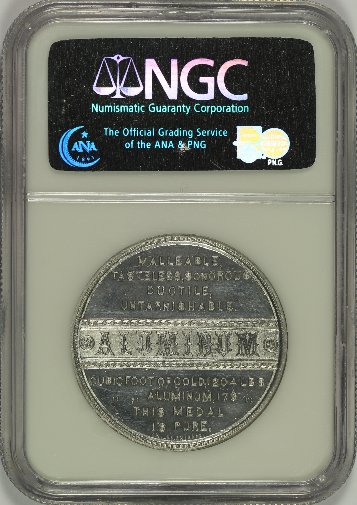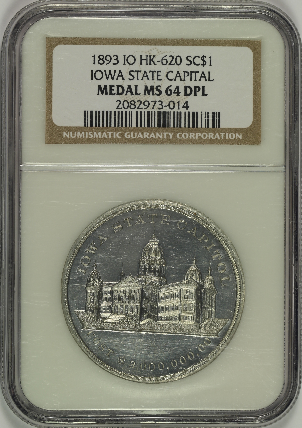| This aluminum medal features the Iowa State Capitol building in Des Moines and is listed as HK-620 in the Hibler-Kappen book on So-Called Dollars and has been graded MS64DPL by NGC. Although undated, the NGC label provides a date of 1893 as the reverse design giving the properties of aluminum matches the reverse of the HK-161 so-called dollar issued in connection with the World’s Columbian Exposition in Chicago that year. The obverse design of the Iowa State Capitol building and it’s cost of $3,000,000 is the same as the obverse design of the HK-619 so-called dollar which is dated 1890. In any event, this piece is strongly struck and shows impressive details of the Capitol building in relatively high relief. The open fields of both the obverse and reverse reveal some minor handling marks, but no major distractions are noted. The fields of this bright white piece are strongly prooflike with somewhat frosty devices. This piece is the sole finest known example of the HK-620 graded by NGC as the only MS64DPL; the next closest specimens are a single MS63DPL example, two (2) MS63PL graded pieces and two (2) MS63 examples. Here is your opportunity to get the finest known example of this so-called dollar. |