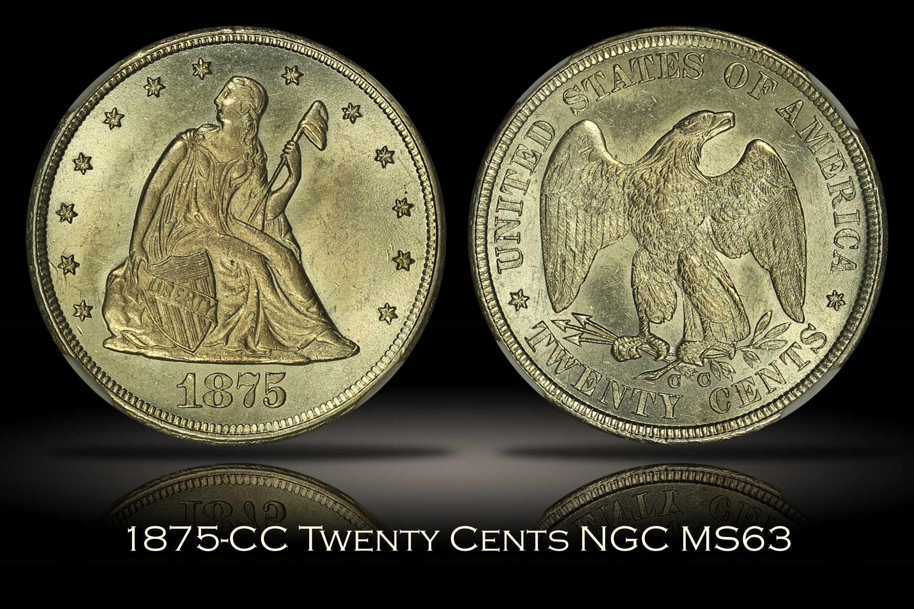 | The 1875-CC twenty cent piece is a very popular type coin and a favorite of collectors building type sets who wish to include coins that are better than average and which do not include the most common examples available. This example of the 1875-CC Twenty Cent has been graded MS63 by NGC and is encapsulated in the newer-style edge-view holder. This is an amazing example for the grade. The coin has a strong strike, booming mint luster and overall eye appeal of a coin that appears better than the grade suggests. There are some minor scuffs and light hairlines in parts of the fields that are noticed at certain angles which may have limited the numerical grade of the piece. That said, this is an excellent example of the type for the collector who wishes to include a spectacular Carson City twenty cent piece in their collection. |