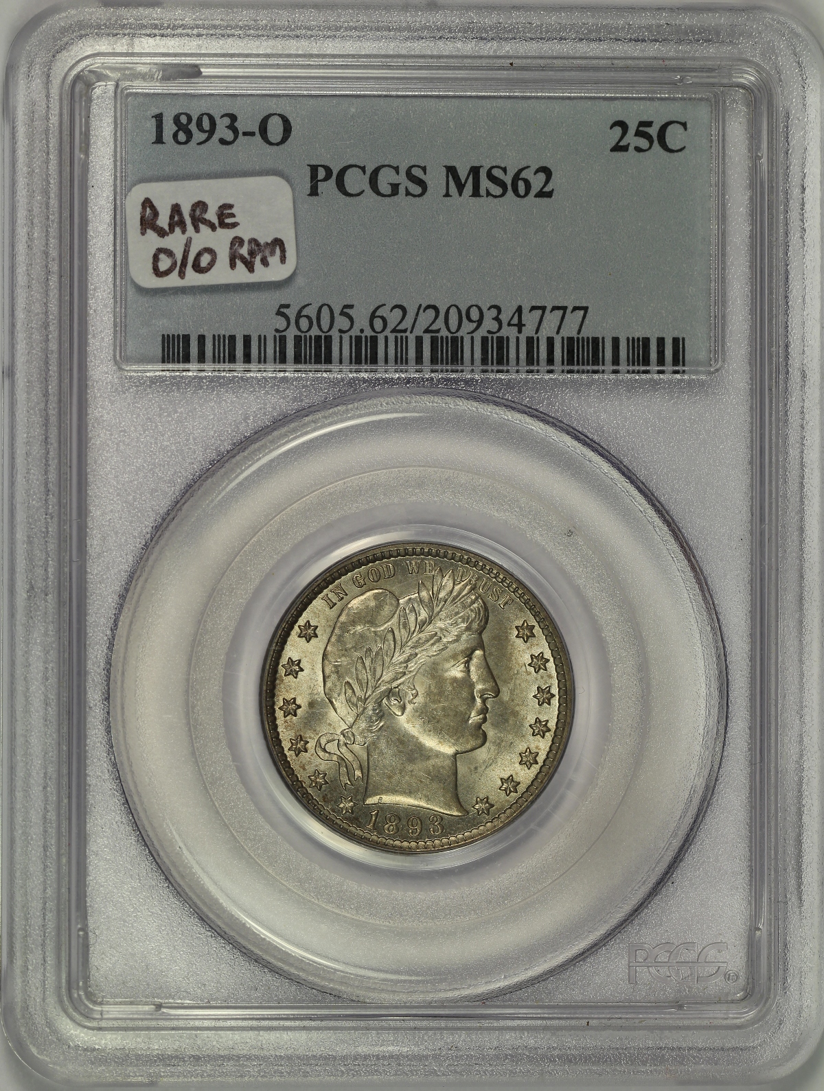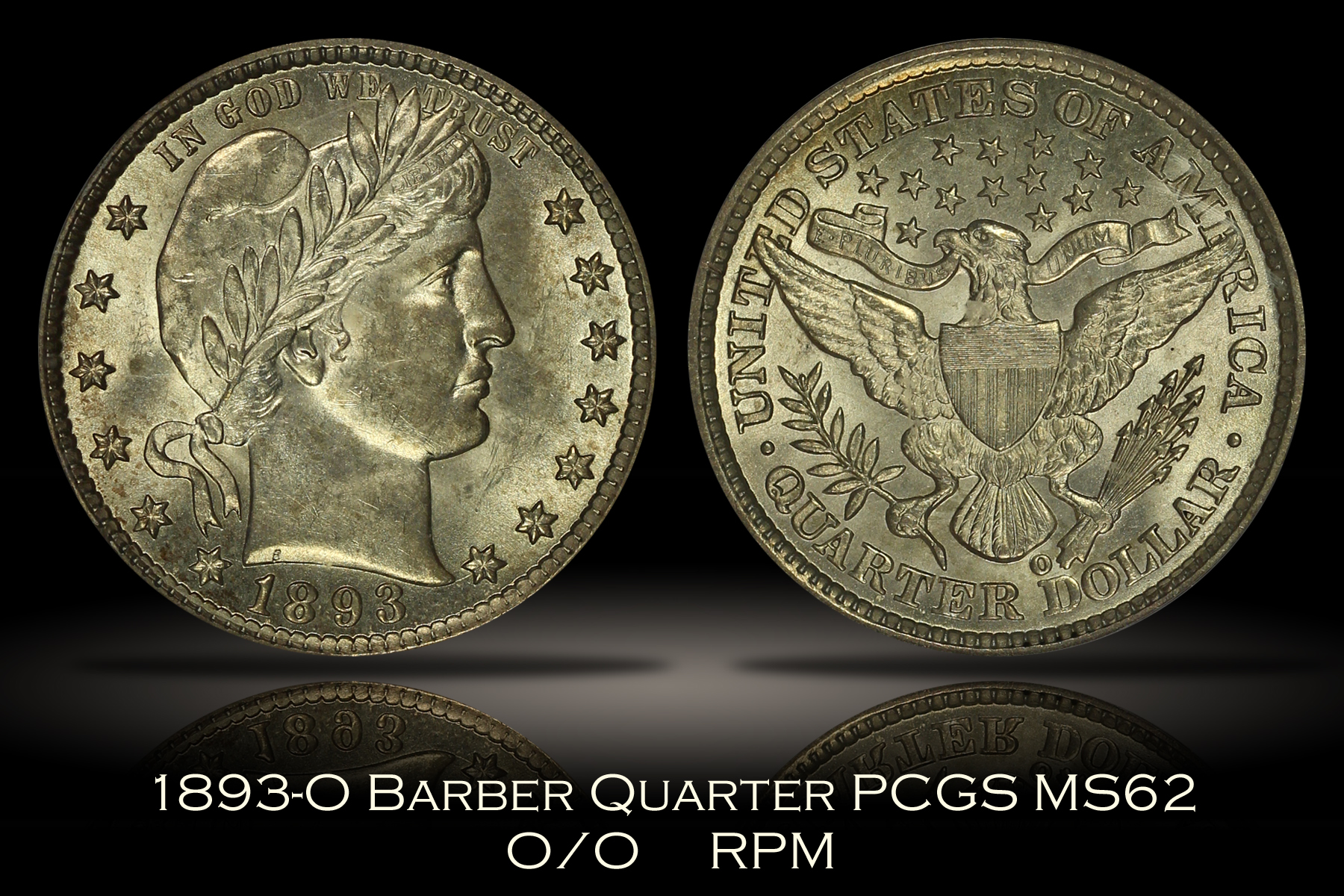 | Here is an 1893-O Barber Quarter which has been graded MS62 by PCGS. The coin is bright and lustrous on both sides and is untoned. The coin also has an excellent strike, particularly for a New Orleans quarter. There are several light marks and light scratches scattered about both sides of the coin, but none are major or overly distracting. In looking at the coin closer, the coin also exhibits a strongly repunched O/O mintmark. A couple of close up photos of the mintmark have been provided. Please note that this RPM variety is not listed an any of the references I have researched, and accordingly, is not designated on the label by the grading service. That said, I have shown the coin to a few Barber Quarter experts and each of them agreed the coin has a significant RPM. In looking at many other quarters of this date, I have not yet found another with this variety present. A nice overall mint state New Orleans Barber Quarter with a significant and potentially rare repunched mintmark variety. |
