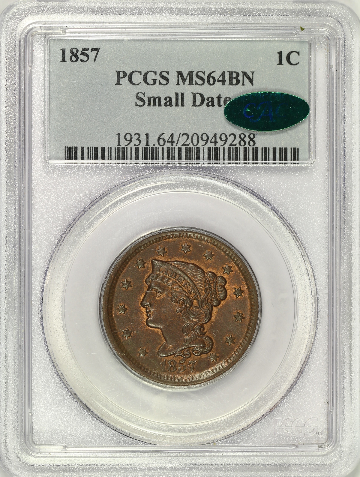 | 1857 Small Date Large Cent PCGS MS64BN CAC |