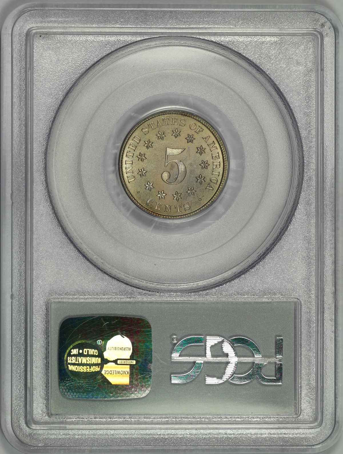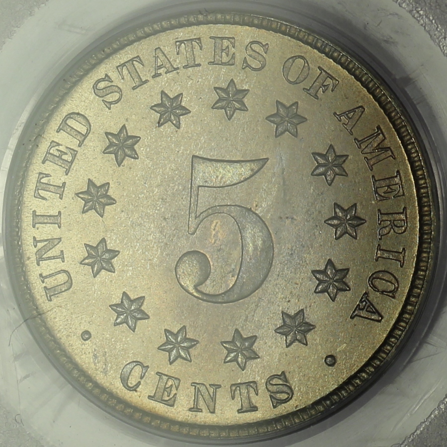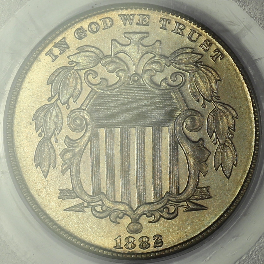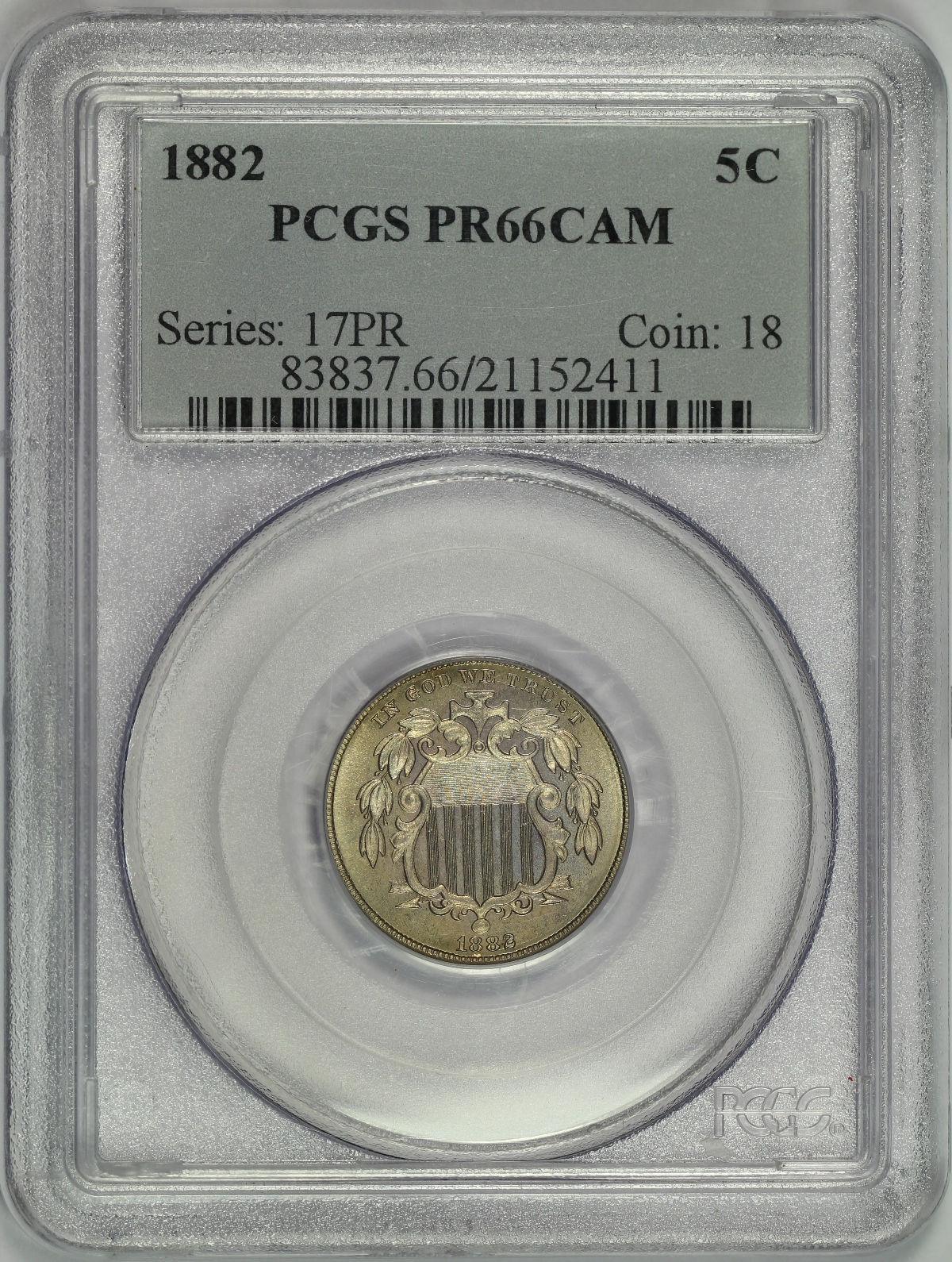| This 1882 Proof Shield Nickel has been graded PR66CAM by PCGS. This nickel has light toning on both sides that is slightly hazy, but which adds nice color and eye appeal to the piece. The obverse is particularly appealing with a brighter center and slightly deeper golden color around the rims. The coin has nice cartwheel luster and decent mirrored fields, but the toning of the coin does cover and limit the depth of those mirrored fields somewhat. Only a few light hits in the obverse shield are of note on this otherwise near perfect coin. An attractive high-grade proof example of the Shield Nickel. |