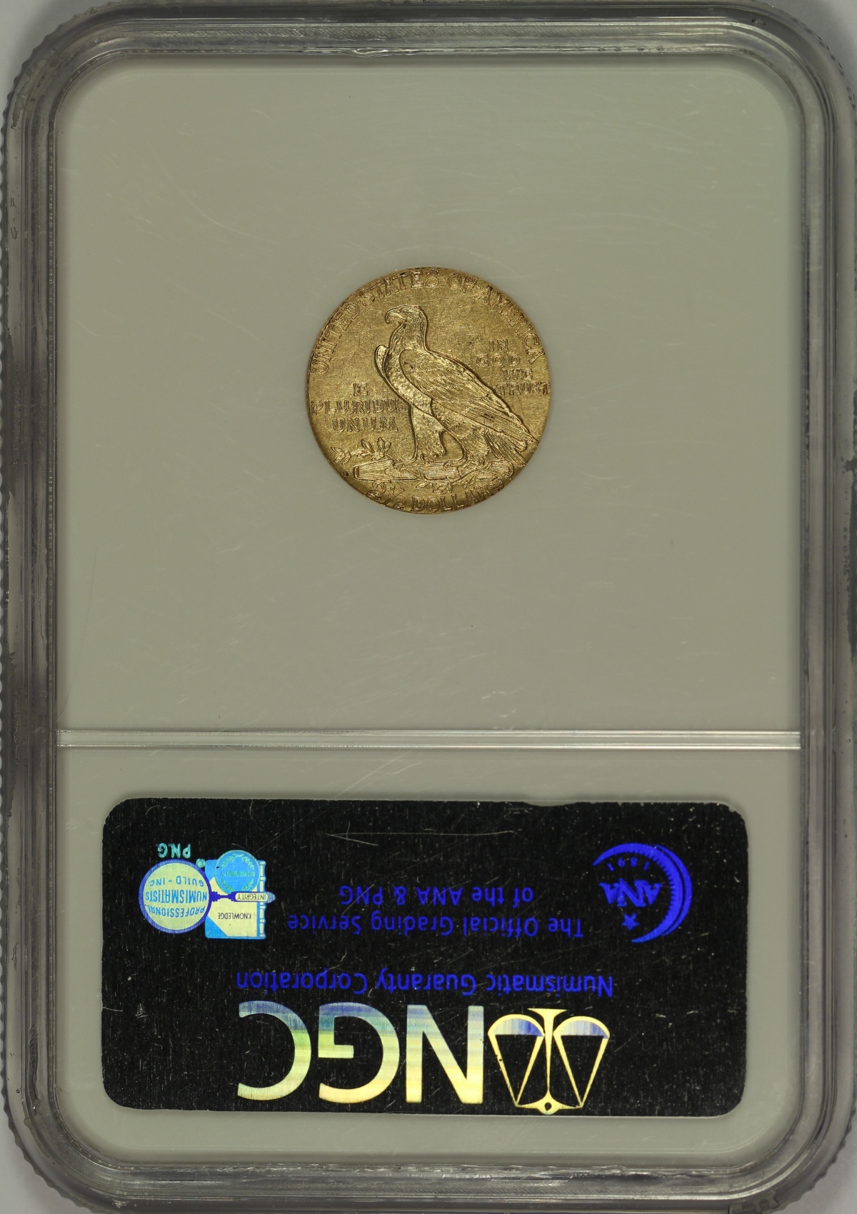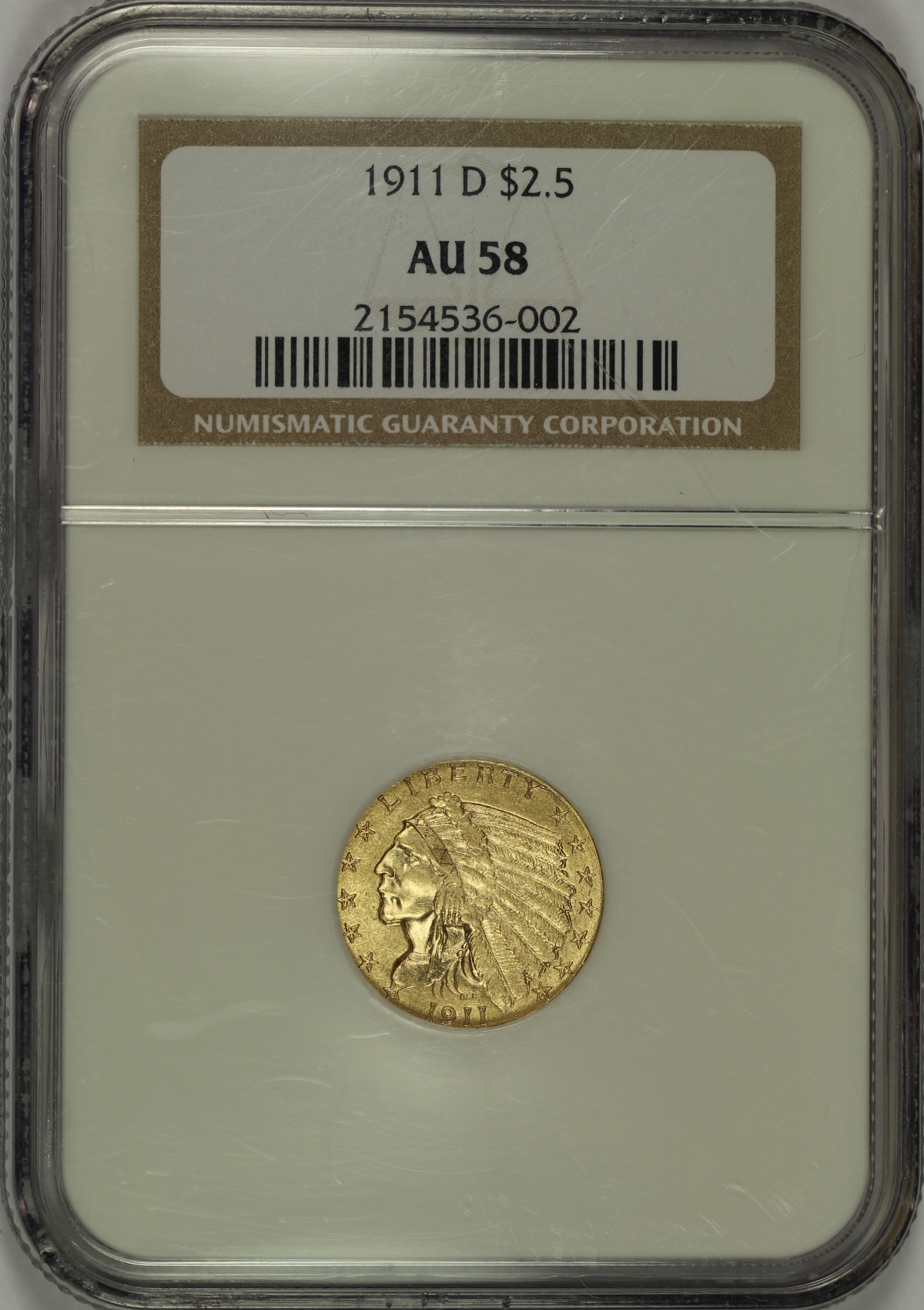 The 1911-D $2.5 Indian Gold Quarter Eagle is the key date of the series with a low mintage of only 55,600 coins. Not only is this issue the key date of the series, but it is also one of the big key dates in all of United States coin collecting. Of the low mintage, some of the coins of this date have a very weak and difficult to see mintmark which makes those examples considerably less desirable. Examples with bold and clearly struck mintmarks are sought after and command a premium. This 1911-D $2.5 Indian Gold Quarter Eagle has been graded AU58 by NGC. The example offered here has a boldly struck and clear mintmark which is what you want to see when purchasing this key date. The coin has an even light gold color with nice mint luster. The details of this popular incuse design show well and there is just a touch of wear evident on the highest points of the design. An overall excellent example of this popular key date gold issue.