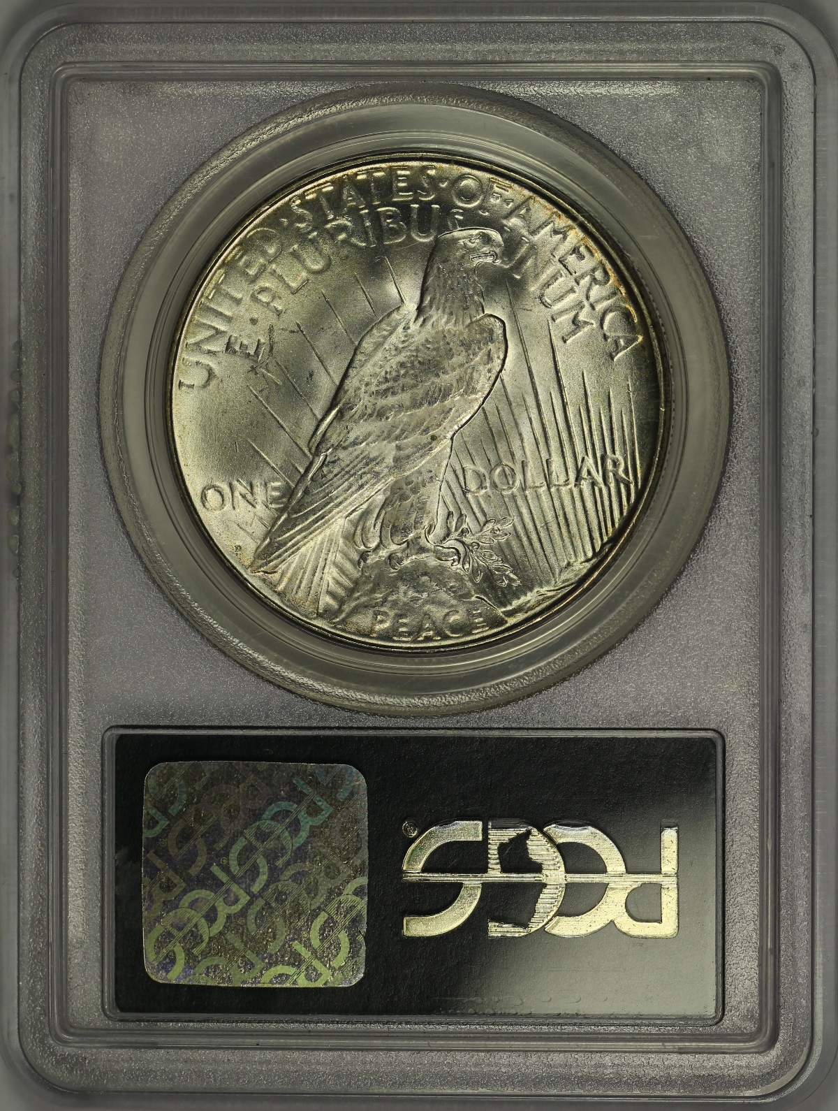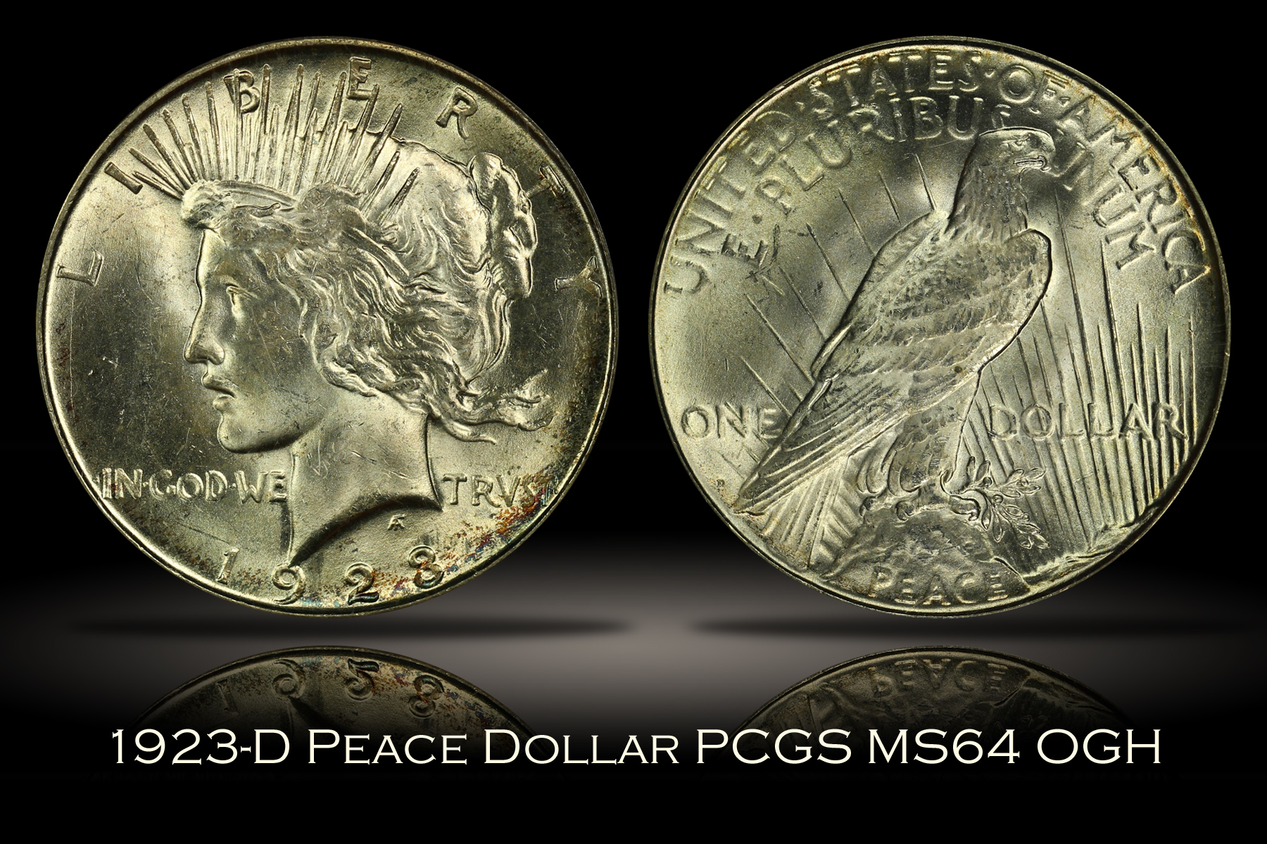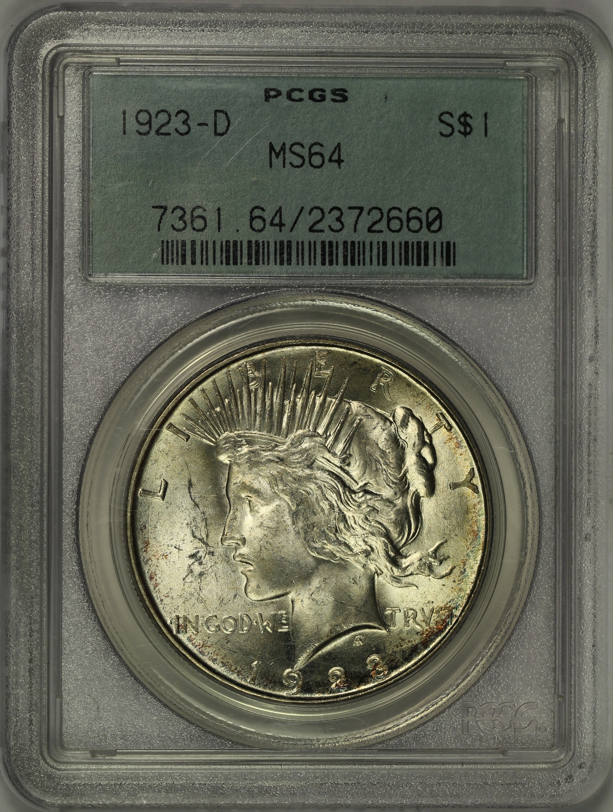 | Here is a 1923-D Peace Dollar which has been graded MS64 by PCGS and is encapsulated in an old green label holder which is approximately twenty years old. The coin is almost free of toning with just a touch of speckled color along the lower and right rim on the obverse. Otherwise, this silver dollar is bright white and has very strong original mint luster. Some minor hits and marks and some slight haze on the obverse may have kept this coin from earning a gem grade from the grading service, but it is nevertheless a strong example for the grade. A flashy, near-gem Peace Dollar in the older style PCGS holder. |
