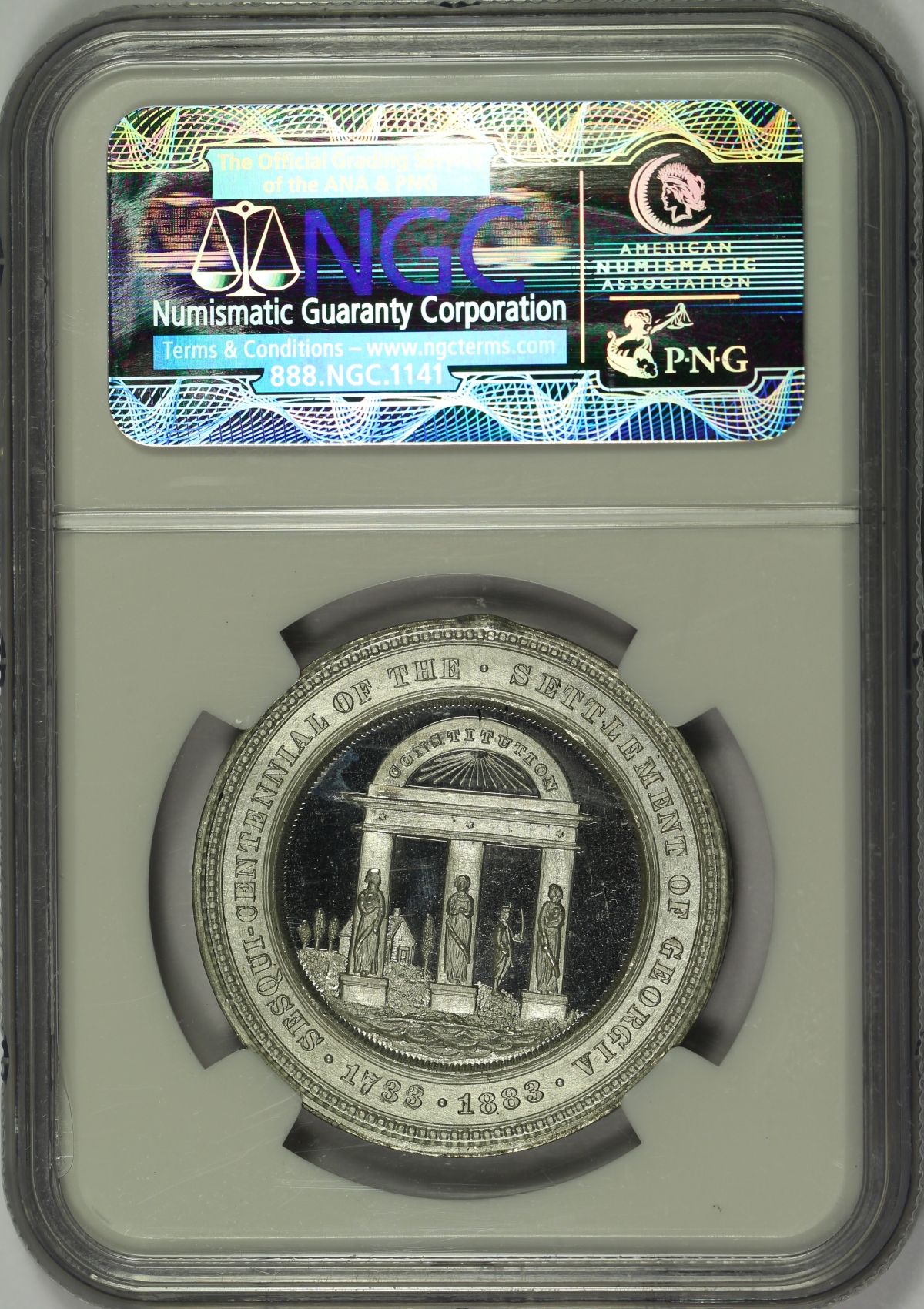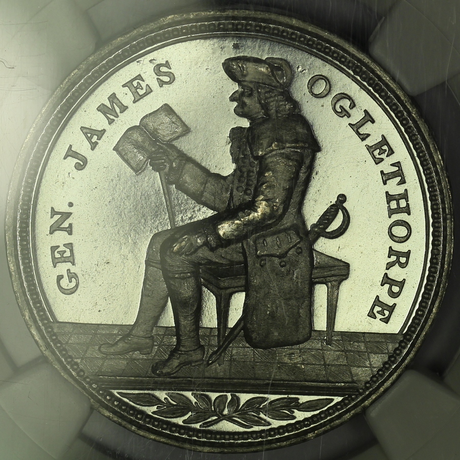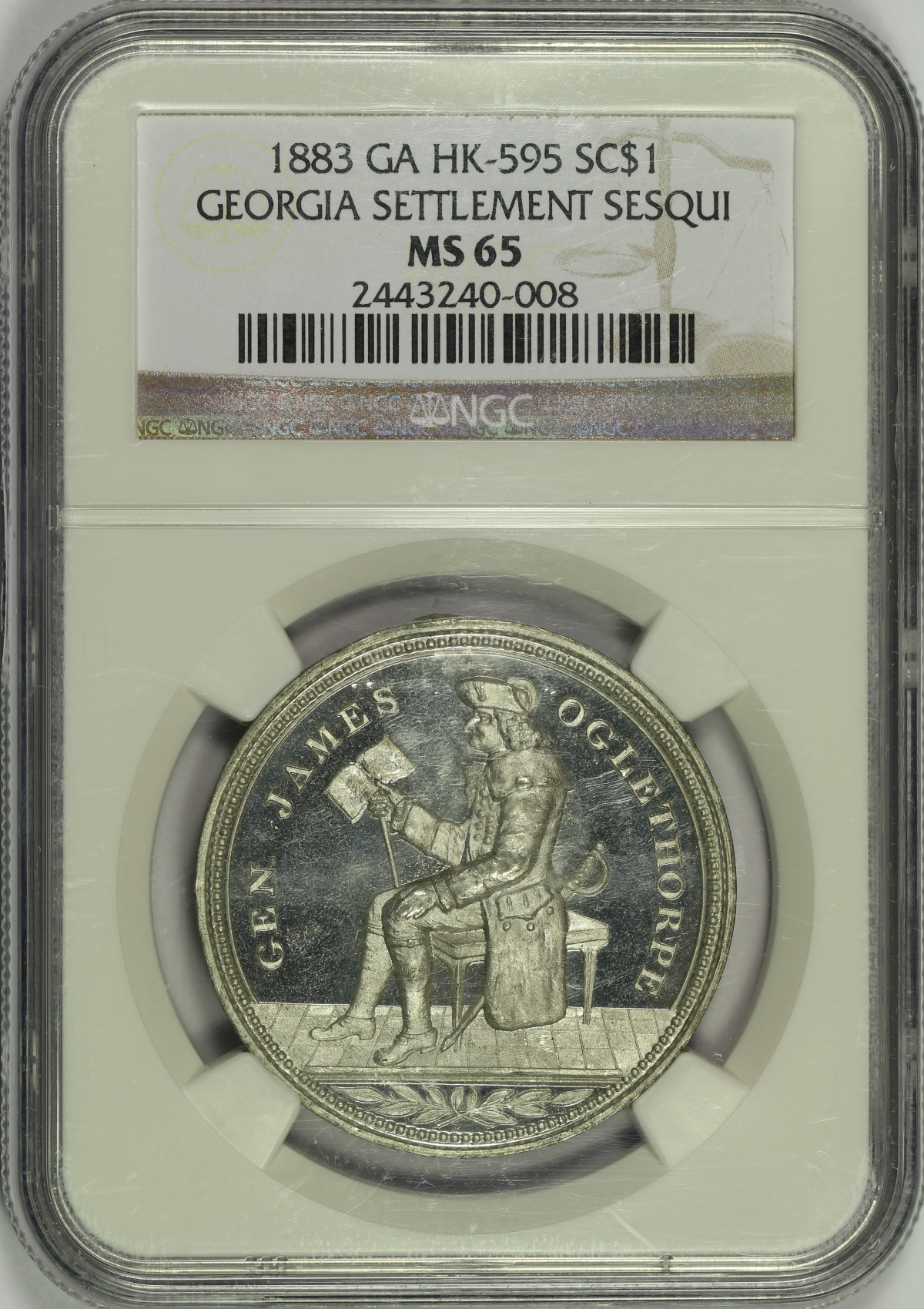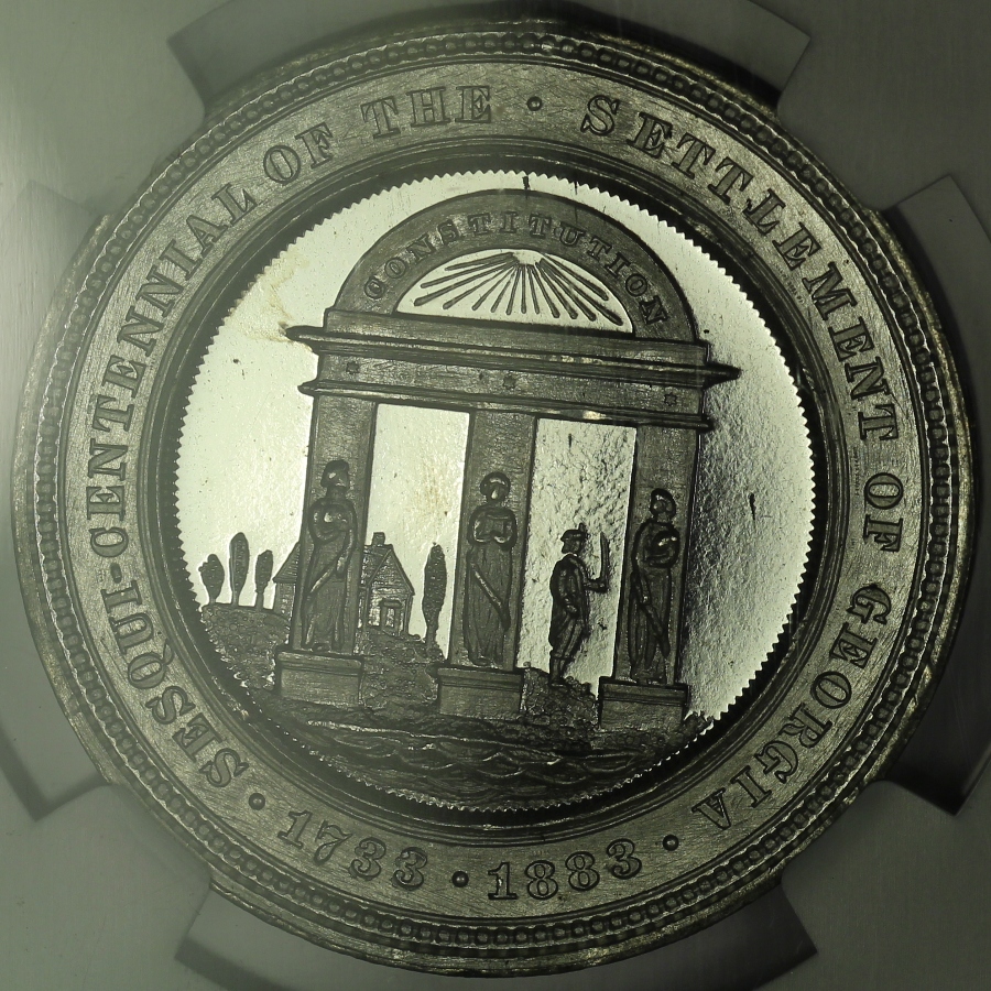 | This high-relief medal was issued for the sesquicentennial of the settlement of Georgia and is listed as HK-595 in the Hibler-Kappen book on So-Called Dollars. The 1883 white metal example offered here has been graded MS65 by NGC and is encapsulated in a newer-style edge-view holder. The obverse design features a seated General James Oglethorpe in very high relief. The reverse shows an extremely detailed version of the Georgia State Seal. The piece has a few minor handling marks scattered about and a single rim hit at the upper reverse, but you will not likely find a finer example anywhere. Though it was not given a PL or DPL designation by NGC, the fields of this bright white piece are clearly deeply mirrored. This is the sole finest known example of the HK-595 graded by NGC, with no other examples grading higher. Here is your opportunity to get the finest known example of this so-called dollar. |