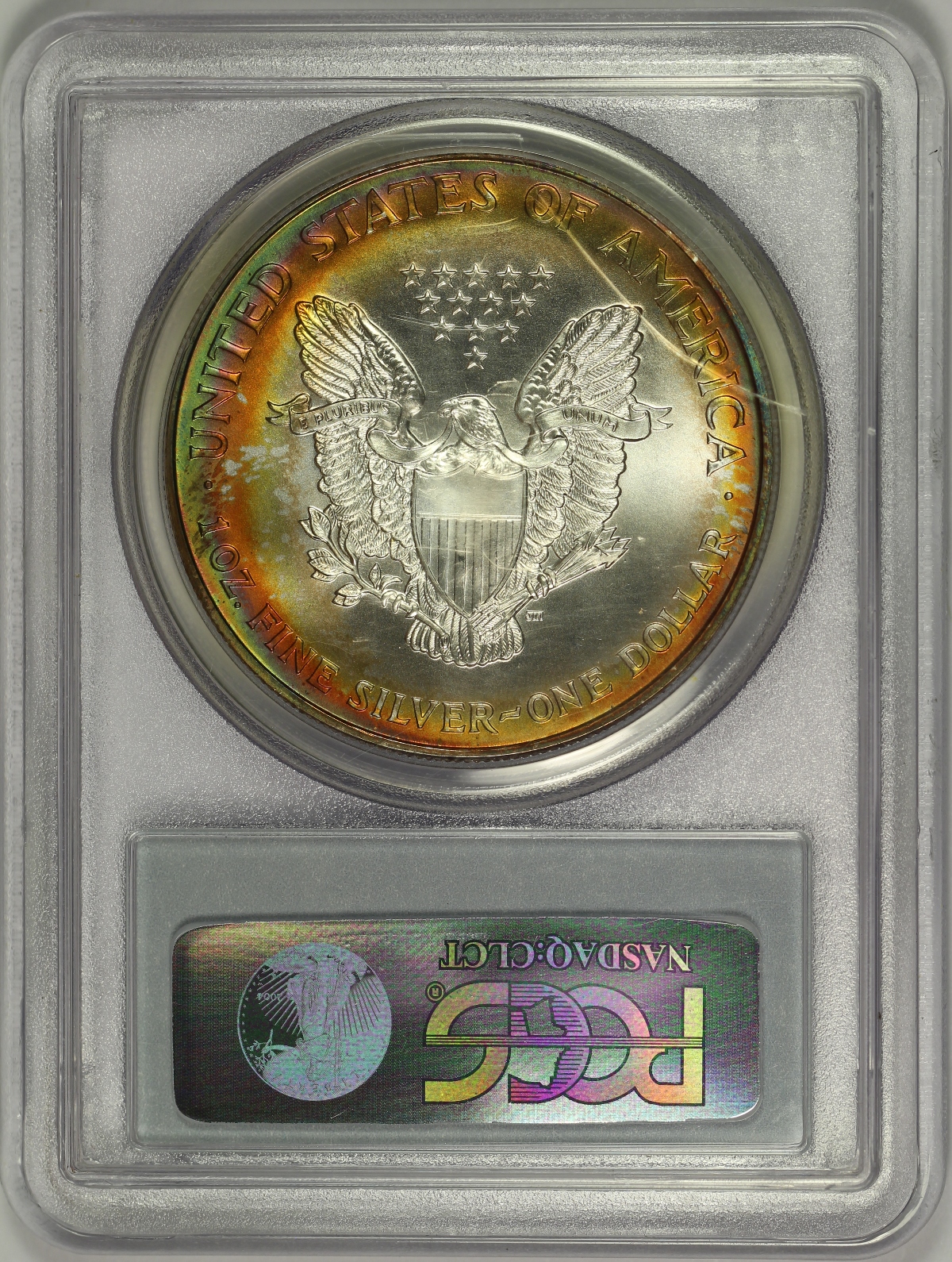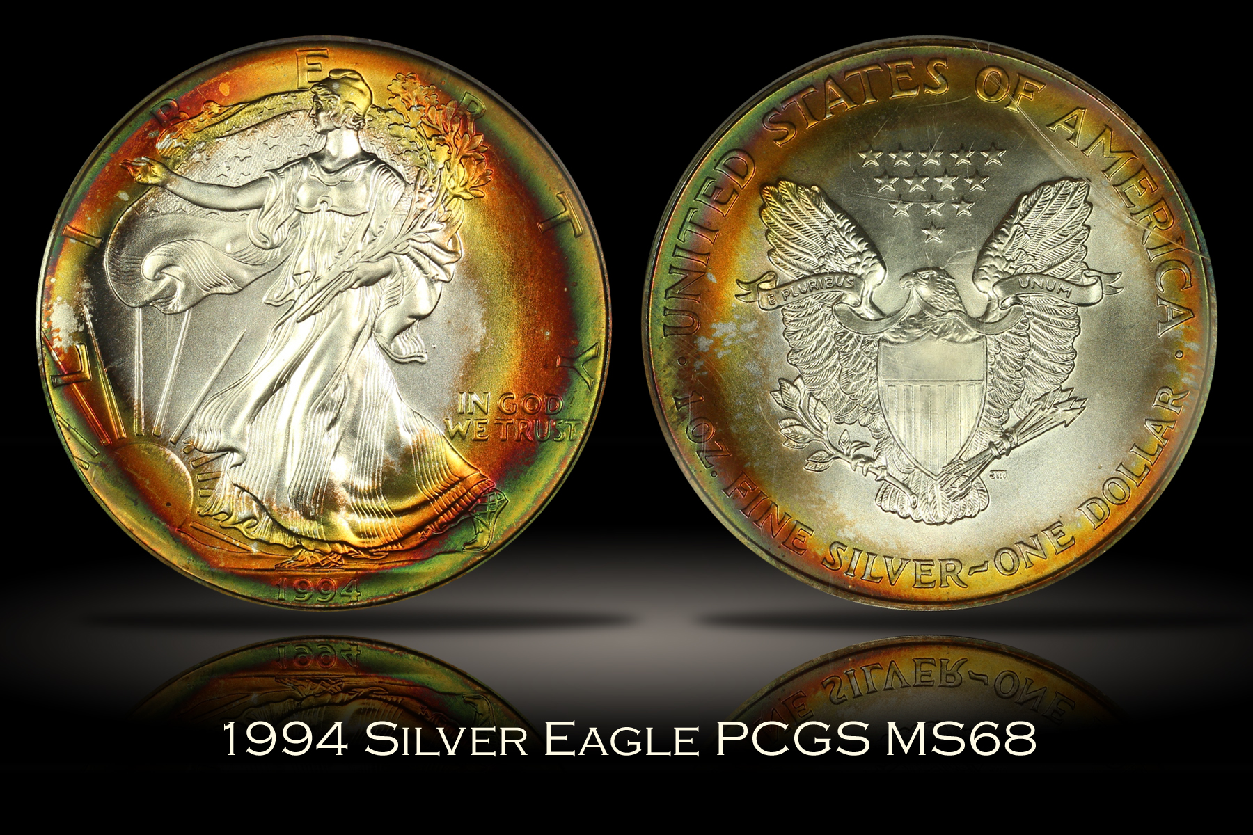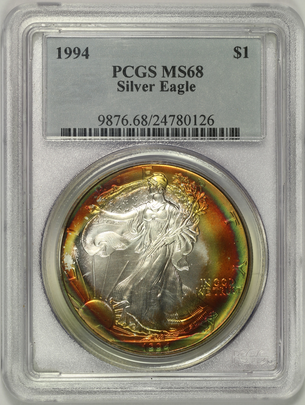 | This is a spectacularly toned one ounce .999 fine 1994 Silver Eagle which as been graded MS68 by PCGS. Colorfully toned Silver Eagles can be found as pure silver is quite susceptible to toning. However, finding an example with attractive color on both sides of the coin is more difficult. The example here has amazing vibrant rainbow color that shows nearly the full spectrum of color. A very strong band of bright green color is found along the rim and is especially attractive. The central areas of each side remain bright white and untoned. Please note there is a light scratch on the reverse side of the holder which shows in the images, but the coin itself is not scratched. One of the most attractive and vibrantly toned Silver Eagles I have handled in some time. |