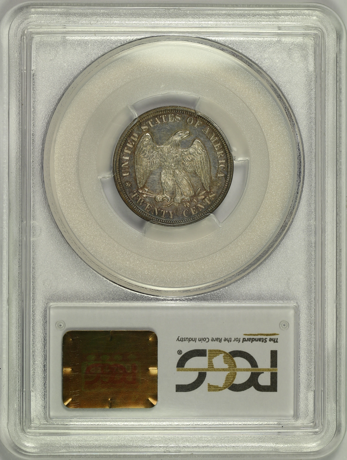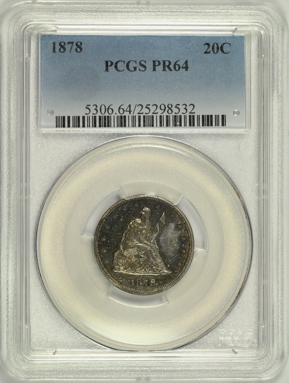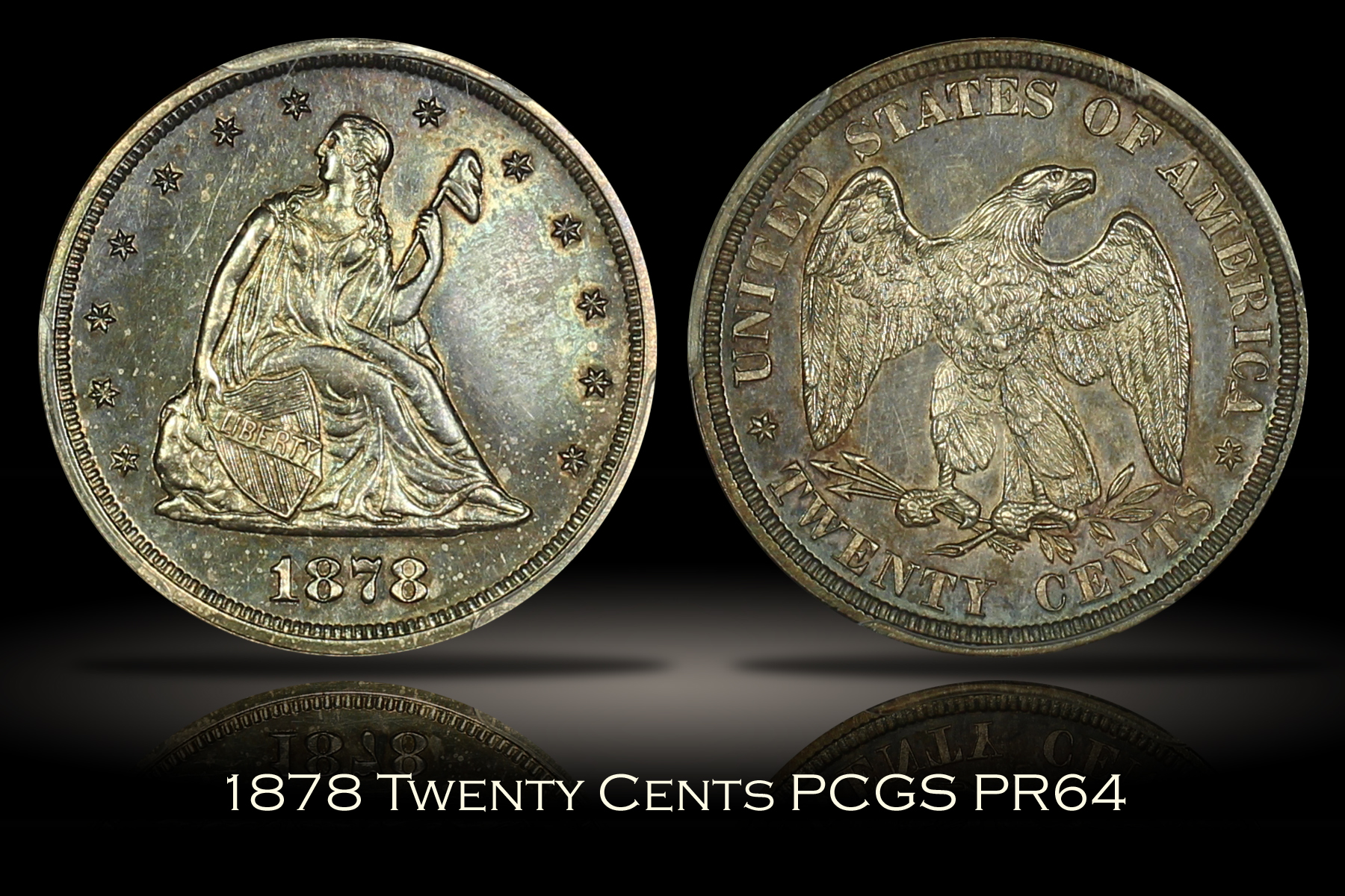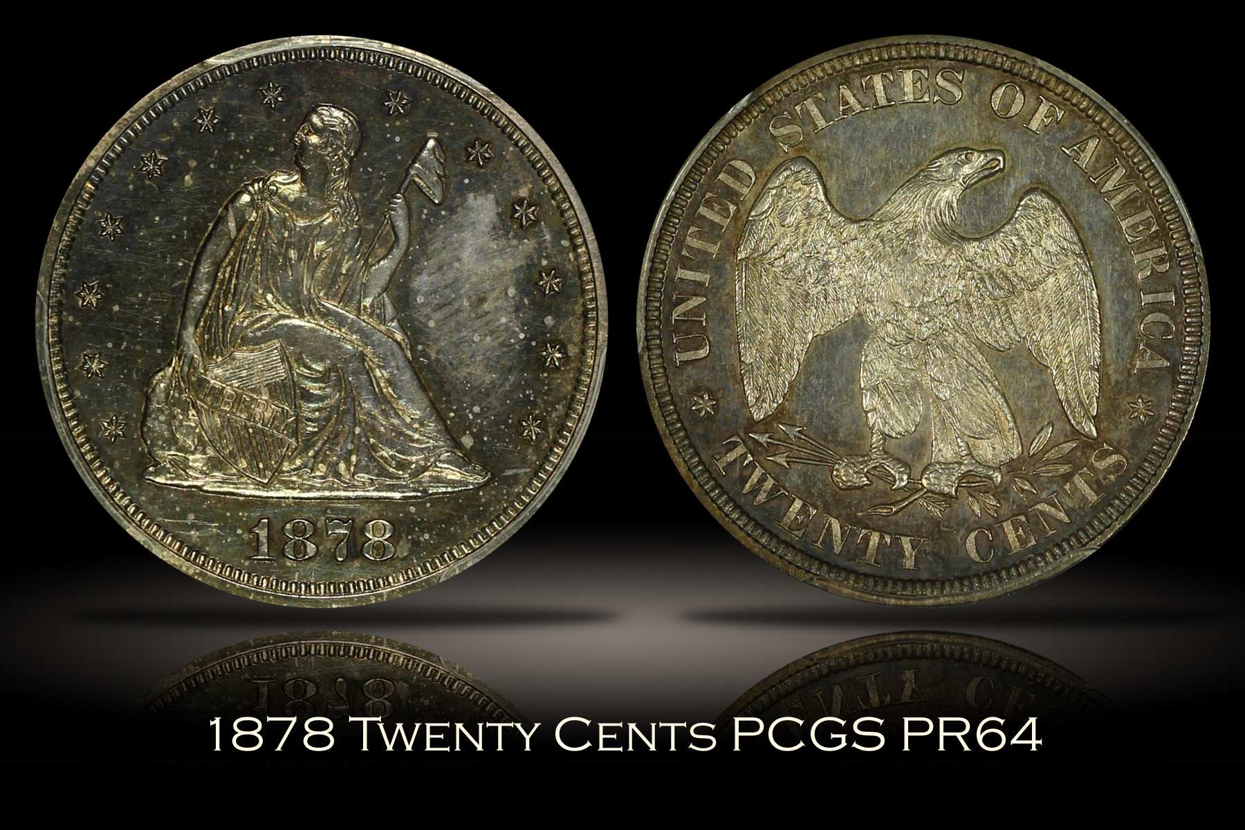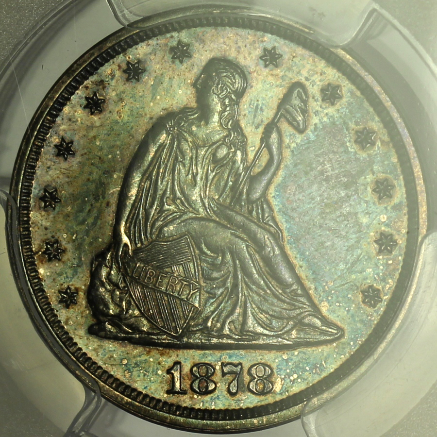 | Twenty Cent pieces were only minted for a total of four years, 1875 to 1878. The final two years of which, 1877 and 1878, were issued in proof only by the Philadelphia Mint with relatively low mintages. Here is an 1878 Proof Twenty Cent Piece which has been graded PR64 by PCGS and is encapsulated in one of the newer-style edge-view holders. With a mintage of only 600 coins, the 1878 proof twenty cent is a scarce coin in any grade. The obverse is a medium to dark grey and purple color for the most part, but there are hints of lighter blue and green colors when viewed under magnification. There is also some very light spotting across the obverse and what appears to be a light fingerprint in the right field, likely limiting the grade of this piece as there are otherwise no marks or hits of note. The reverse is quite attractive with a fairly even medium grey and purple color. The eagle on the reverse also shows considerable cameo frost which further adds to the eye appeal. As a proof coin, the surfaces are quite reflective making accurate photography especially difficult. For that reason, I have included several photos with different lighting as well as a short video of this coin. A decent overall proof example of the low mintage final year twenty cent piece.