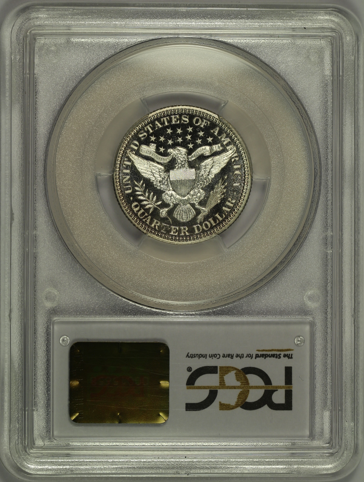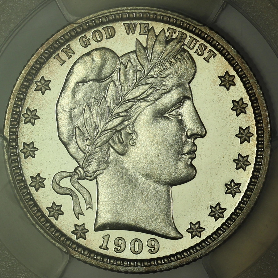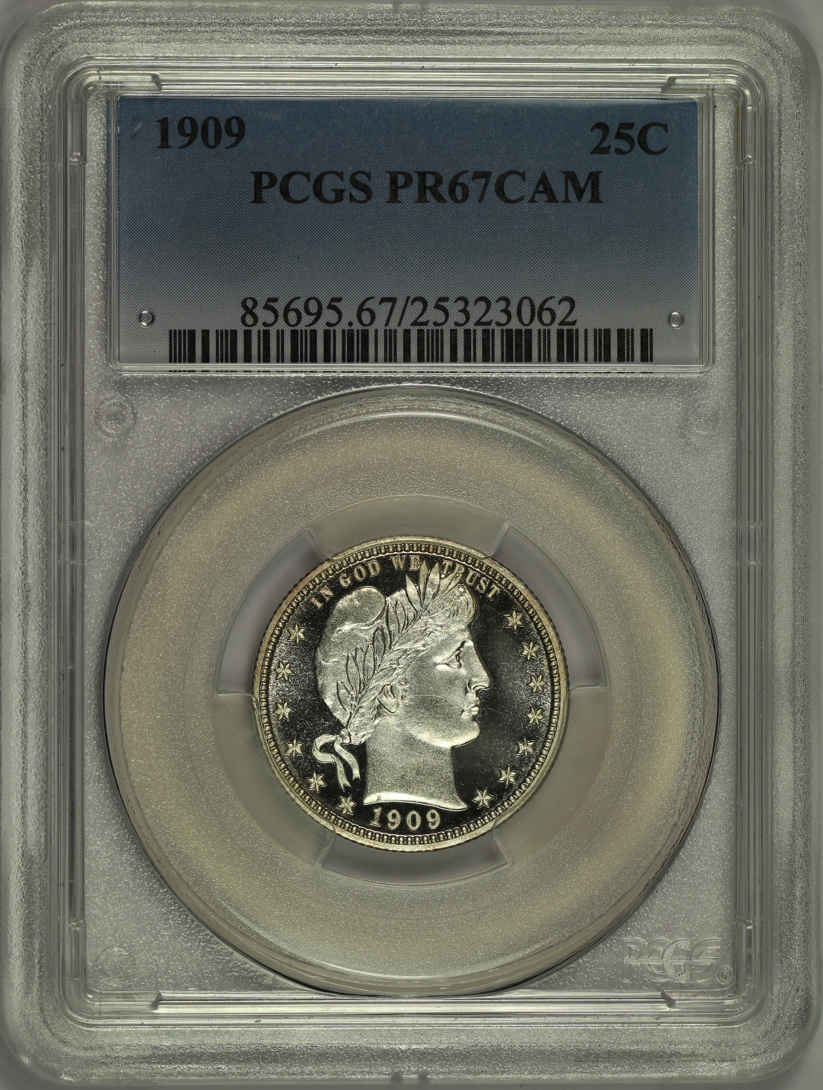 Here is a 1909 Proof Barber Quarter which has been graded PR67CAM by PCGS and is encapsulated in one of the newer-style edge-view holders. This coin is amazing. The proof mirrored fields on both sides of the coin are deep and the devices on each side are quite frosty. From what I have seen in other proof Barber Quarters, this piece is very close to meeting the standard for DCAM, yet it only received the CAM designation from PCGS. In hand, the coin appears to be virtually flawless. Upon a closer inspection, there are a few light hairlines on the obverse on Liberty’s cheek and one small scratch just above Liberty’s eye that is unnoticed until you tilt the coin at the perfect (or maybe it should be imperfect) angle. The 1909 proof Barber Quarter had a total mintage of only 650 coins and it is a certainty that only a small fraction of those have survived to this date in this condition. At PCGS, a total of five (5) examples have been graded at the PR67CAM grade with just two (2) coins grading higher at PR67+CAM; no examples of this date have received the DCAM designation at PCGS. All said, the eye appeal of this high grade proof coin is spectacular and it would be the star of just about any collection.