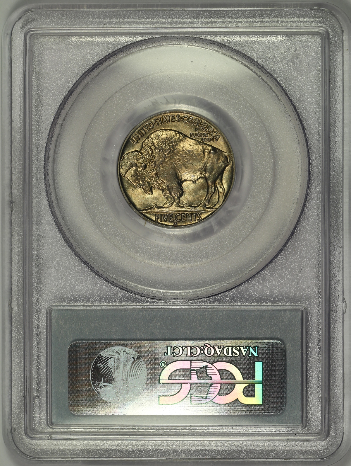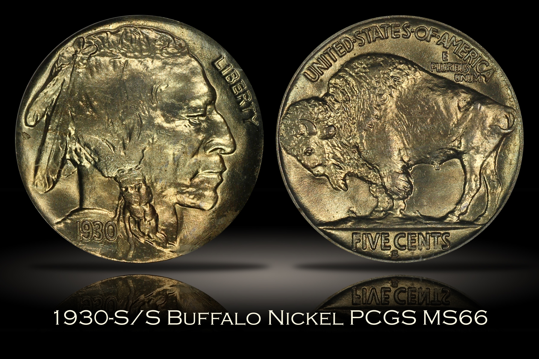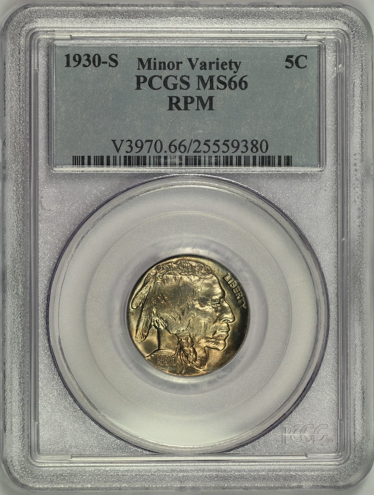 | This 1930-S/S Buffalo Nickel has been graded MS66 by PCGS. The coin is also attributed on the label as being an RPM variety as it has a strong repunched S/S mintmark. Although it is difficult to see in my photos, there is an underlying S mintmark just to the west and what appears to be another underlying S mintmark just to the south of the overmintmark. In researching this coin, I found there are several known RPM varieties of this date. While I am not certain as to which specific RPM variety this coin is, regardless of which RPM variety this coin is, it is likely to be the finest known example at the MS66 grade. Moreover, even if the RPM variety is of little interest to you, this coin is a wonderful bright and lustrous untoned example of the date. |