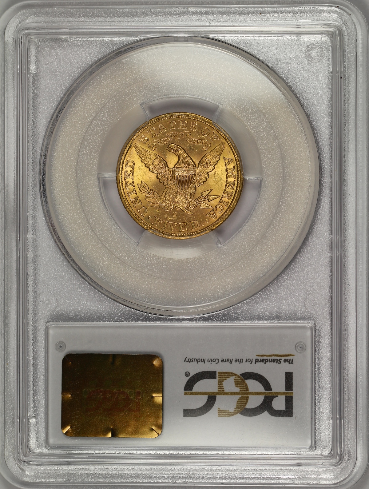 This 1903-S $5 Gold Liberty Half Eagle has been graded MS64 by PCGS and is encapsulated in one of the newer-style edge-view holders. Great color with a slightly satiny luster. Just a couple minor marks too many for the coin to earn the gem grade. |