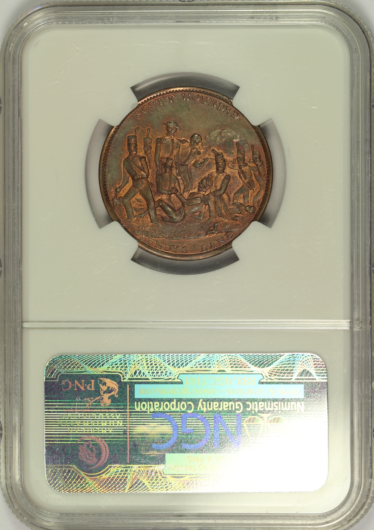 | General Winfield Scott was the longest serving generals in American history. Serving from the War of 1812 through the Civil War and serving under all Presidents from Thomas Jefferson to Abraham Lincoln. In 1852, General Winfield Scott was the presidential nominee of the Whig Party and was ultimately defeated by Franklin Pierce. Here is an (1852) Winfield Scott Campaign Token that has been graded MS64RB by NGC and is encapsulated in one of the newer-style edge-view holders. This piece is struck in copper and is cataloged as DeWitt-WS-1852-12 as indicated on the label. This piece is also from the famous John J. Ford Collection as referenced on the label. The medal retains a great deal of bright red copper color and is slightly prooflike in appearance. There is minimal spotting and just a few light marks of note. The obverse features the profile of Scott and the reverse is a detailed image of Scott being wounded during the Battle of Lundy’s Lane during the War of 1812. An excellent example of a Winfield Scott presidential campaign medal. |