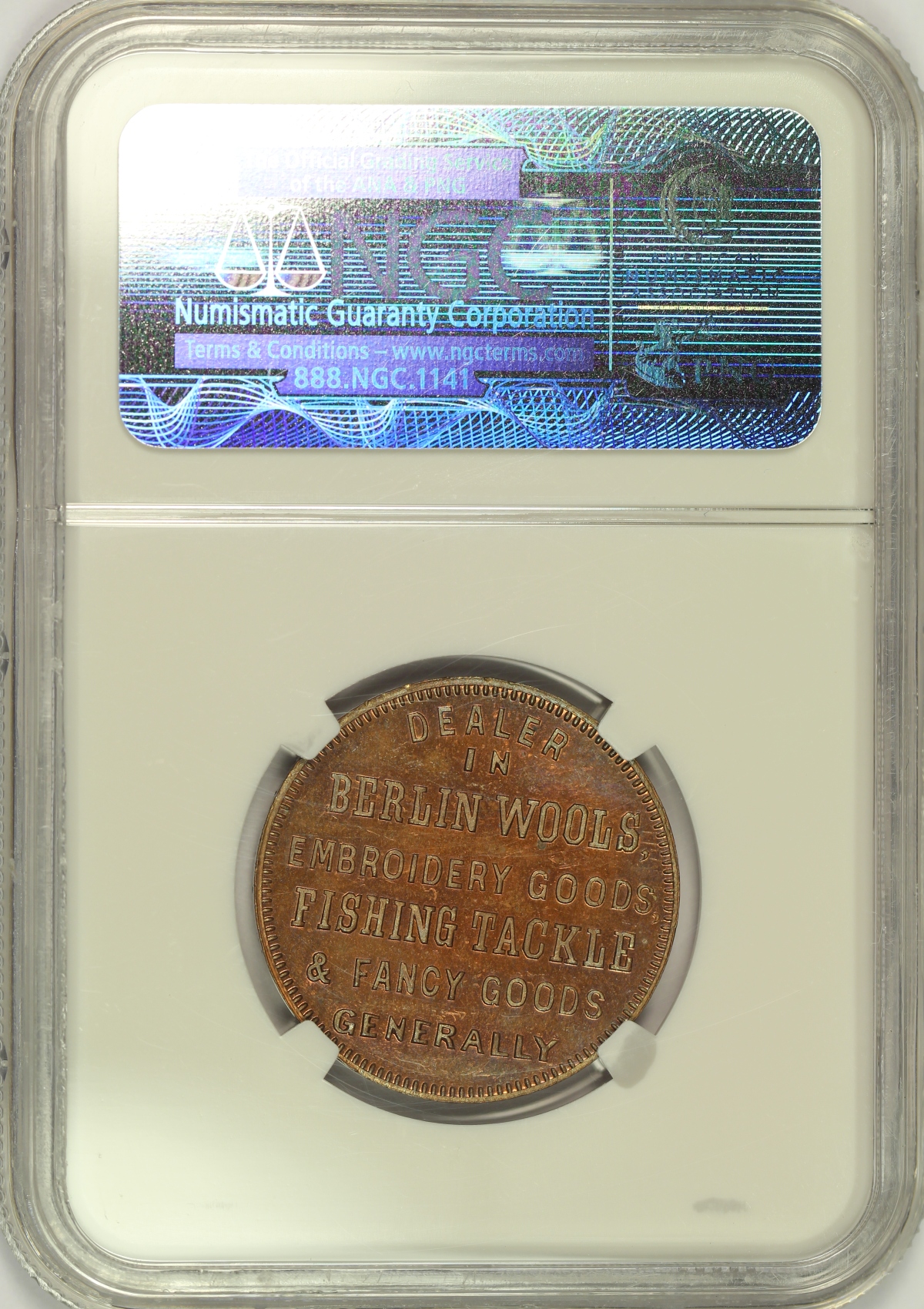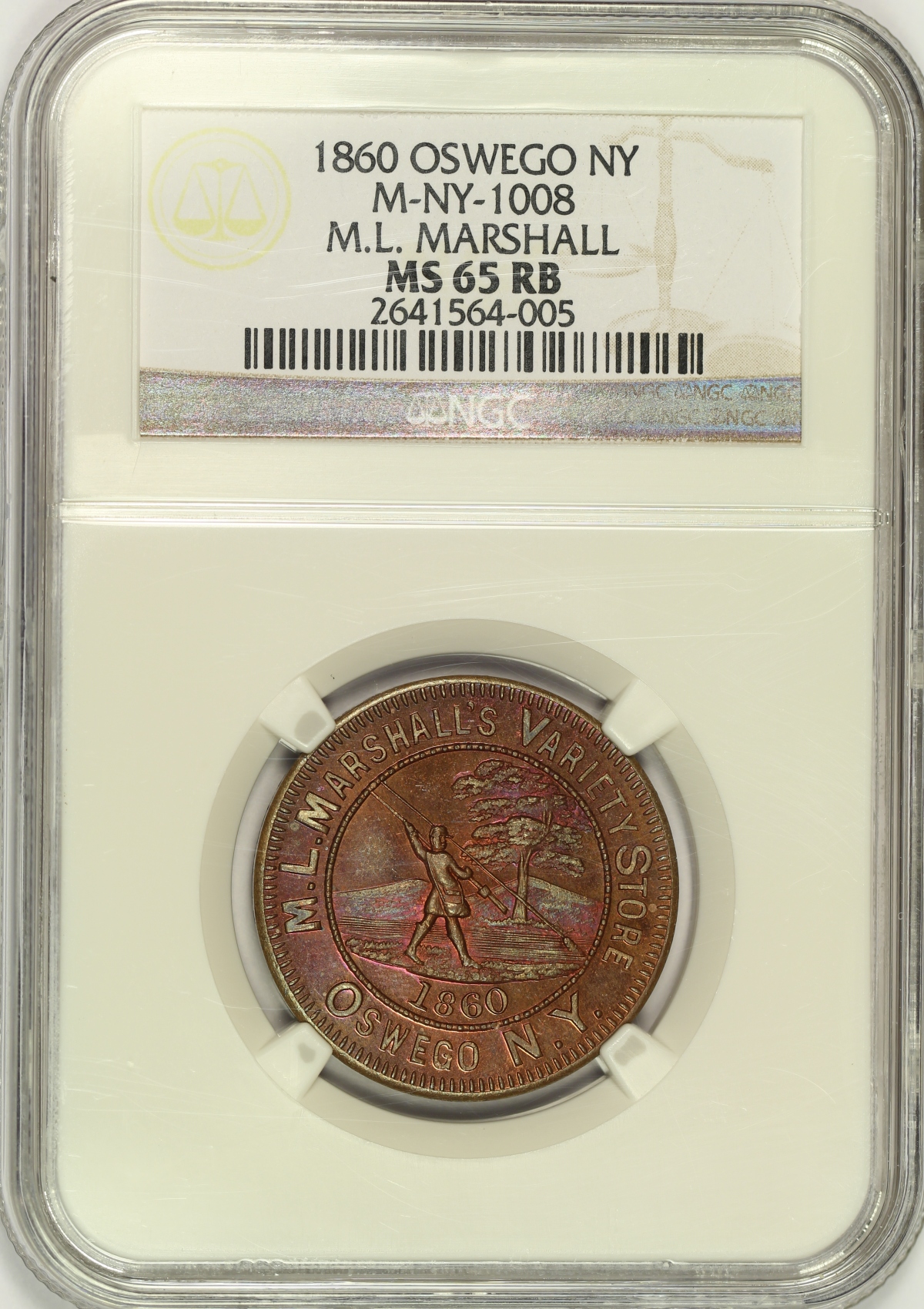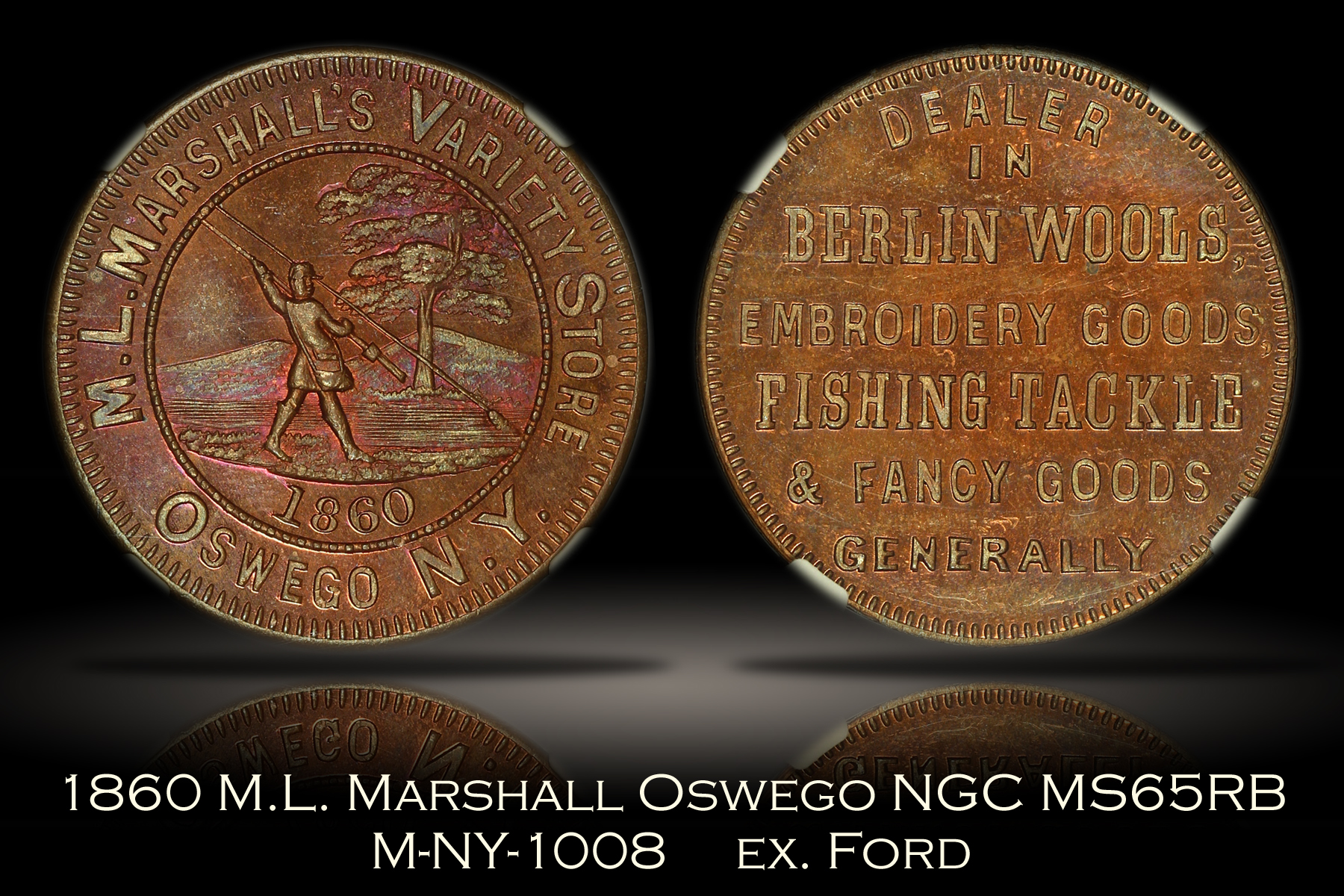 | This 1860 M.L. Marshall’s Variety Store merchant token from Oswego, New York has been graded MS65RB by NGC and is encapsulated in one of their newer-style edge-view holders. This is the scarce version of the token struck in copper which is attributed as M-NY-1008 as indicated on the NGC label. This piece is also from the famous John J. Ford Collection although this fact has not been referenced on the label. The spectacular obverse design with the fly fisherman makes this one of the more popular merchant tokens. This example has extraordinary eye appeal with semi-prooflike fields that pop with amazing colorful toning that is mostly purple and pink but also shows areas of blue and green color. Much nicer in hand than photos could possibly show. |