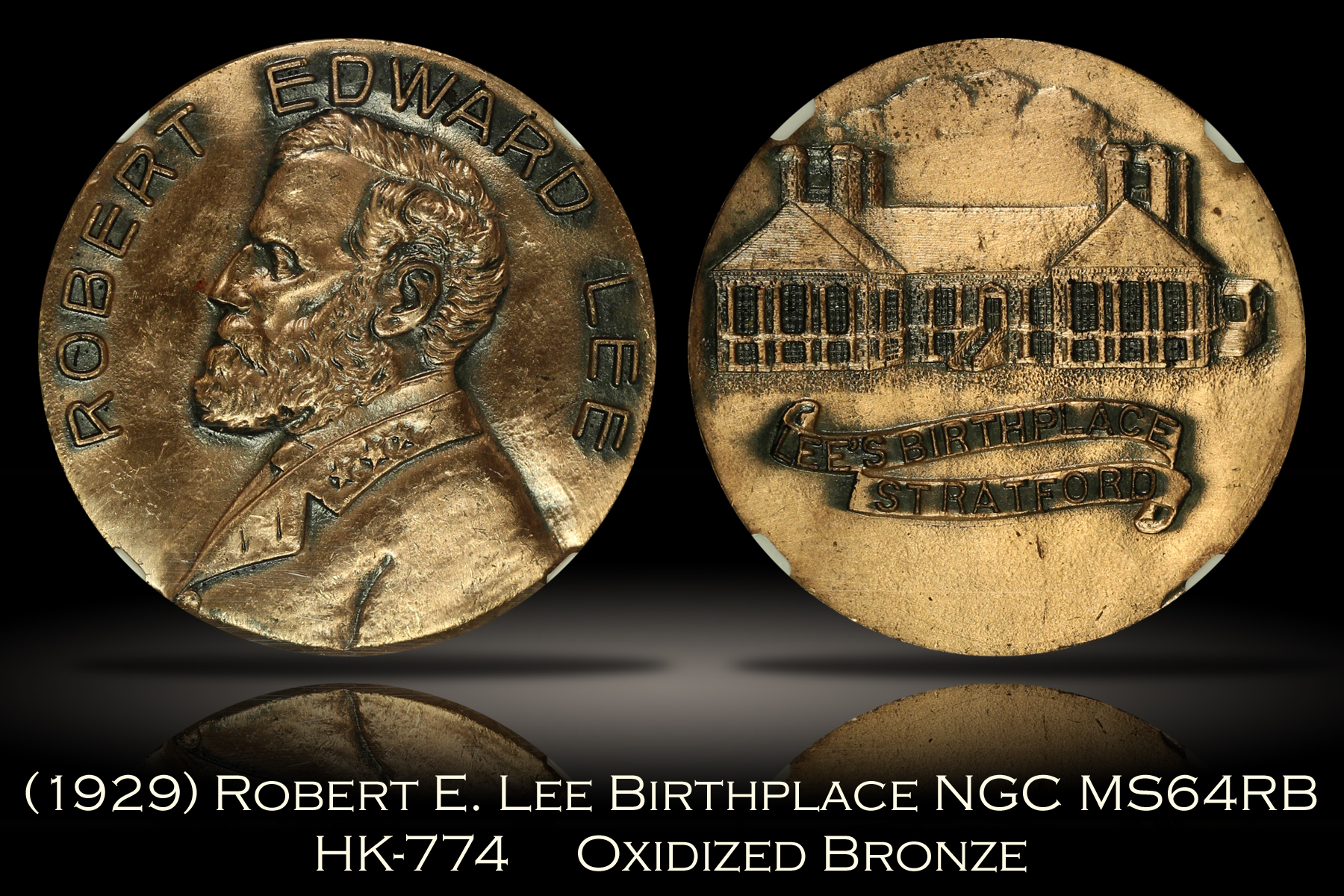 | This so-called dollar was issued in or about 1929 for the Bicentennial of General Robert E. Lee’s Birthplace in Stratford, Virginia. The medal is listed as HK-774 in the Hibler-Kappen book on So-Called Dollars and has been graded MS64RB by NGC and is encapsulated in one of the newer-style edge-view holders. The medals were manufactured from bronze and were treated to give them an oxidized or antiqued finish. Because of that treatment, these medals sometimes have the look of an improperly cleaned specimen, but that is how they were issued. A few light marks are found on each side of the piece, seemingly keeping it from a gem grade. An overall nice example of this so-called dollar. |