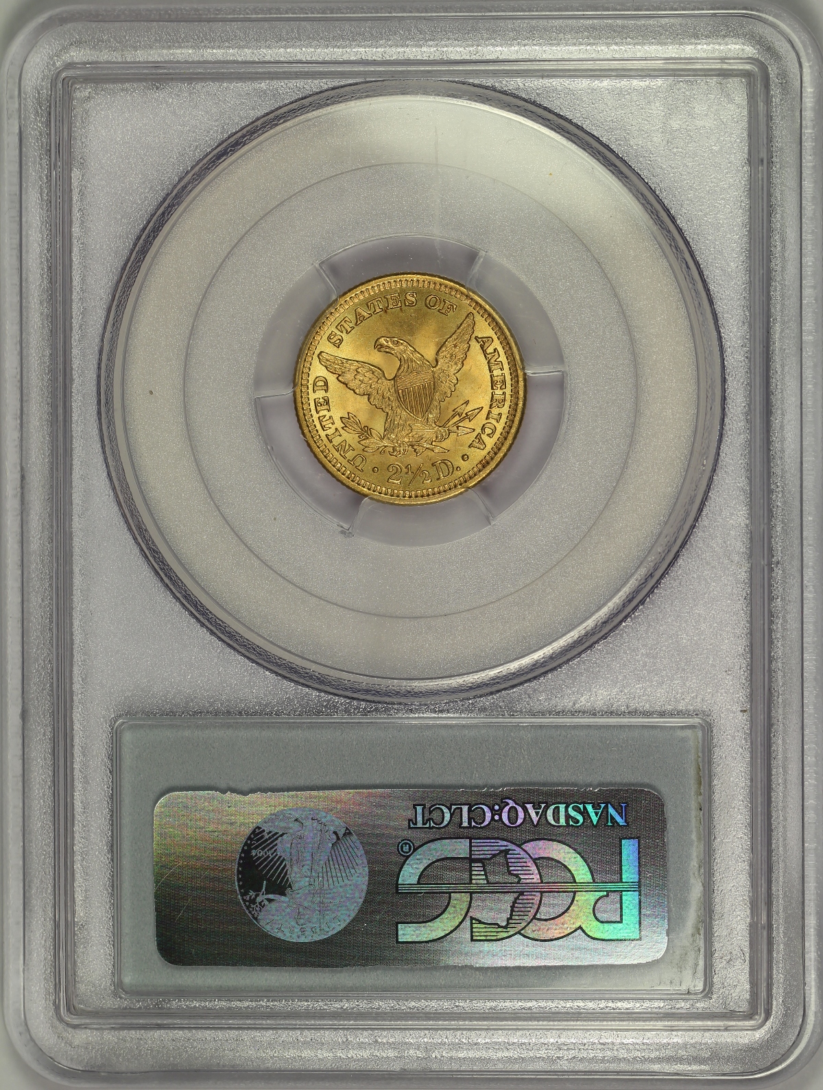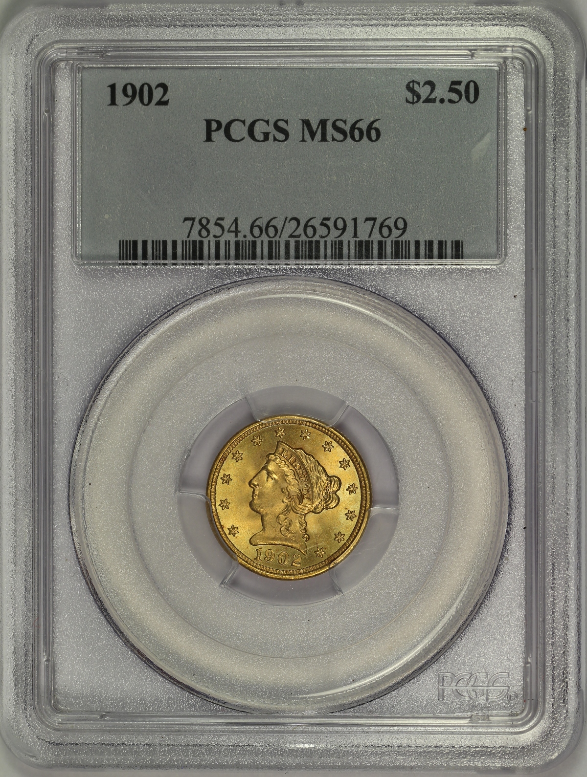 | Mint state Liberty Head Quarter Eagles are not prohibitively rare, especially in the later dates. However, once you start talking about coins at the very top of the grading scale, then even the most common of dates is a condition rarity piece. This 1902 Liberty Head $2.5 Gold Quarter Eagle has been graded MS66 by PCGS and is encapsulated in one of the newer-style edge-view holders. The coin is a bright golden lustrous piece with a beautiful overall look. The coin has just a few very light hits and marks scattered about, but nothing too major. Overall, a nice high-grade Liberty Head Gold Quarter Eagle. |