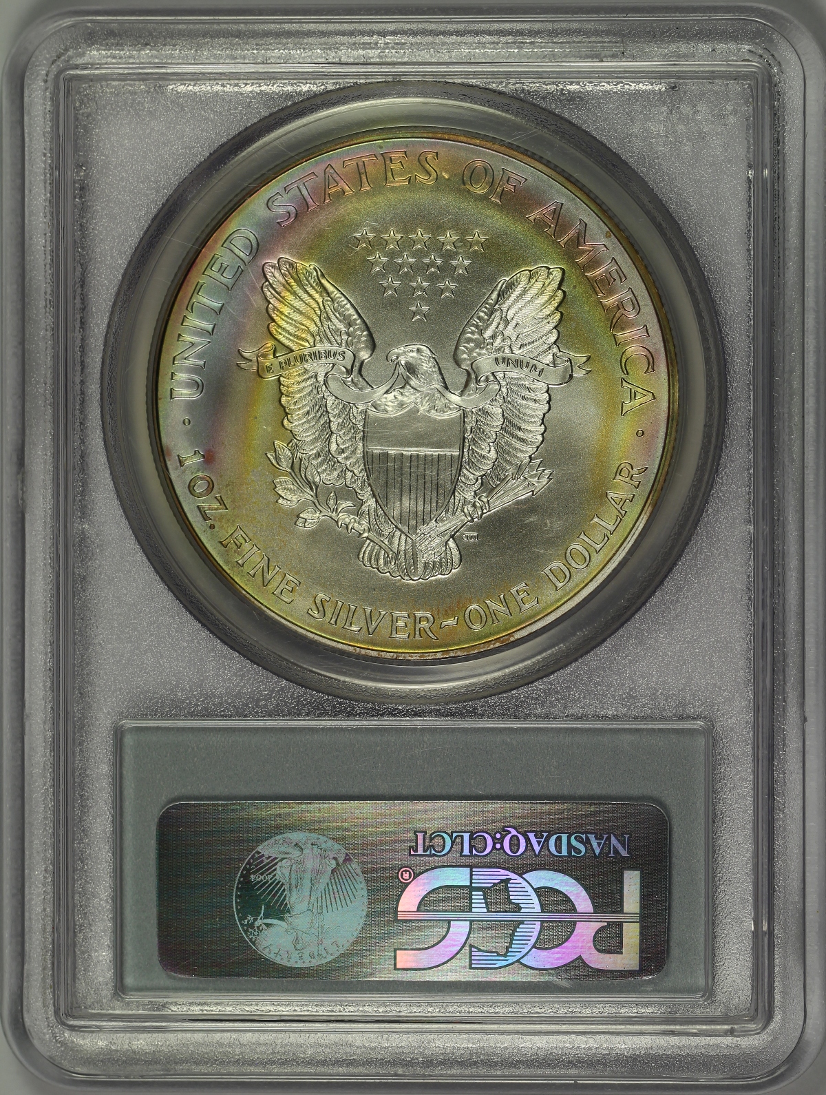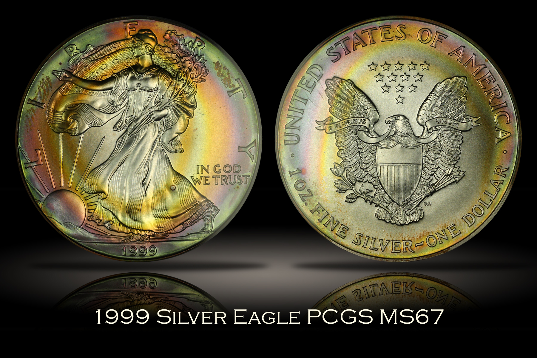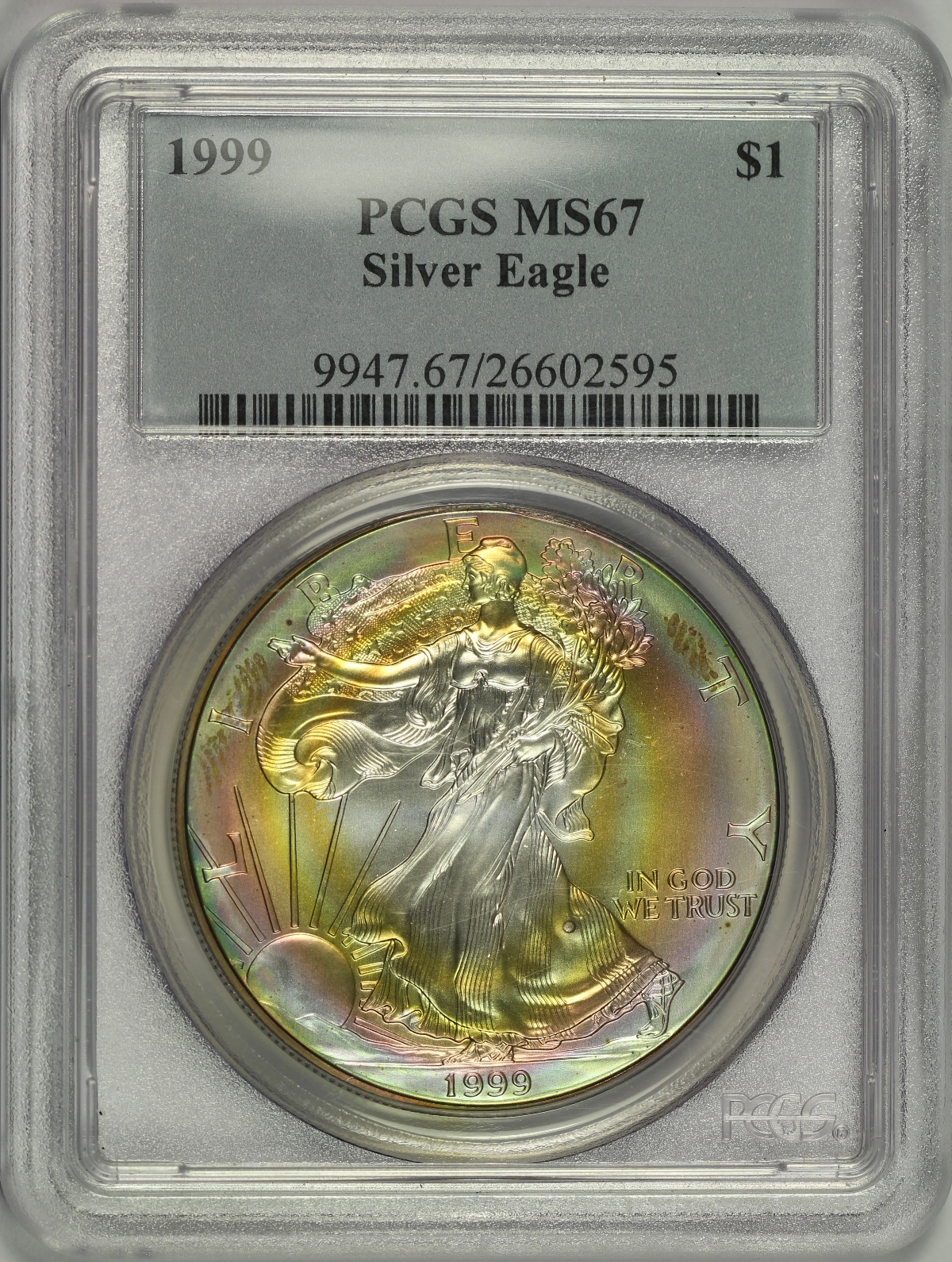 | This attractively toned one ounce .999 fine 1999 Silver Eagle has been graded MS67 by PCGS. Colorfully toned Silver Eagles can be found as pure silver is quite susceptible to toning. However, finding an example with eye appealing color on both sides of the coin is more difficult. The example here has wonderful pastel colors that cover most of each side in a target like toning pattern. Just the very center of each side of the coin remain untoned, with the remainder of the surfaces covered in bands of green, blue, pink and golden bands of color. Just a couple of darker areas of toning on the obverse keep the coin from a perfect overall look. A very pretty overall example of the popular Silver Eagle. |