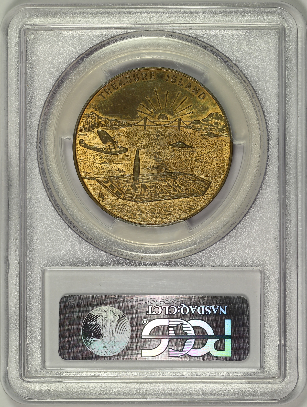 | The Golden Gate International Exposition was held in San Francisco in 1939 and 1940. Several medals were produced to commemorate this exposition which celebrated the completion of the Golden Gate Bridge. One of the most popular of those medals is the so-called Treasure Island Dollar. The gilt-bronze version of the 1939 Treasure Island Dollar is listed as HK-481 in the Hibler-Kappen reference on So-Called Dollars. This example of the 1939 HK-481 medal has been graded MS62 by PCGS and is encapsulated in a newer-style edge-view holder. The obverse features the official emblem of the exposition and the reverse shows a bird’s eye view of Treasure Island, the man made island where the exposition was held. The piece is in decent condition with some of the gilt finish faded away. The PCGS holder also has a few light scuffs in the plastic which show in the photos. |