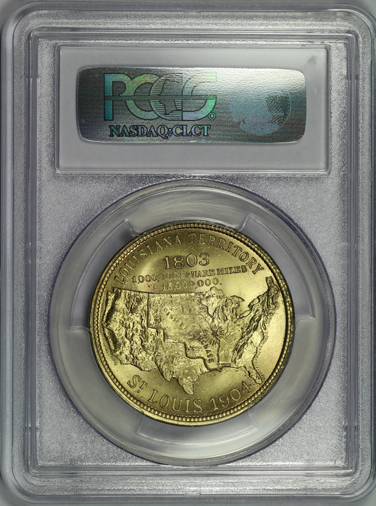 | The 1904 Louisiana Purchase Exposition Official Souvenir Medal was produced for the 1904 St. Louis fair where the centennial of the Louisiana Purchase was celebrated. These official souvenir medals were struck in various metal compositions including silver, gold, gold-plated bronze, copper, yellow-bronze, bronze and gilt. Approximately 90,000 medals were struck in total at the Mint Exhibit located on the fairgrounds. This example of the 1904 Louisiana Purchase Exposition Official Souvenir Medal was struck in Yellow-Bronze and is listed as HK-302 in the Hibler-Kappen reference on So-Called Dollars. This 1904 HK-302 Medal has been graded MS65 by PCGS and is encapsulated in a newer-style edge-view holder. The medal is very bright and lustrous on both sides and has a very even bright yellow-gold color with no spotting. There are some light handling marks on the high points of the obverse which features the busts of Jefferson and Napoleon, but they do not overly distract. The reverse, which features a map of the United States and an outline of the Louisiana Purchase, is very attractive and nearly mark free. Please note that there are some light scuffs on the plastic holder which blur the photo slightly. To date, PCGS has only certified three (3) examples of the HK-302 in MS65 condition (including the present specimen) with no examples grading higher. A really nice overall example of this popular medal in the highest PCGS grade currently available. |