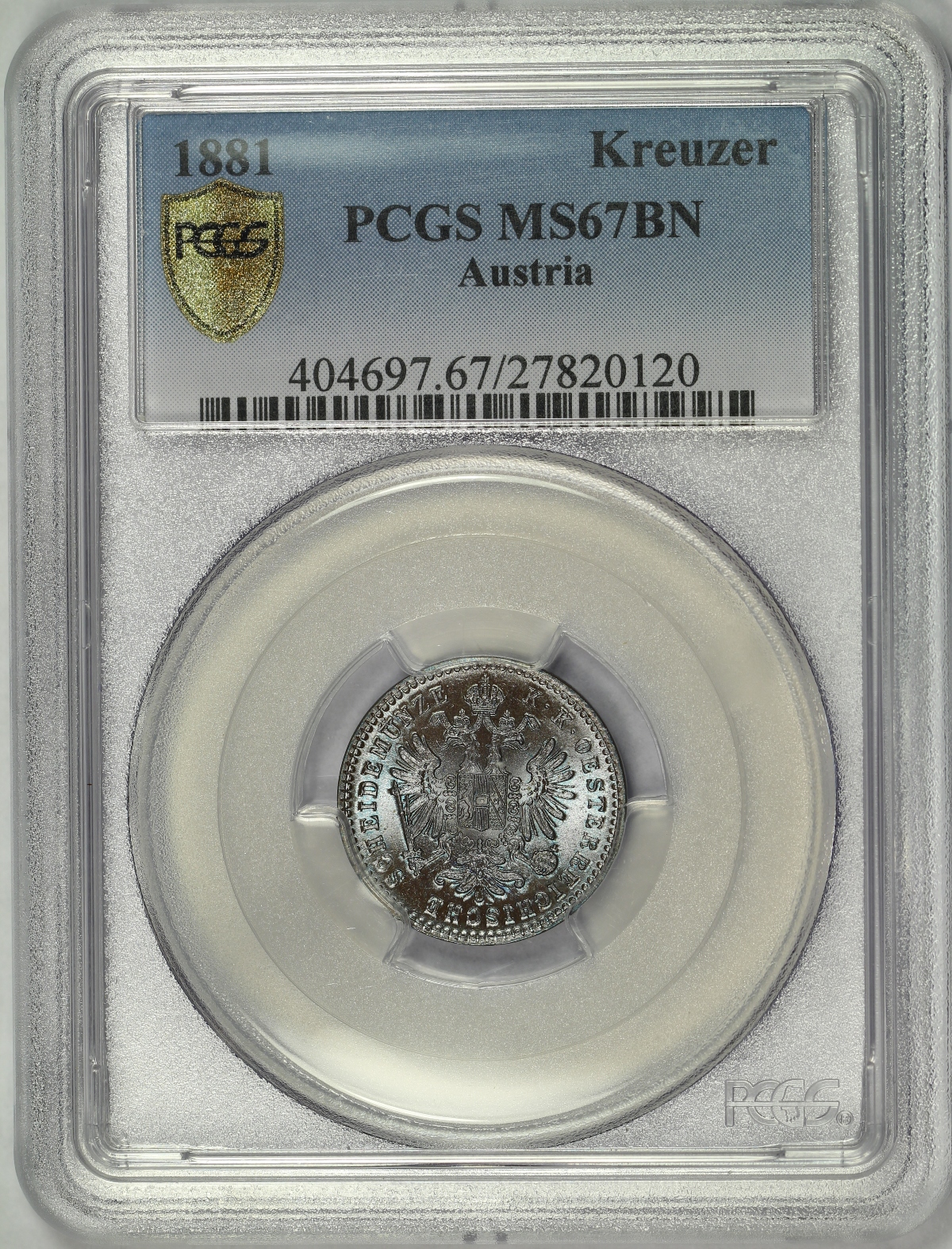 | An 1881 Austria Kreuzer which has been graded MS67BN by PCGS and is encapsulated in a newer-style edge-view holder. If you have been collecting certified coins for awhile, you will know that the MS67BN grade is rarely used, particularly by PCGS. Very few coins that receive the BN color designation lack the hits/marks and retain enough original mint luster to earn such a high numerical grade. MS67RD coins are plentiful, MS67RB coins are rare and MS67BN coins are almost unheard of. In summary, this coin is a blazer and has superb overall eye appeal. The luster is beyond amazing and nearly impossible to capture the look in a single photograph. The color is a deep blue and purple color that looks really nice