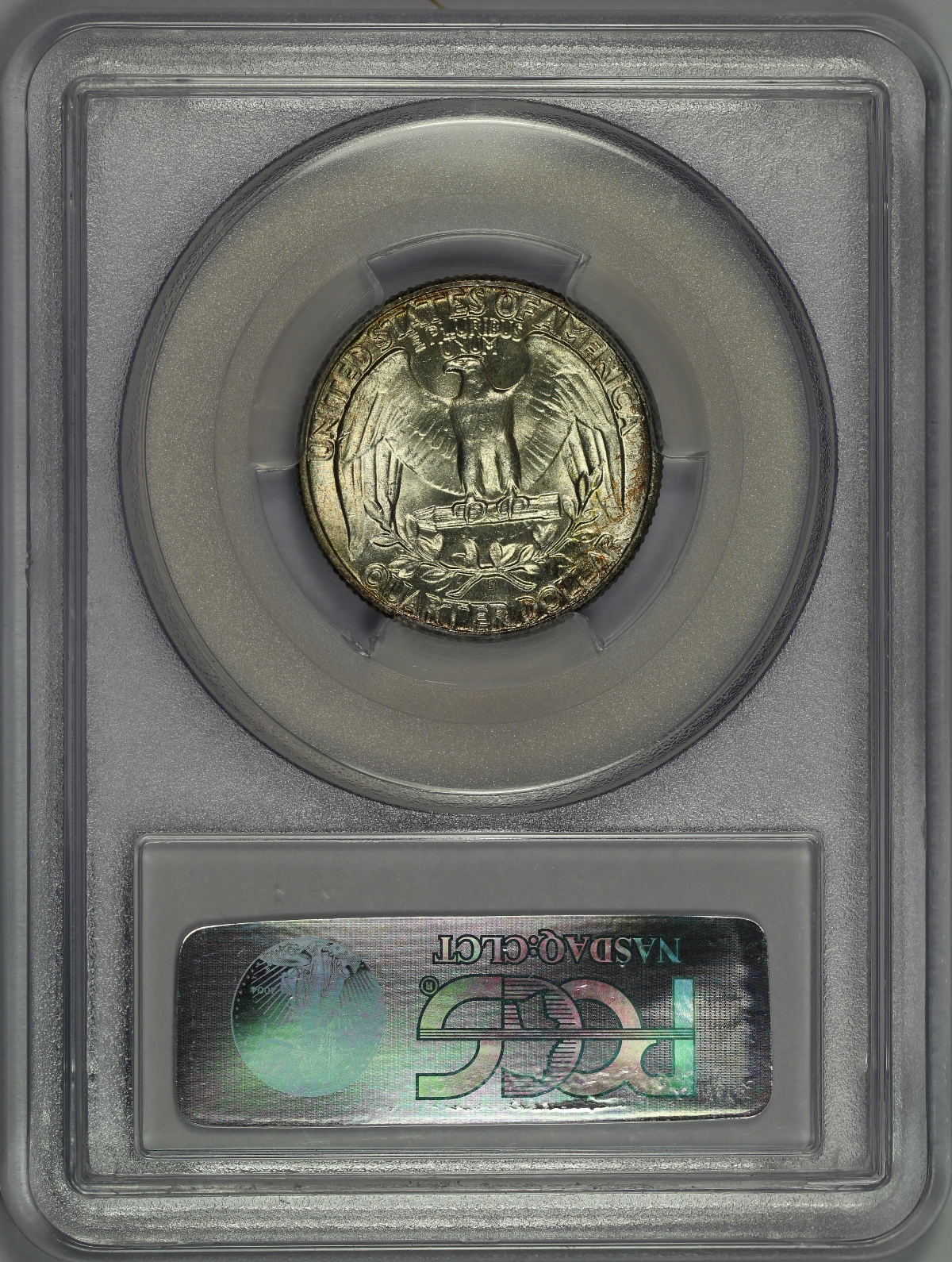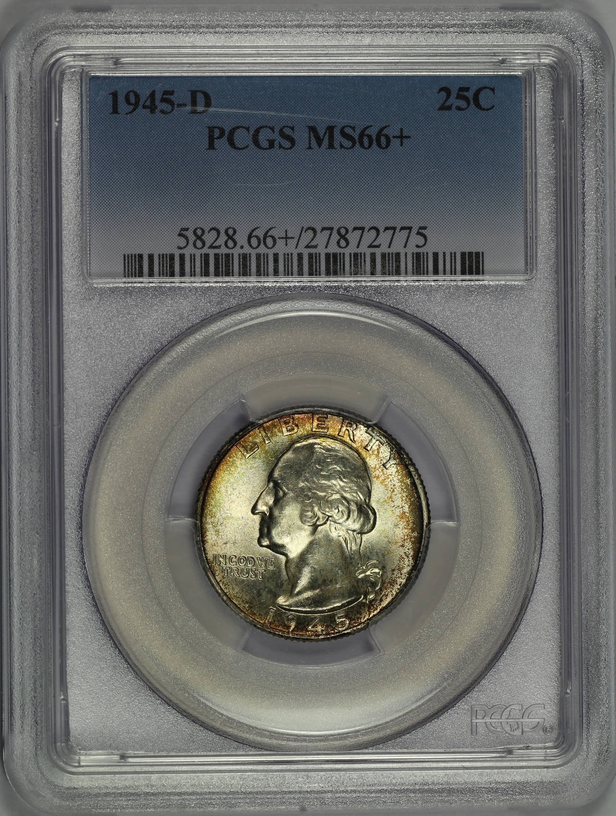 | This 1945-D Washington Quarter that has been graded MS66+ by PCGS and is encapsulated in a newer-style edge-view holder. This coin has strong original mint luster and light toning around the rims on both sides. Only a couple of very minor abrasions can be found under a close inspection. PCGS graded examples that grade only a half a point higher at MS67 typically sell for approximately $1,000. This coin is a relative bargain when compared to similar looking pieces grading only one-half of a point higher. |