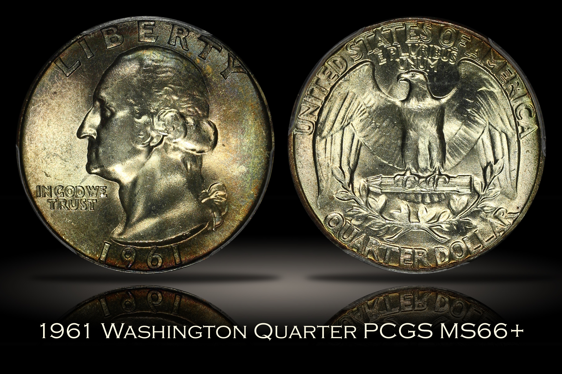 | Here is a 1961 Washington Quarter that has been graded MS66+ by PCGS and is encapsulated in a newer-style edge-view holder. The coin is very lustrous and has relatively few marks as the grade suggests. A professional image of the coin was also taken by PCGS for their CoinFacts service and that image is included below. The coin exhibits some nice toning, particular on the obverse around most of the rim. A few light abrasions on the high points of the design have likely kept the coin from grading even higher. PCGS has only graded five (5) examples of this date in higher grades, all of which are graded MS67 and have recently sold for prices of as low as $3,300 to nearly $10,000. This nicely toned and attractive example graded only one-half of a point lower is certainly a bargain at a fraction of the expense. |