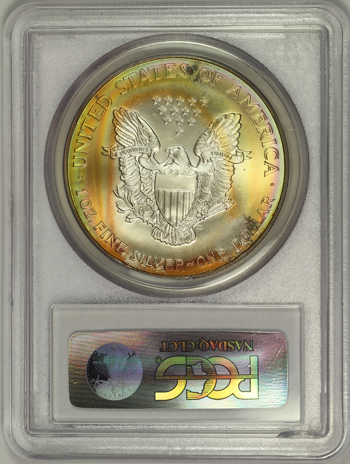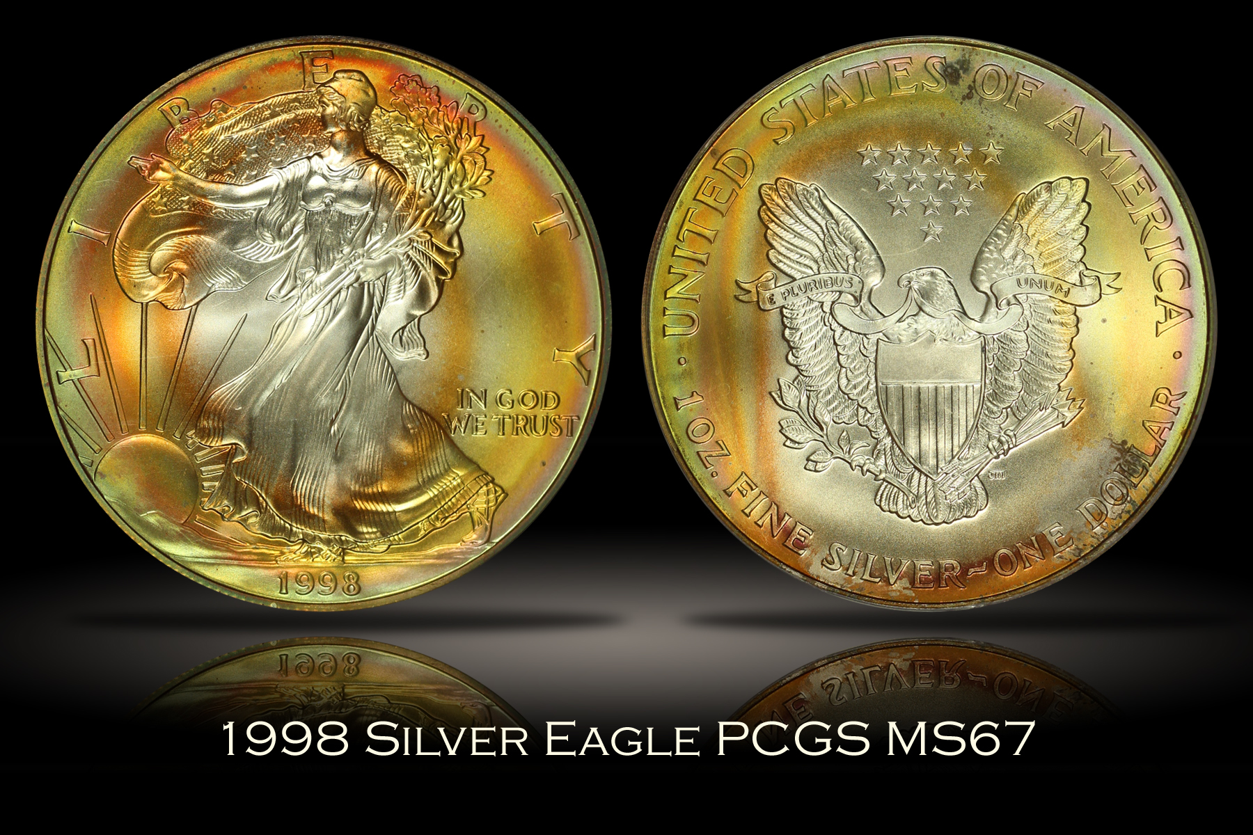 | This beautifully toned one ounce .999 fine 1998 Silver Eagle has been graded MS67 by PCGS. The example here has bright golden, orange and yellow colors that cover most of each side in a target like toning pattern. Hints of deeper green, pink and red color are also present, mostly along the rim of each side. The very center of each side of the coin remains untoned. Some minor spotting is found on the reverse, but the coin remains an impressive and beautiful example of the Silver Eagle with strong target toning. |