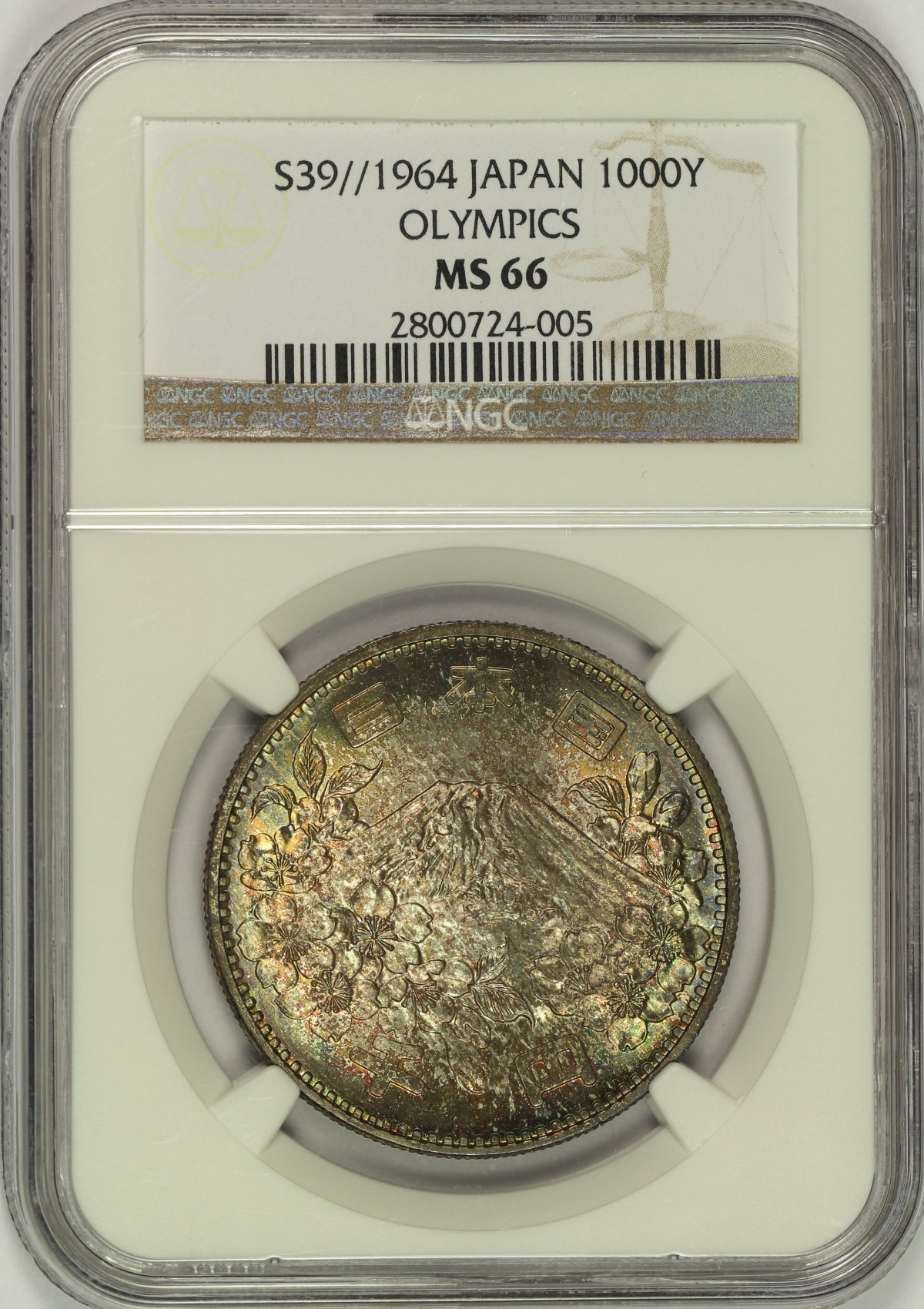 | Here is a 1964 Japan Olympics 1000 Yen which has been graded MS66 by NGC. Japan issued this silver commemorative coin to celebrate the 1964 Tokyo Olympics. The coin has a beautiful design featuring Mt. Fuji and cherry blossoms. Although a relatively common coin, they are seldom found like the example here with attractive toning on both sides. Colorful toning covers both sides of the coin and the mint luster is very strong as well. A wonderful high-grade example of the type. |