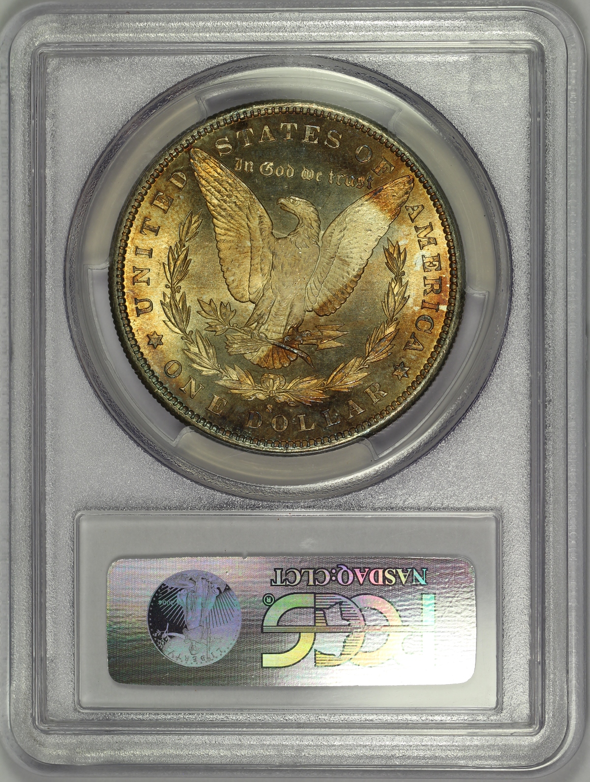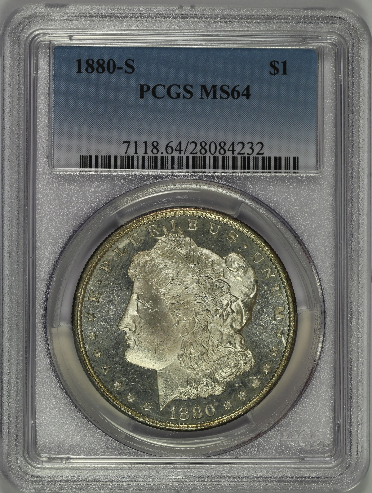 | Here is an 1880-S Morgan Silver Dollar which has been graded MS64 by PCGS and is encapsulated in a newer-style edge-view holder. This is not your average MS64 Morgan Dollar, however. The coin has strong prooflike fields on both sides, though seemingly just short of what is required to earn a PL designation from the grading service. The piece is bright white on the obverse and fully toned on the reverse. The reverse toning is mostly bright golden in color, but hints of orange, red and even blue are also present along parts of the rim. A beautiful near-gem Morgan Dollar with lots of flash and pretty color. |