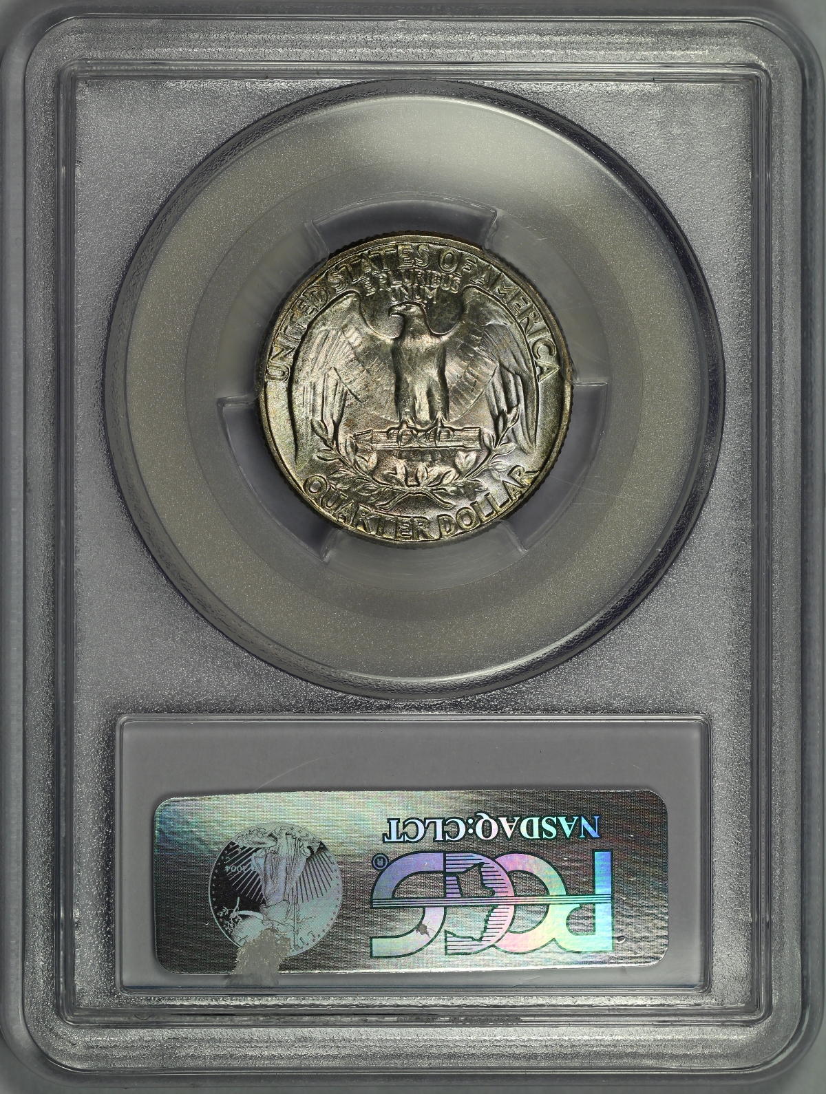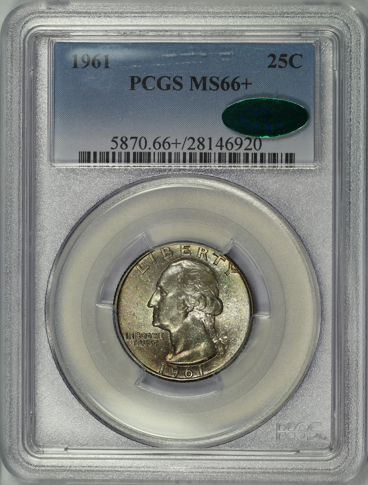 | Here is a 1961 Washington Quarter that has been graded MS66+ by PCGS and is encapsulated in a newer-style edge-view holder. The coin has also been certified by CAC as being solid for the assigned grade. The coin has medium grey toning over the entire obverse with hints of orange, green and blue color that pop through. The reverse is only lightly toned in comparison. Both sides have strong original luster that pops through the toning and only a couple of small marks on the high points of the designs. PCGS has only graded five (5) examples of this date in higher grades, all of which are graded MS67 and have recently sold for prices of as low as $6,000 to nearly $10,000. This example graded only one-half of a point lower seems like a bargain at a fraction of the expense. |