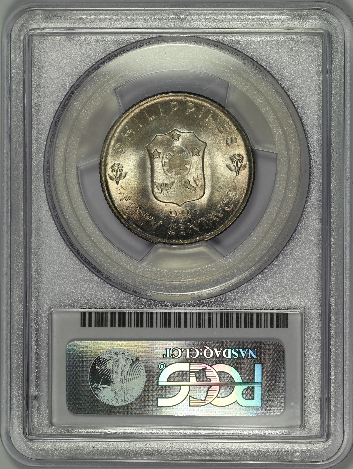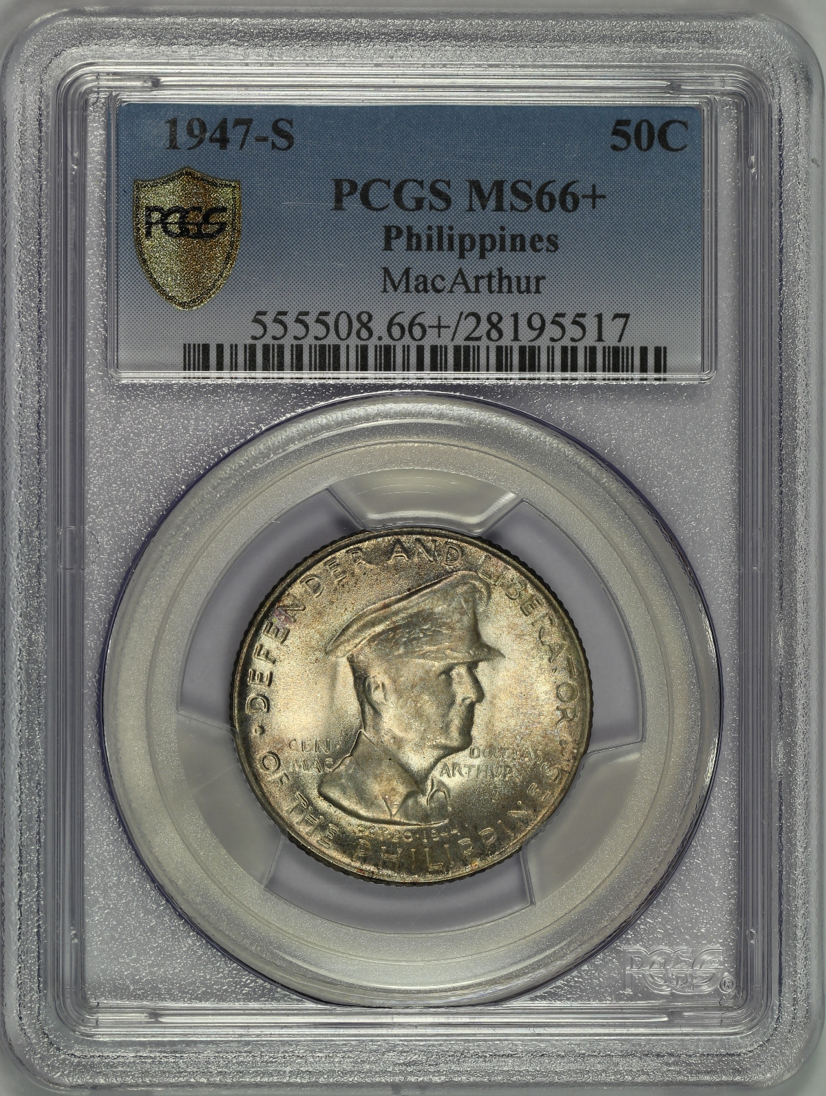 | The 1947-S MacArthur 50 Centavos is a silver coin minted at the San Francisco Mint for the Philippines who wished to honor General Douglas MacArthur following World War II. This 1947-S Philippines MacArthur 50 Centavos has been graded MS66+ by PCGS and is encapsulated in the newer-style edge-view holder. At the MS66+ grade, the coin ties one other coin as the highest graded example ever graded by PCGS with no examples grading higher. I recently sold the other MS66+ example and that coin is part of a matched toned set with a MacArthur Peso and the coin is not likely to be back on the market for quite awhile. The coin is very lustrous, lightly toned and virtually free of any noticeable marks or hits. Not only is the coin a top pop coin, but the coin also exhibits doubling on the obverse, particularly on the words “DOUGLAS MACARTHUR.” At first look, given the clear doubled die obverse, I believed the coin to be the Allen R-1a DDO variety. However, upon closer inspection, the coin also shows slight doubling on the reverse at the right stars of the shield and on the 7 of the date, indicating the coin is likely the Allen R-1c Doubled Die Obverse & Doubled Die Reverse variety. Please note that the variety has not been attributed by PCGS on the label. A very high-end example of the MacArthur 50 Centavos with the DDO & DDR variety. |
